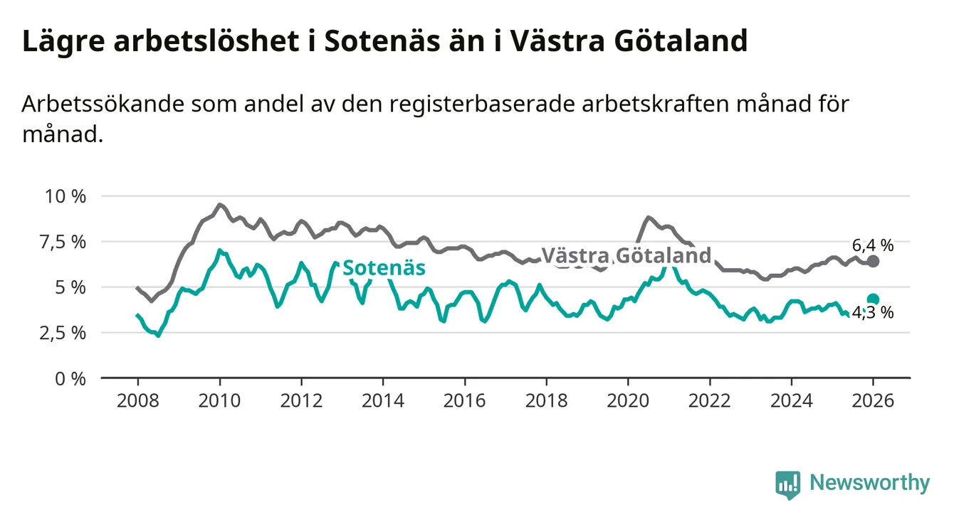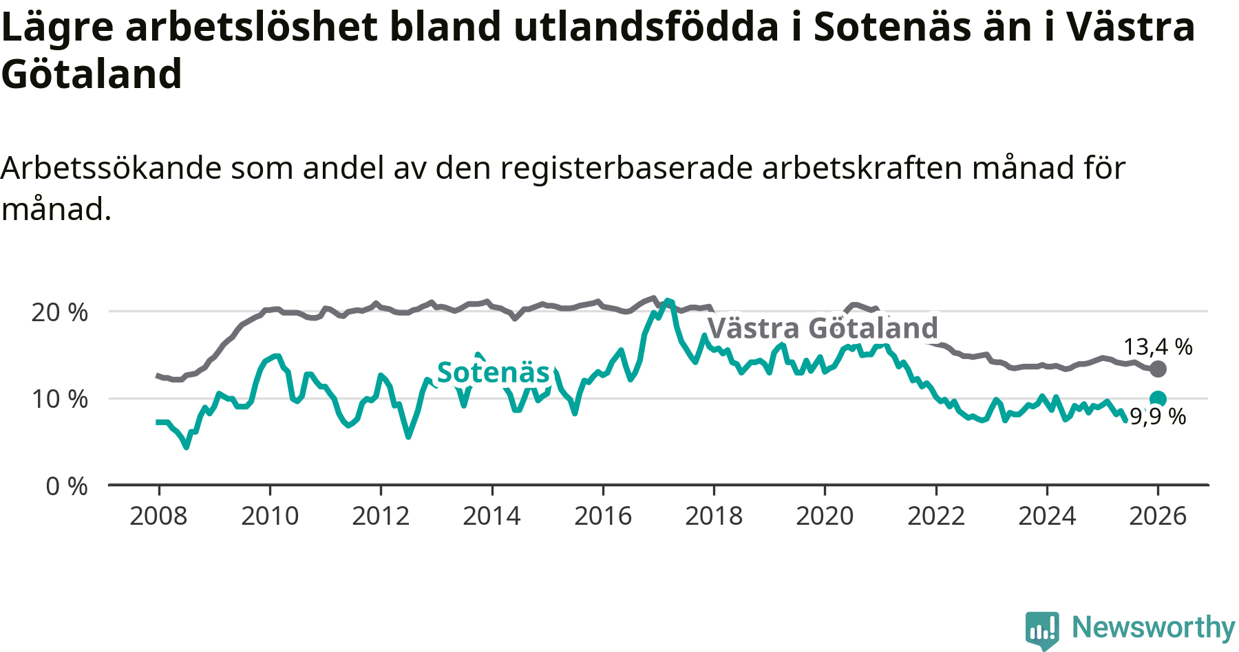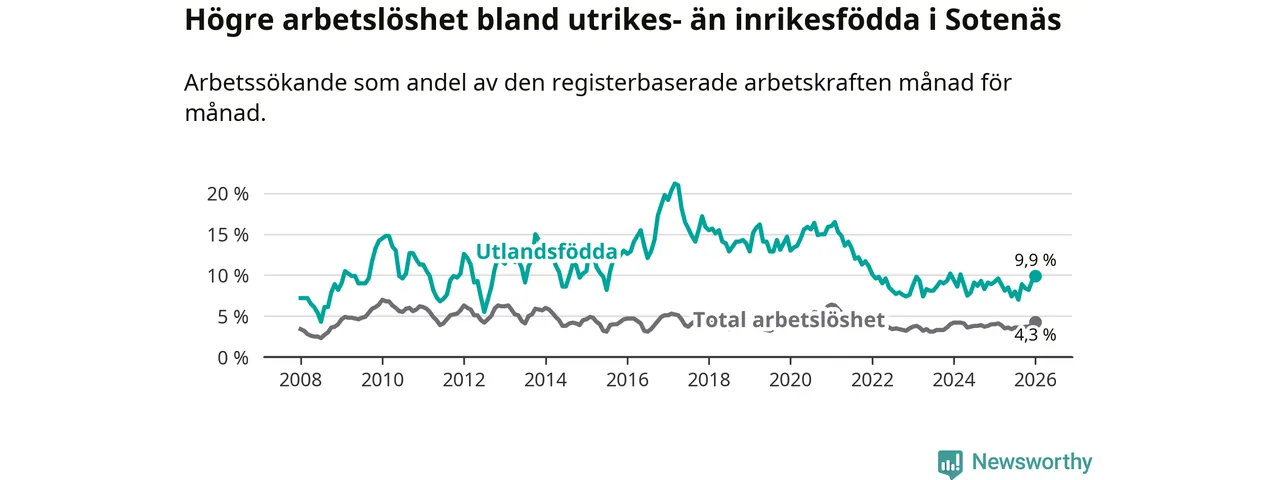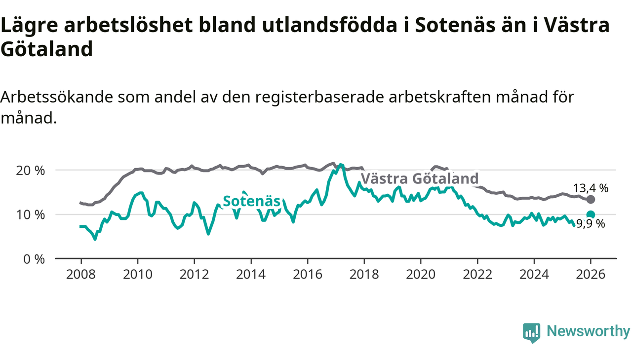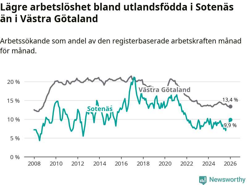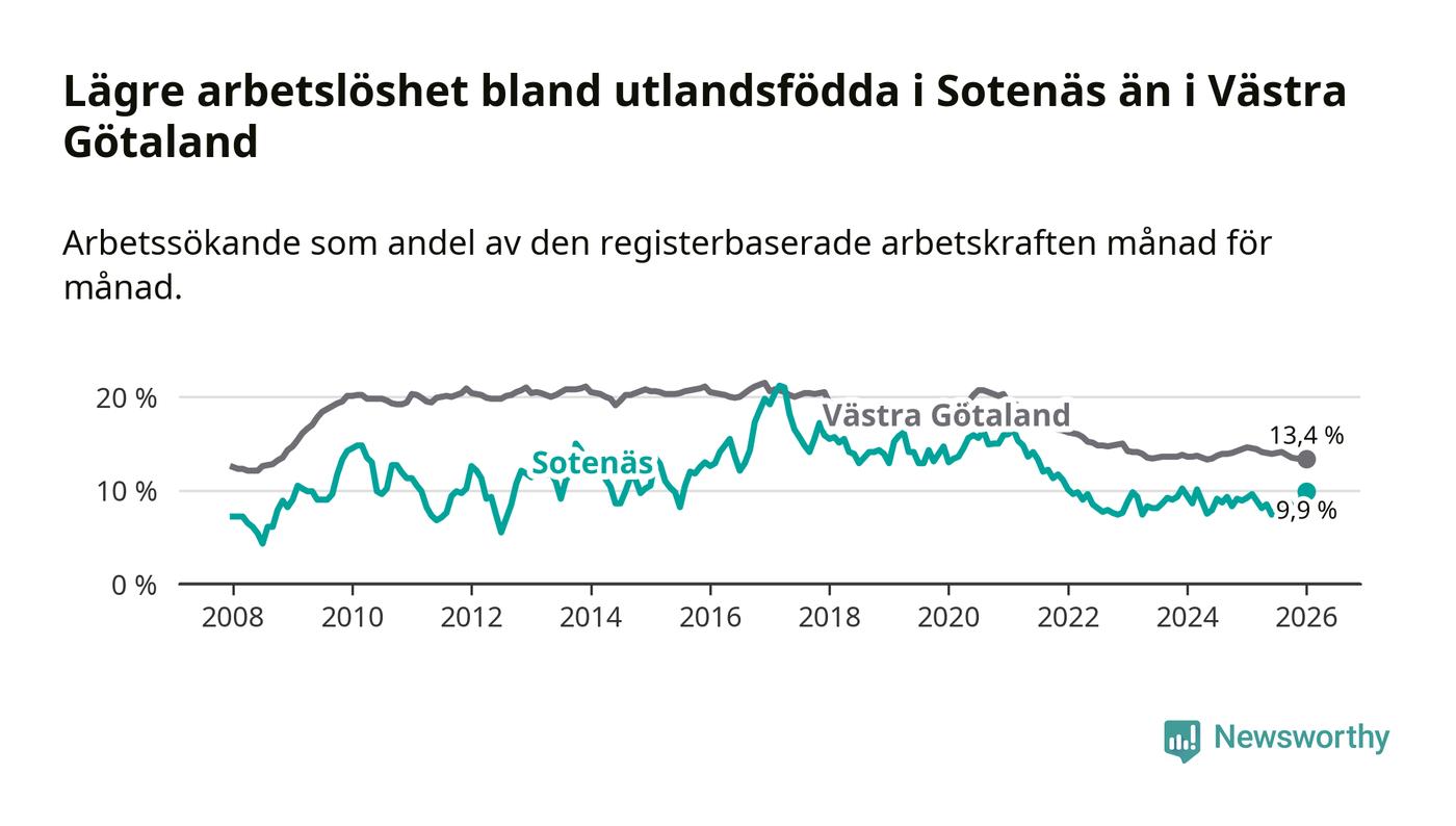 Medan arbetslösheten bland utlandsfödda alltså ökar i Sotenäs så minskar den i Västra Götaland. Jämfört med januari förra året har andelen arbetslösa utlandsfödda i länet minskat med 1,2 procentenheter (till 13,4 procent). Trots den senaste uppgången har Sotenäs med andra ord fortfarande lägre arbetslöshet bland utlandsfödda än Västra Götaland.