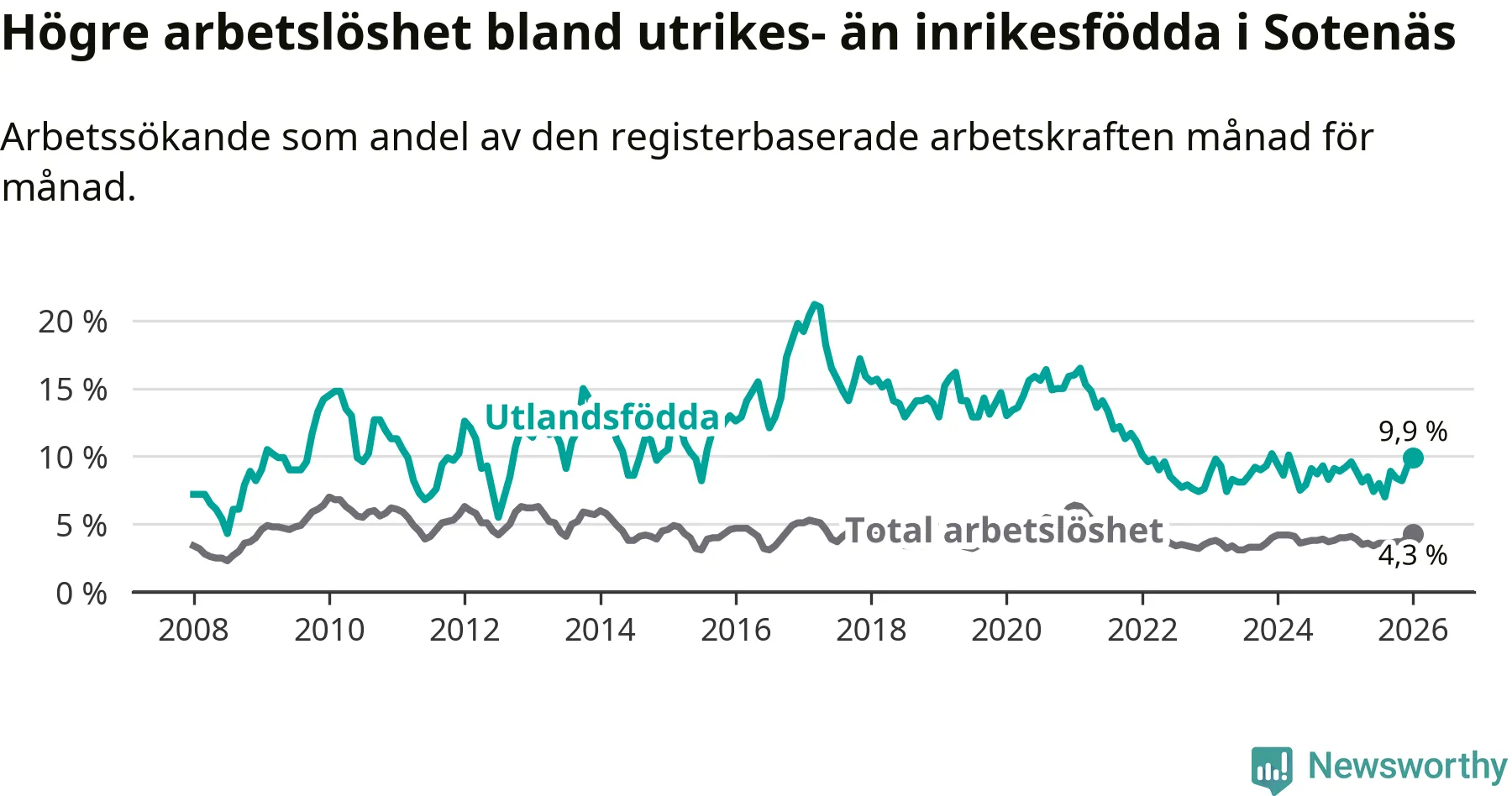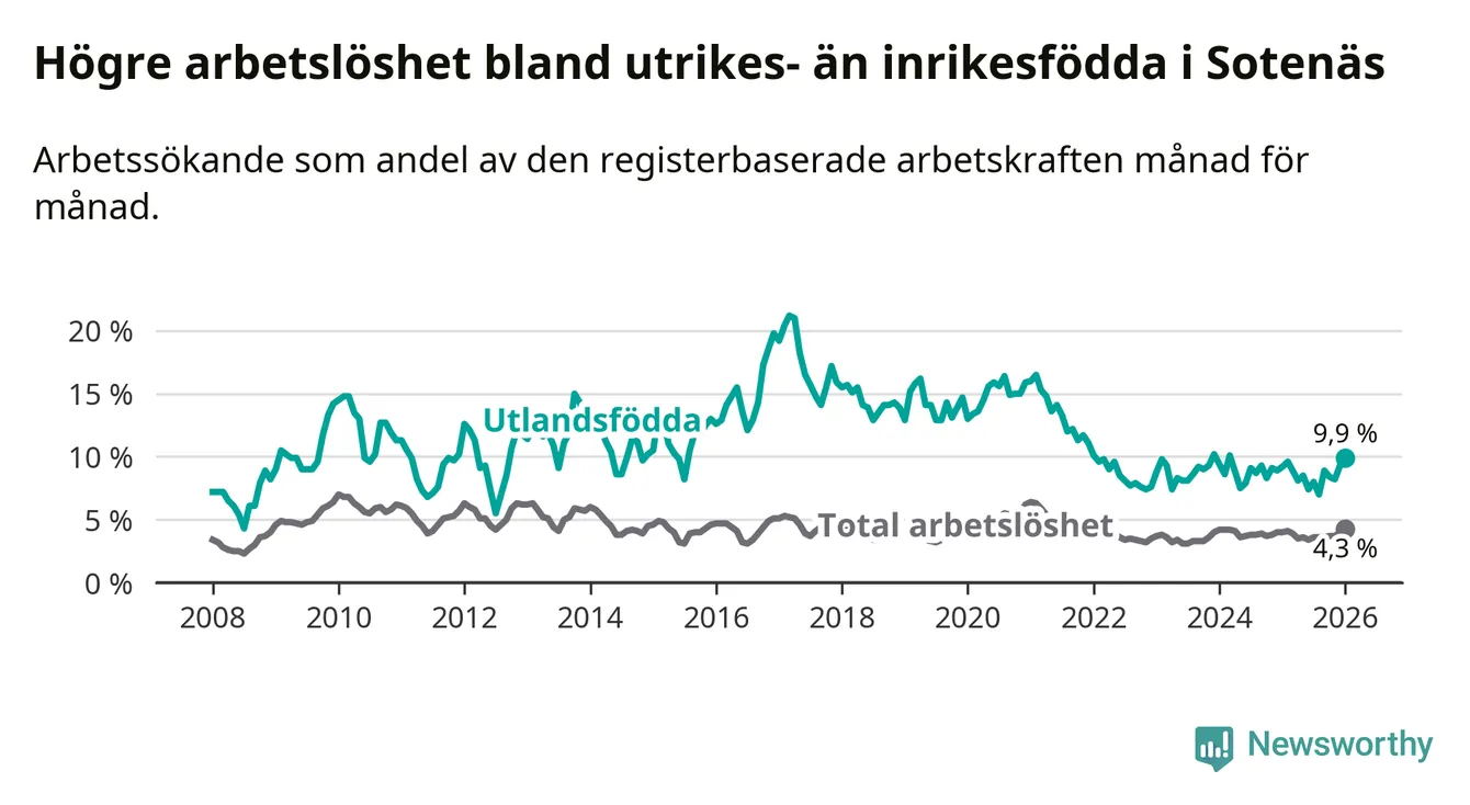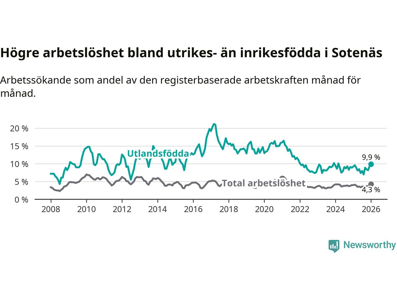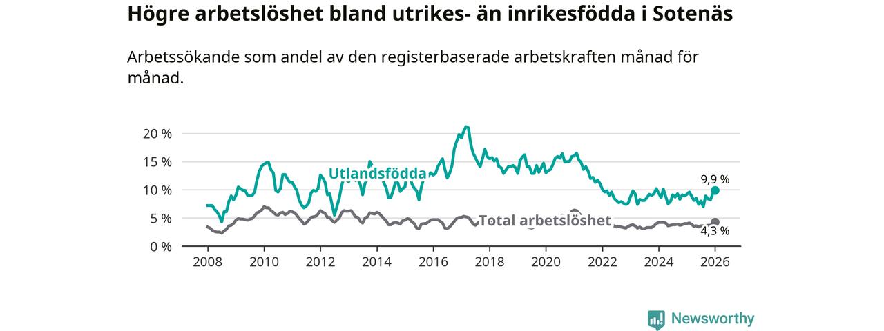 Arbetslösheten bland utlandsfödda var 9,9 procent i Sotenäs under januari månad, motsvarande 53 av 535 personer. Det är 0,7 procentenheter fler än vid samma tidpunkt i fjol (+3 om man räknar personer).