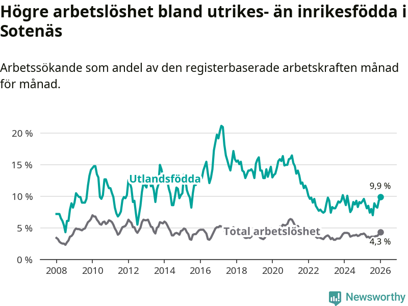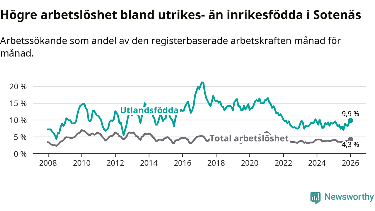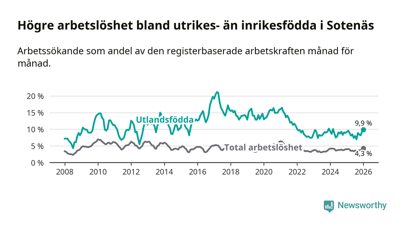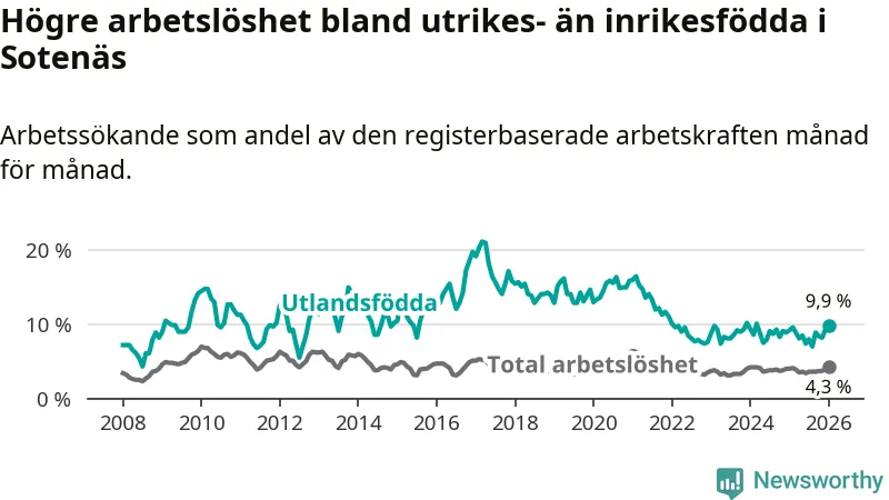 Arbetslösheten bland utlandsfödda var 9,9 procent i Sotenäs under januari månad, motsvarande 53 av 535 personer. Det är 0,7 procentenheter fler än vid samma tidpunkt i fjol (+3 om man räknar personer).