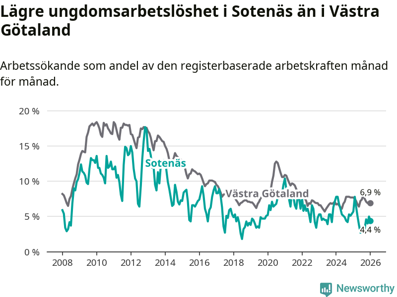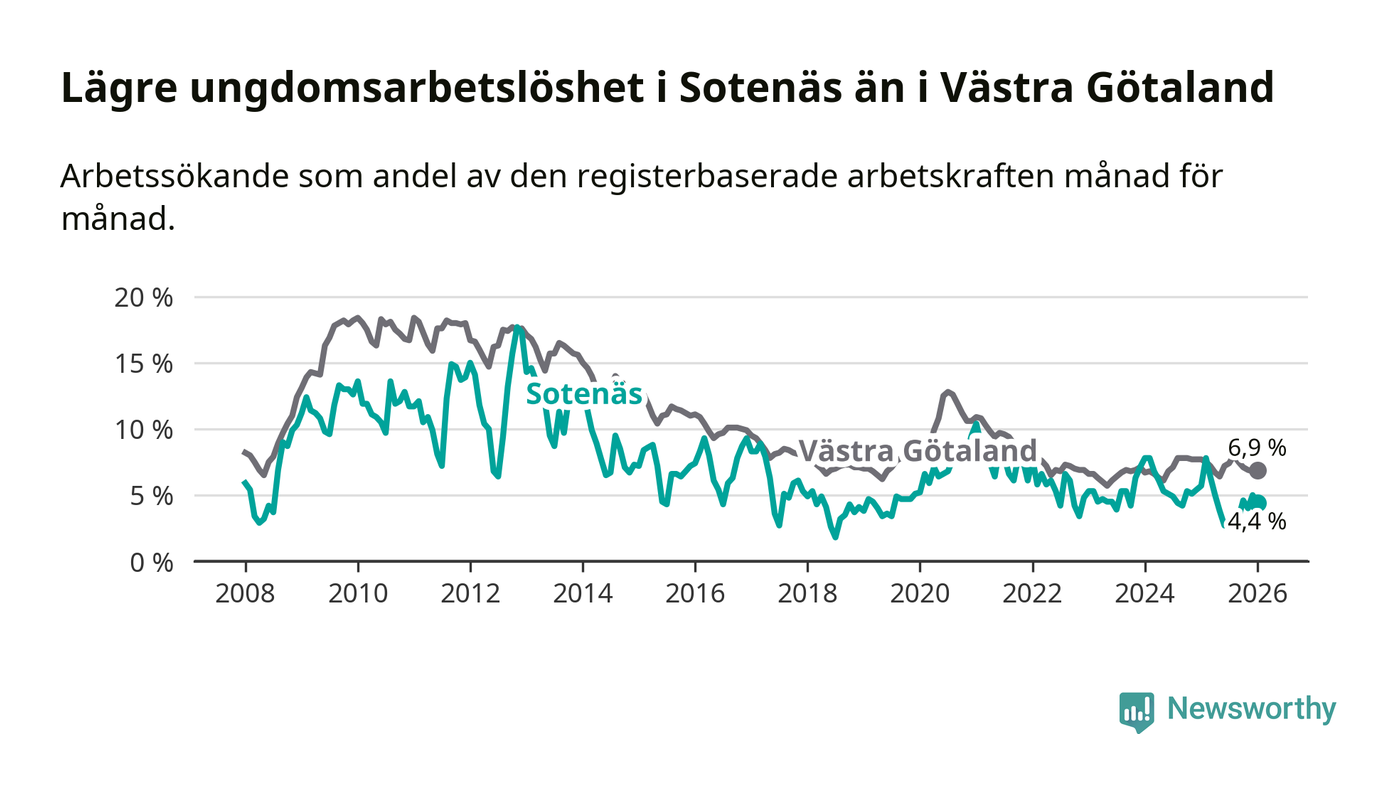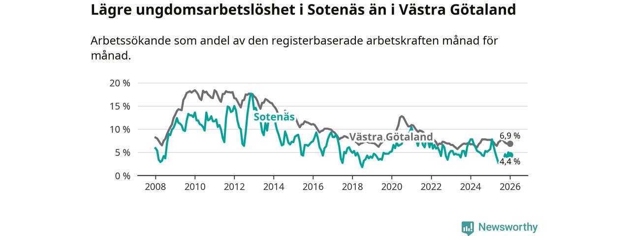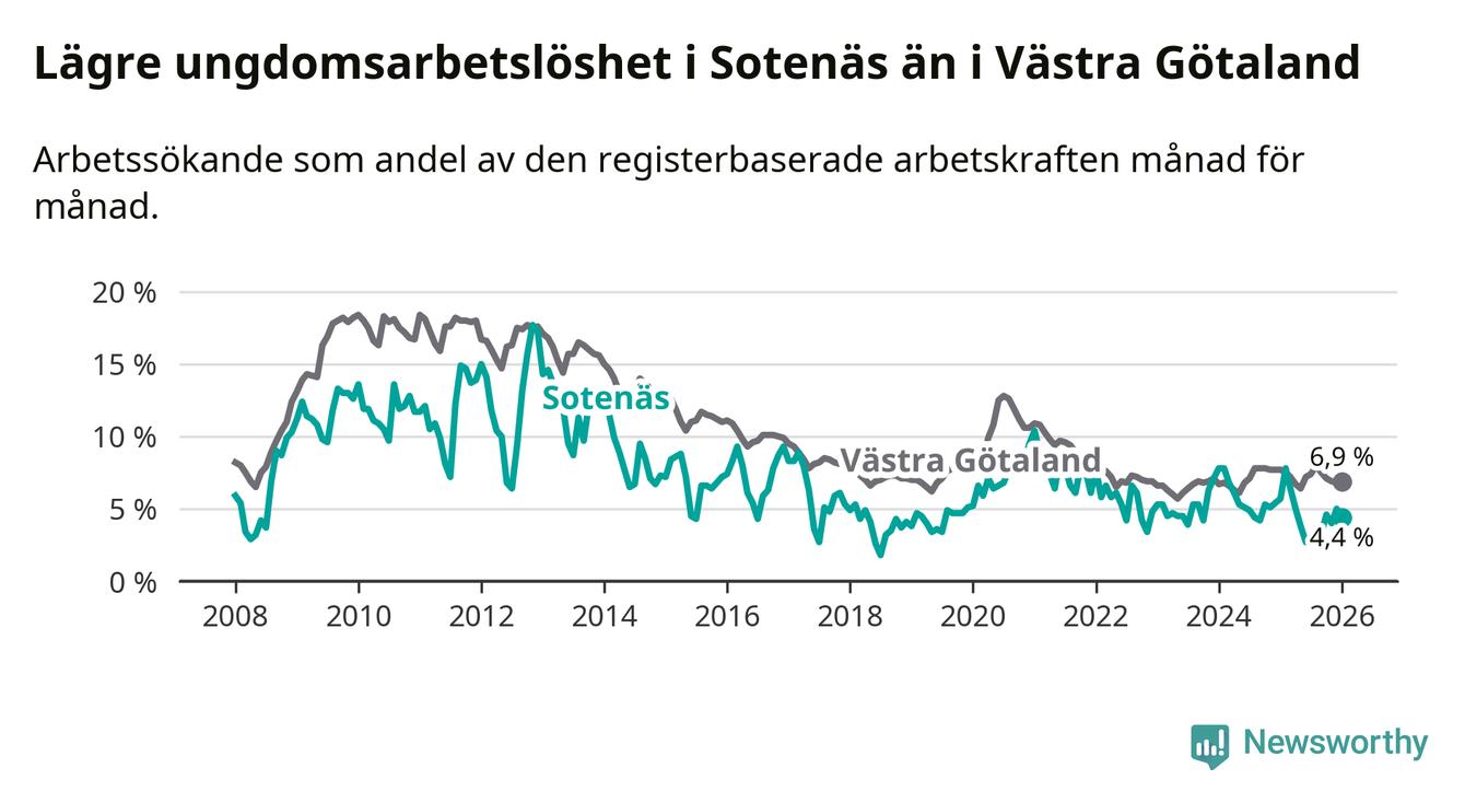 Graf: Arbetslöshet bland unga i Sotenäs kommun och Västra Götalands län