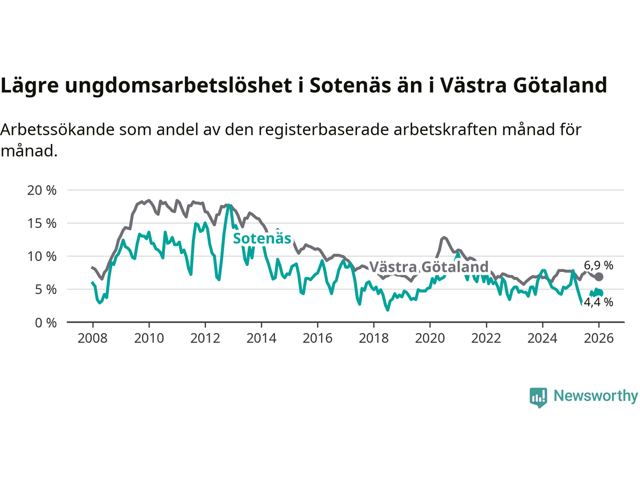 Precis som den totala arbetslösheten ligger ungdomsarbetslösheten i Sotenäs lägre än i Västra Götaland som helhet. Skillnaden mellan kommunen och länet är 2,5 procentenheter.