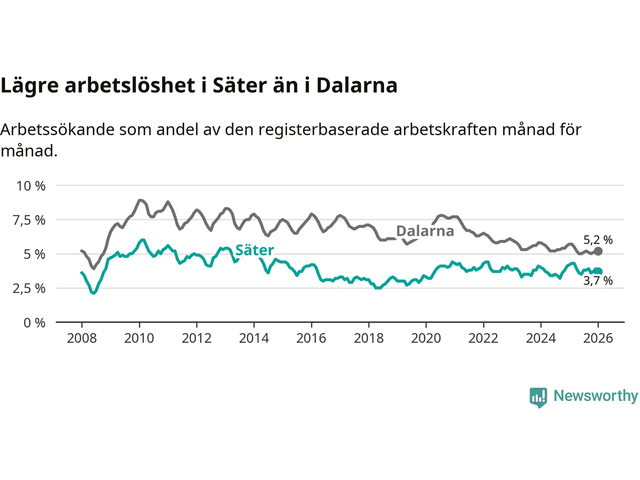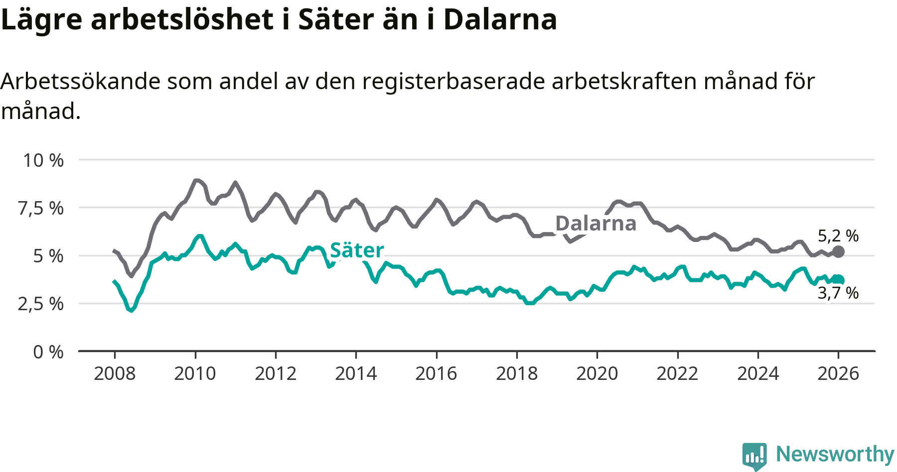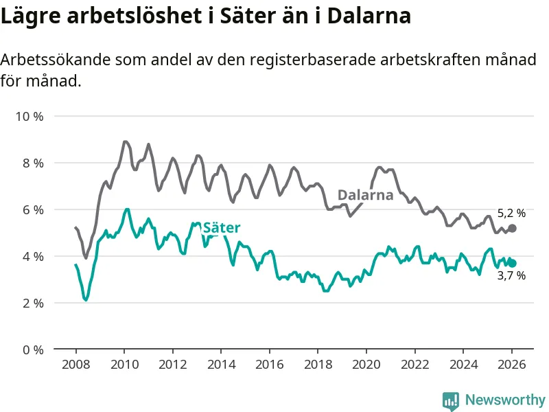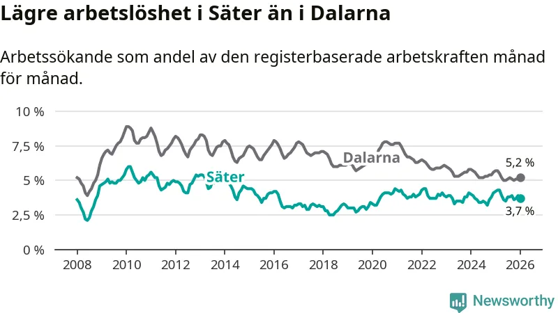 Säter hade redan tidigare lägre arbetslöshet än snittet i hela Dalarnas län och nu växer klyftan (3,7 procent i kommunen, jämfört med 5,2 procent i hela länet). Mora har den lägsta arbetslösheten i länet (3,4 procent), medan Avesta har den högsta (7,5 procent). För att Säter skulle komma ner i samma arbetslöshetsnivå som Mora skulle 16 personer behöva sysselsättas.