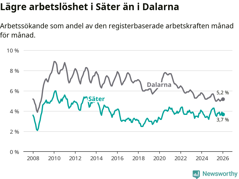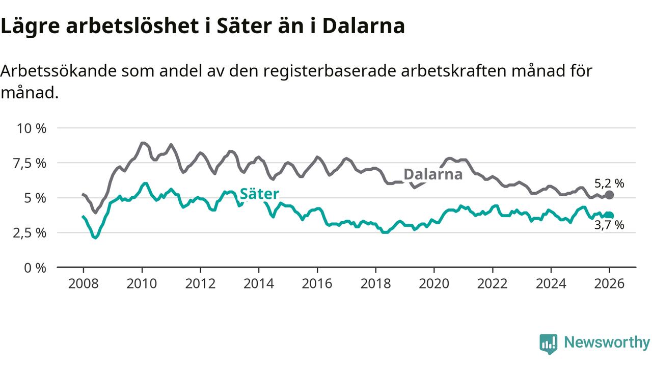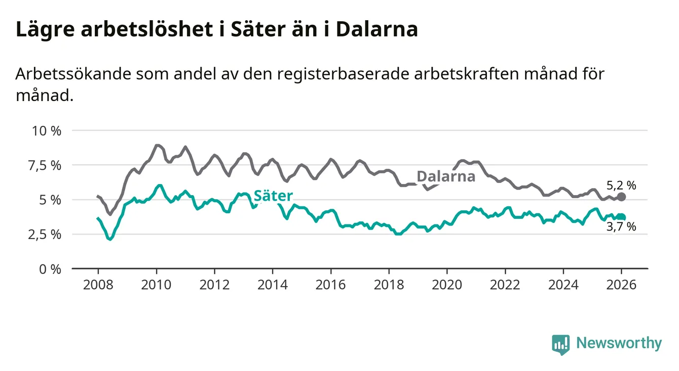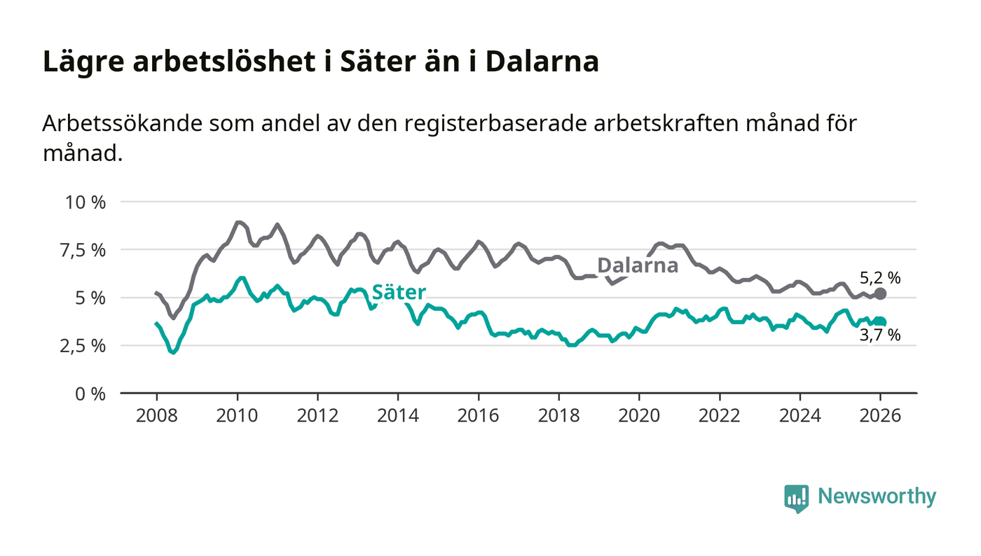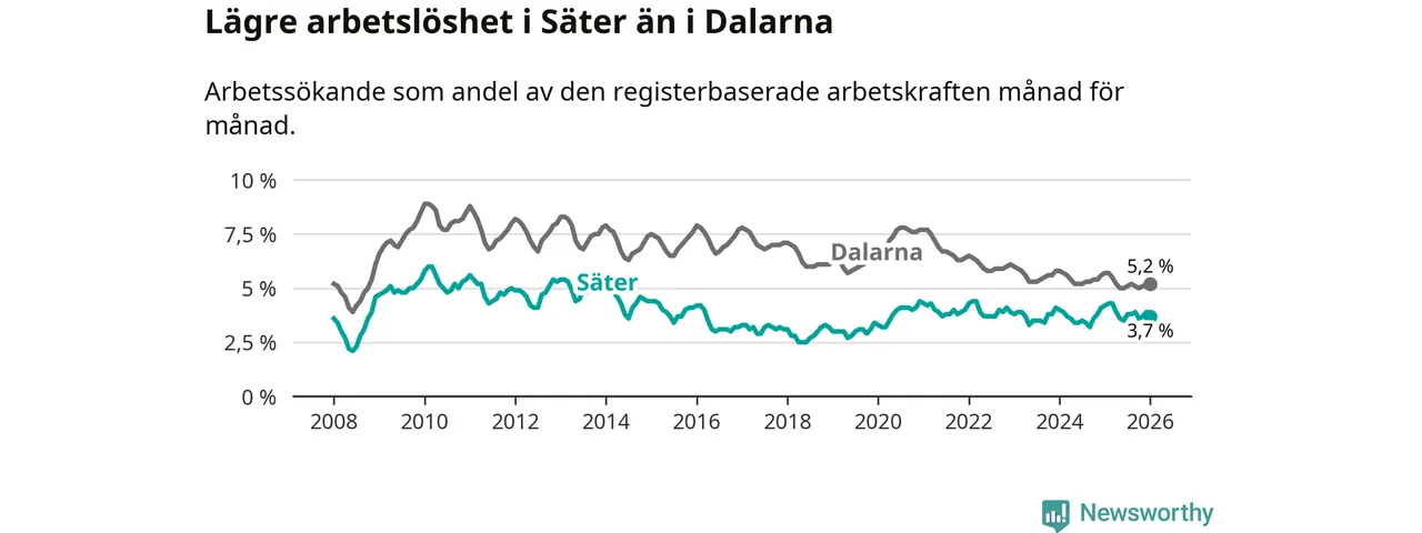 Under januari månad rapporterade Säters kommun en total arbetslöshet på 3,7 procent. Det är en minskning jämfört med samma tidpunkt i fjol (−0,5 procentenheter). Även i Dalarnas län sjunker arbetslösheten .