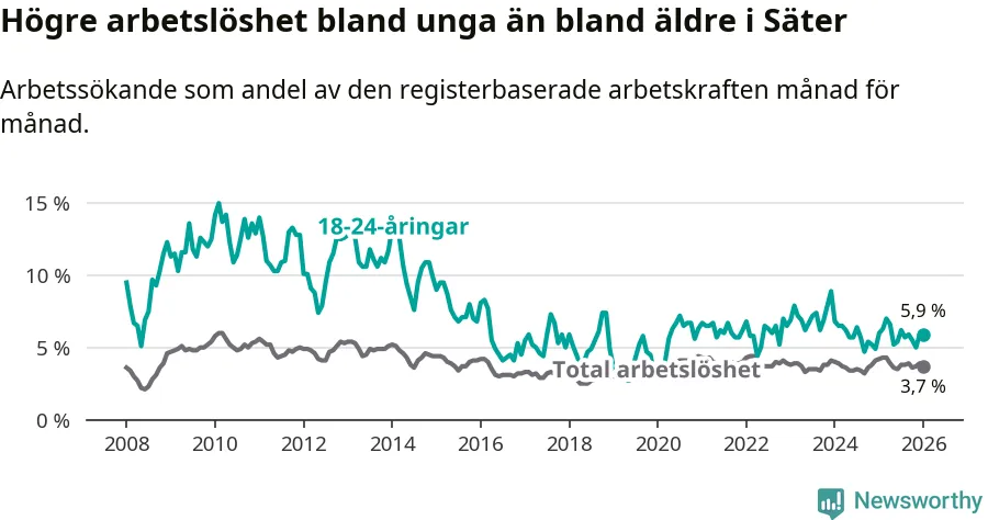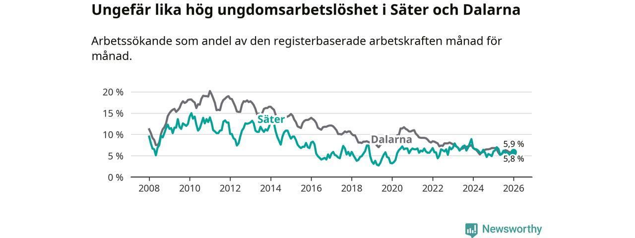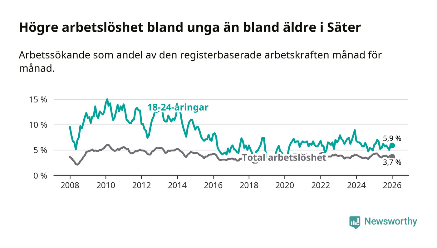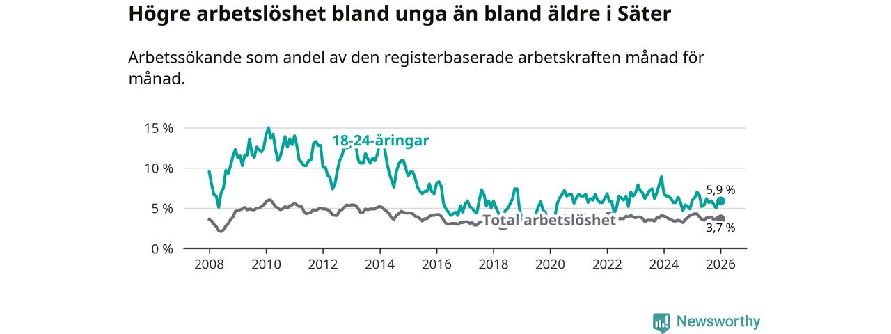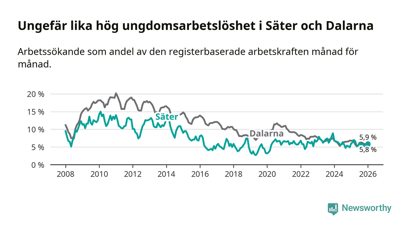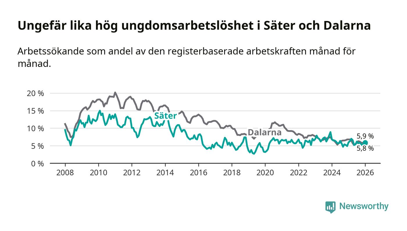 Medan Säter har lägre total arbetslöshet än Dalarna, ligger ungdomsarbetslösheten på i stort sett samma nivå.