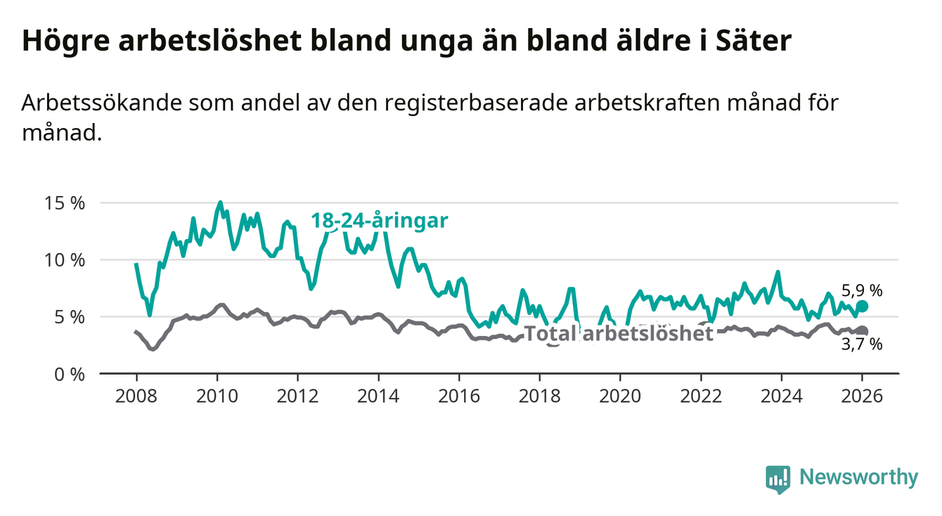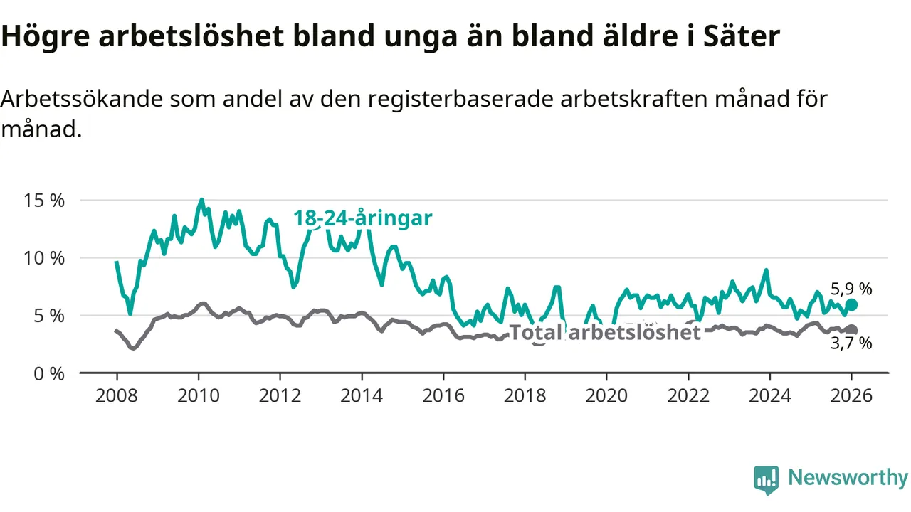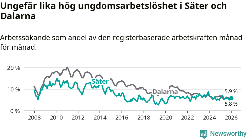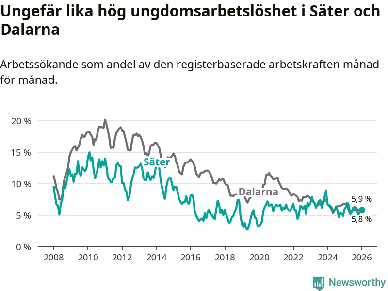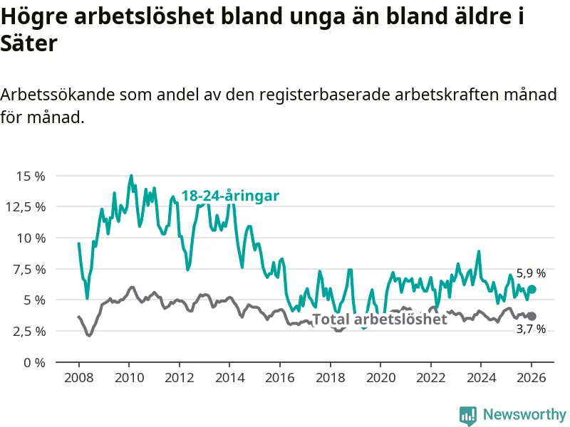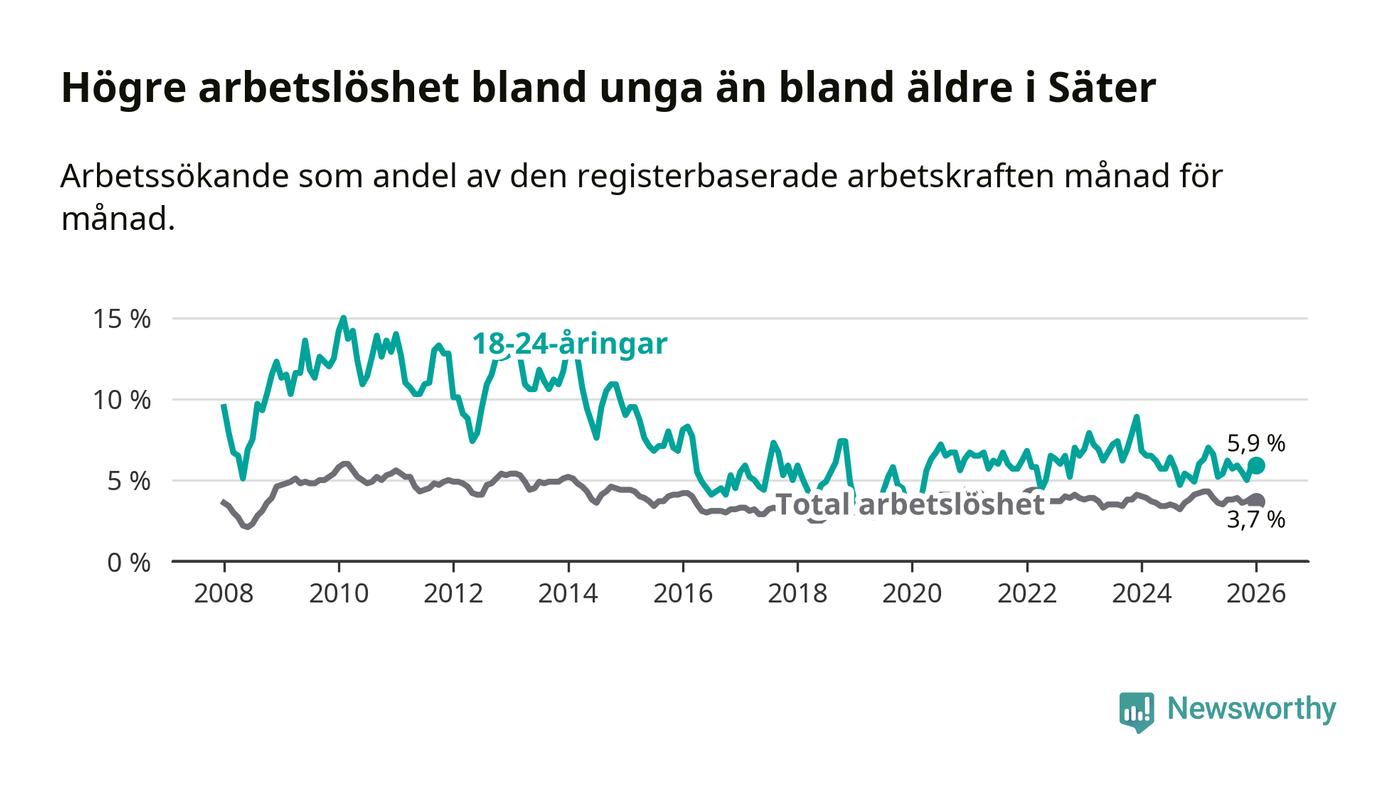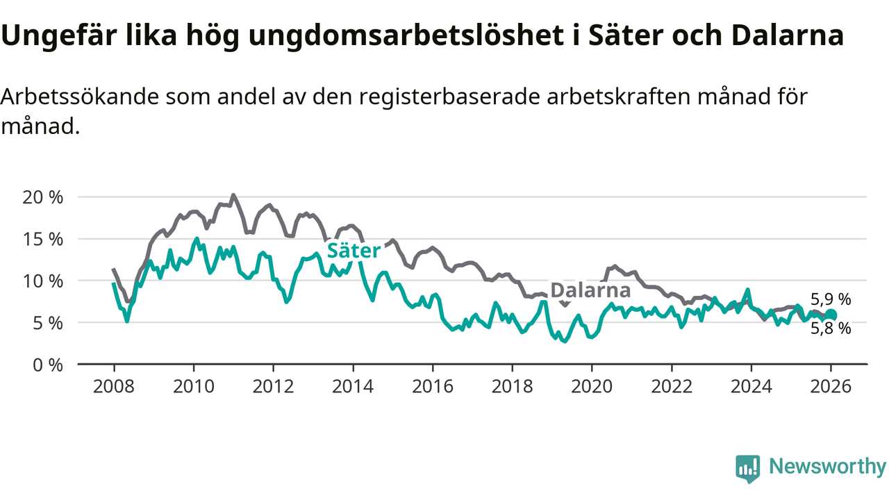 Medan Säter har lägre total arbetslöshet än Dalarna, ligger ungdomsarbetslösheten på i stort sett samma nivå.