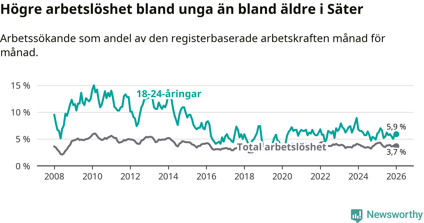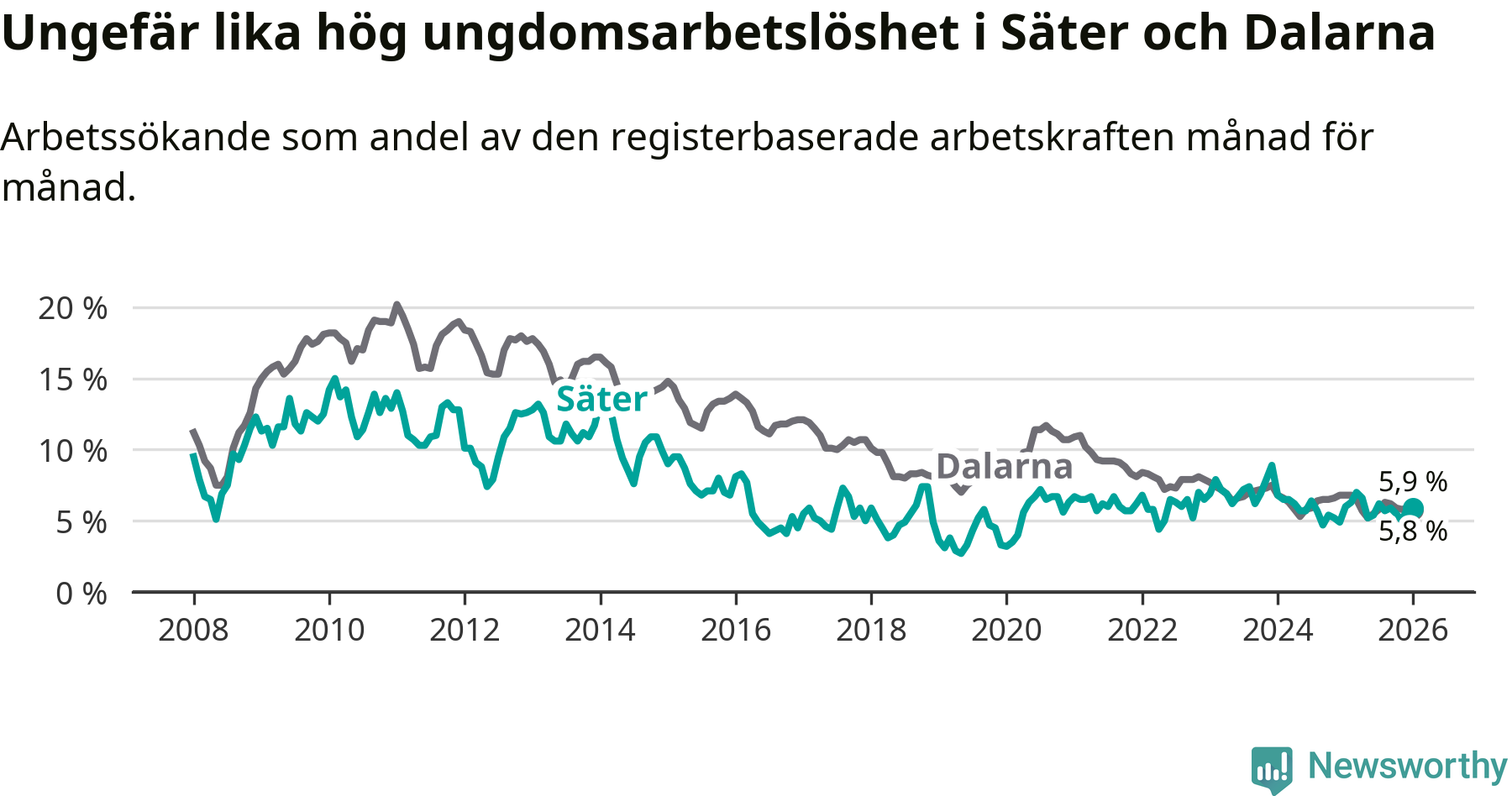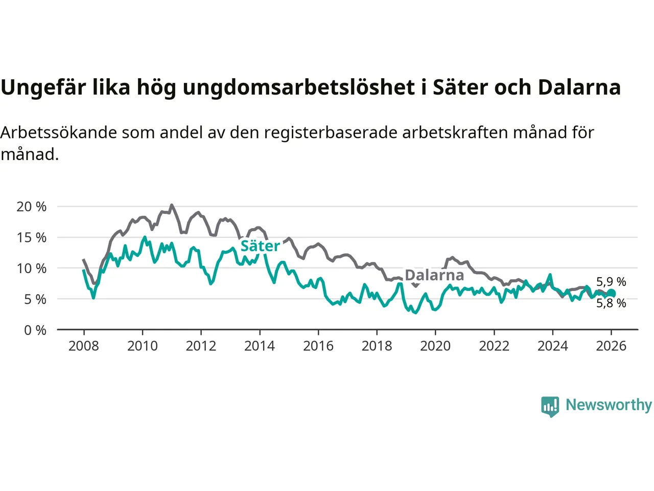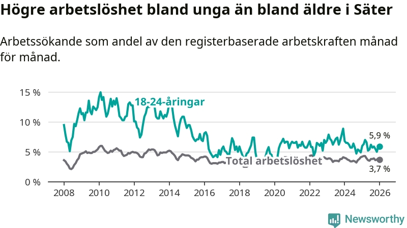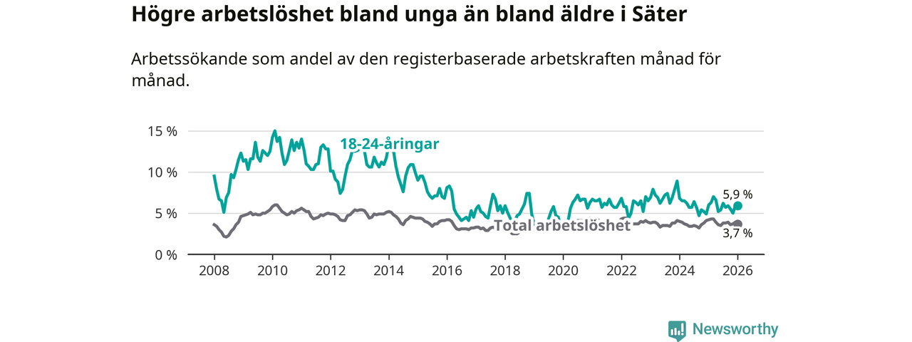 Medan Säter har lägre total arbetslöshet än Dalarna, ligger ungdomsarbetslösheten på i stort sett samma nivå.