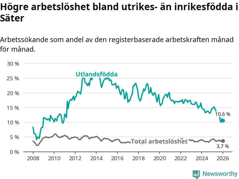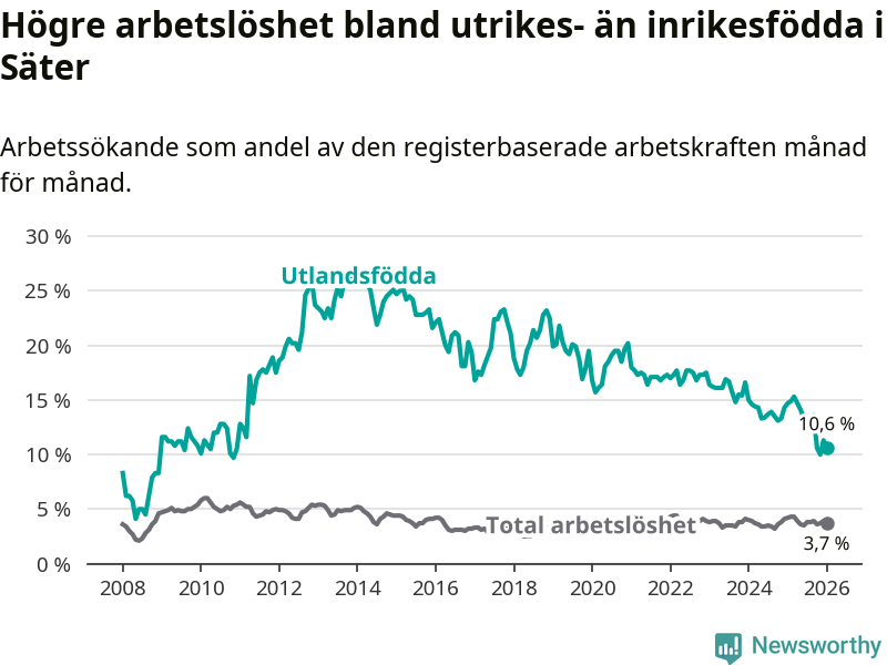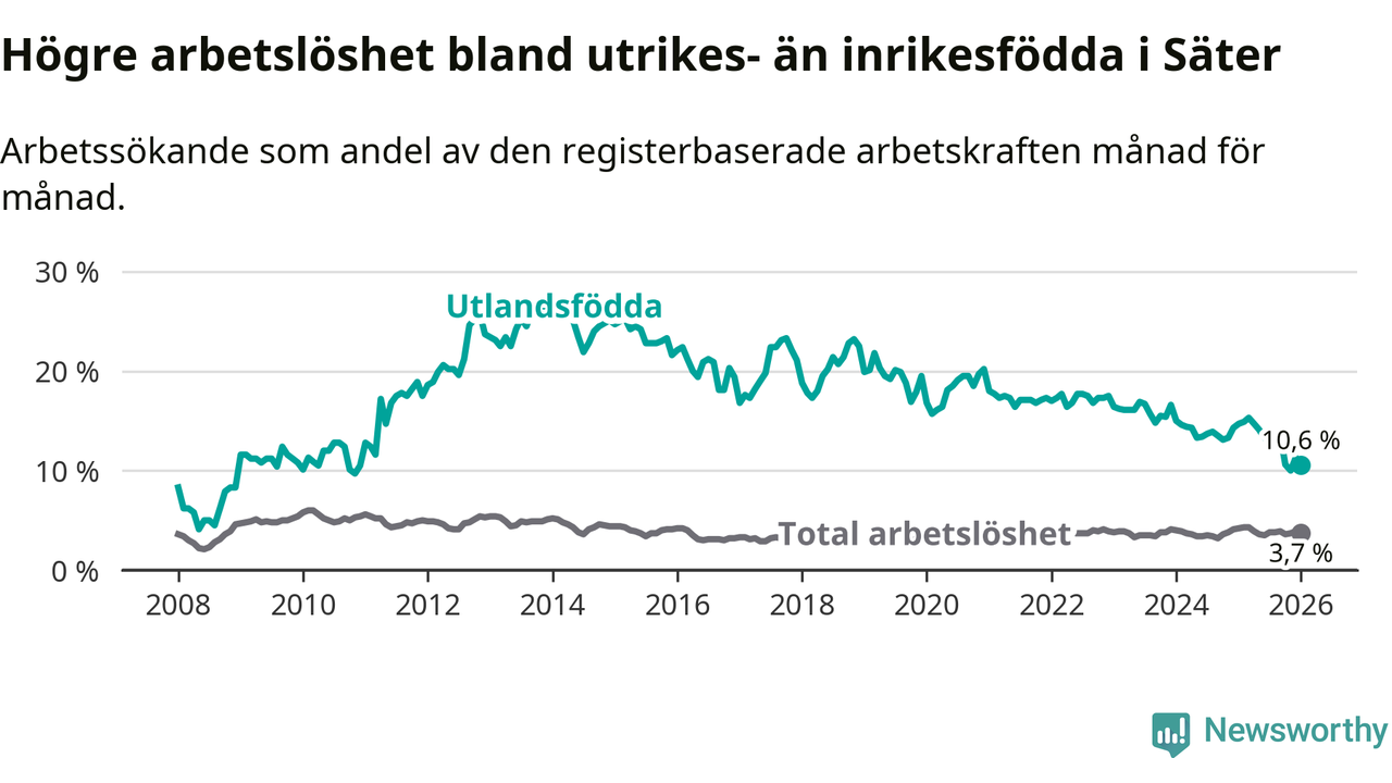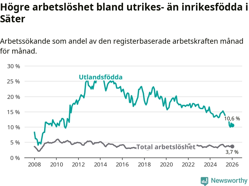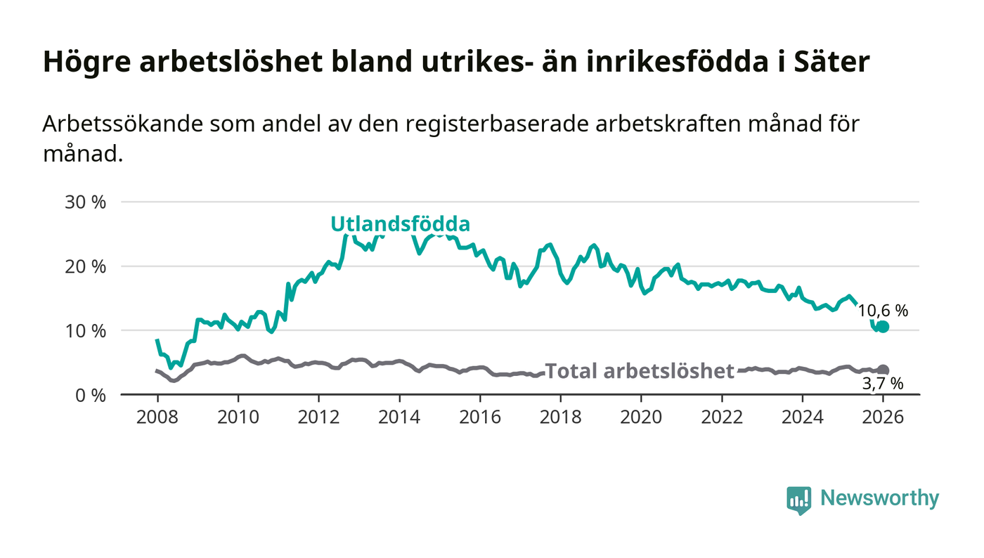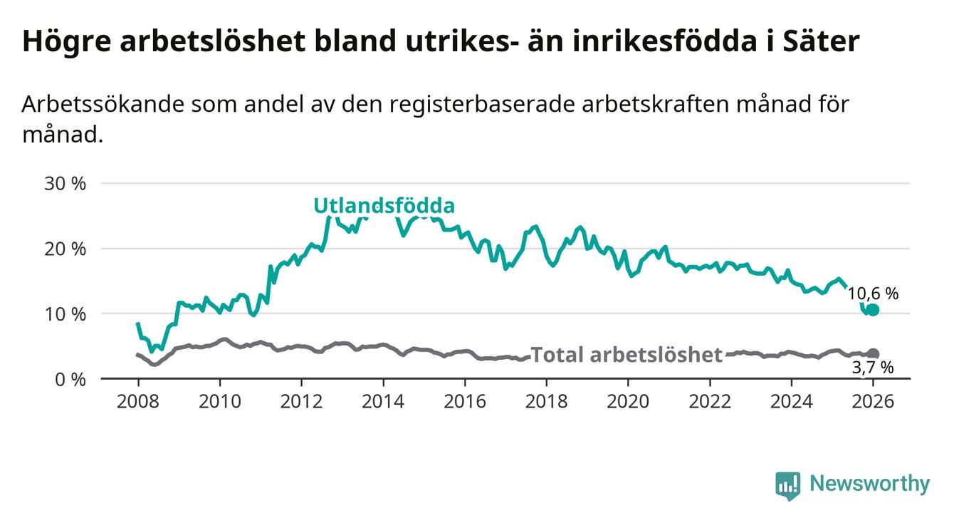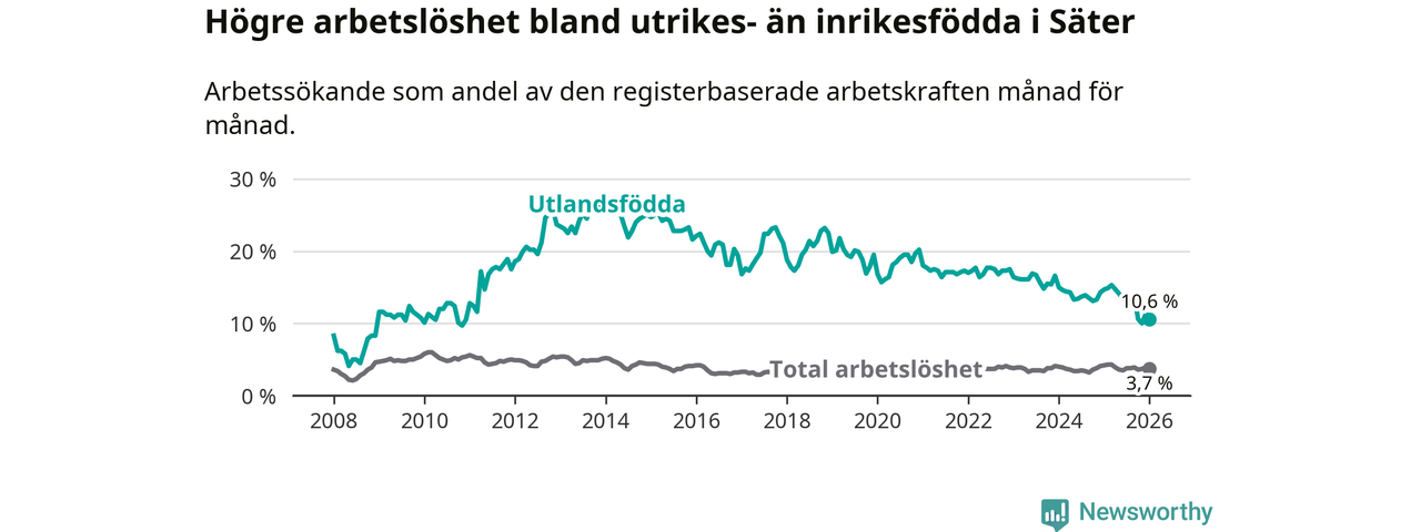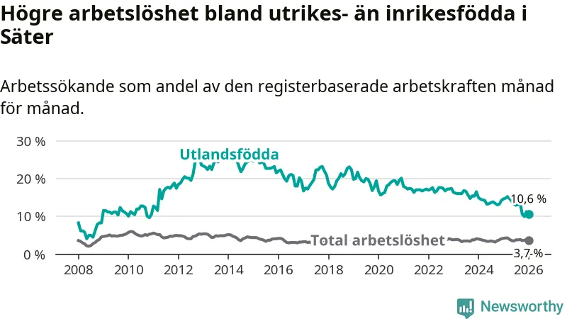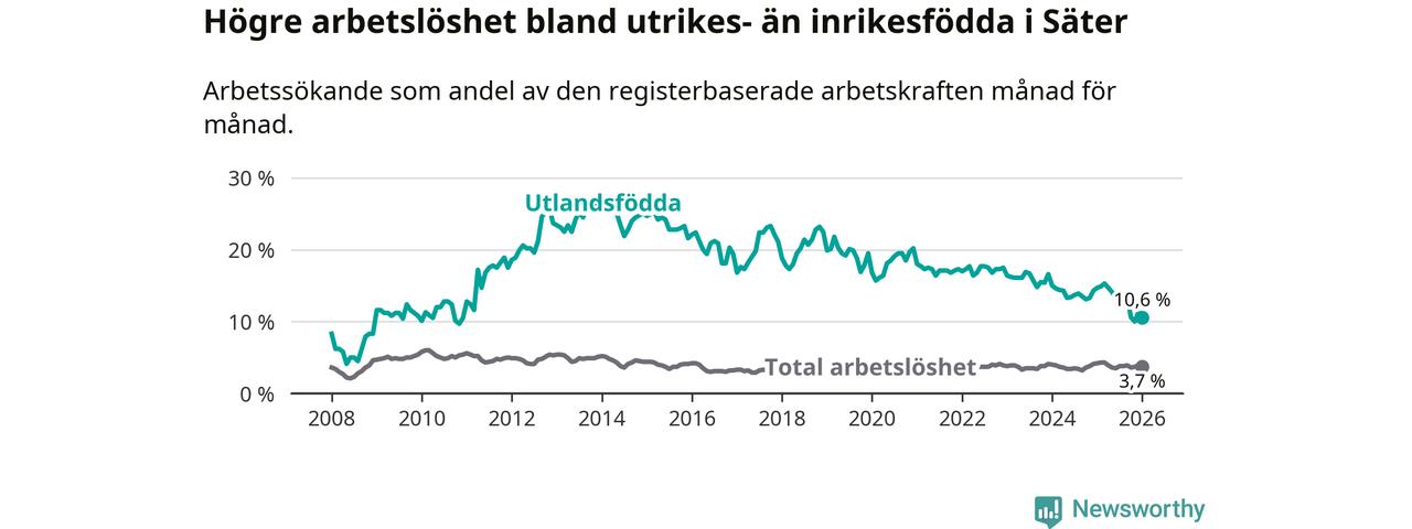 Arbetslösheten bland utlandsfödda var 10,6 procent i Säter under januari månad, motsvarande 55 av 519 personer. Det är 4,1 procentenheter färre än vid samma tidpunkt i fjol (−19 om man räknar personer).