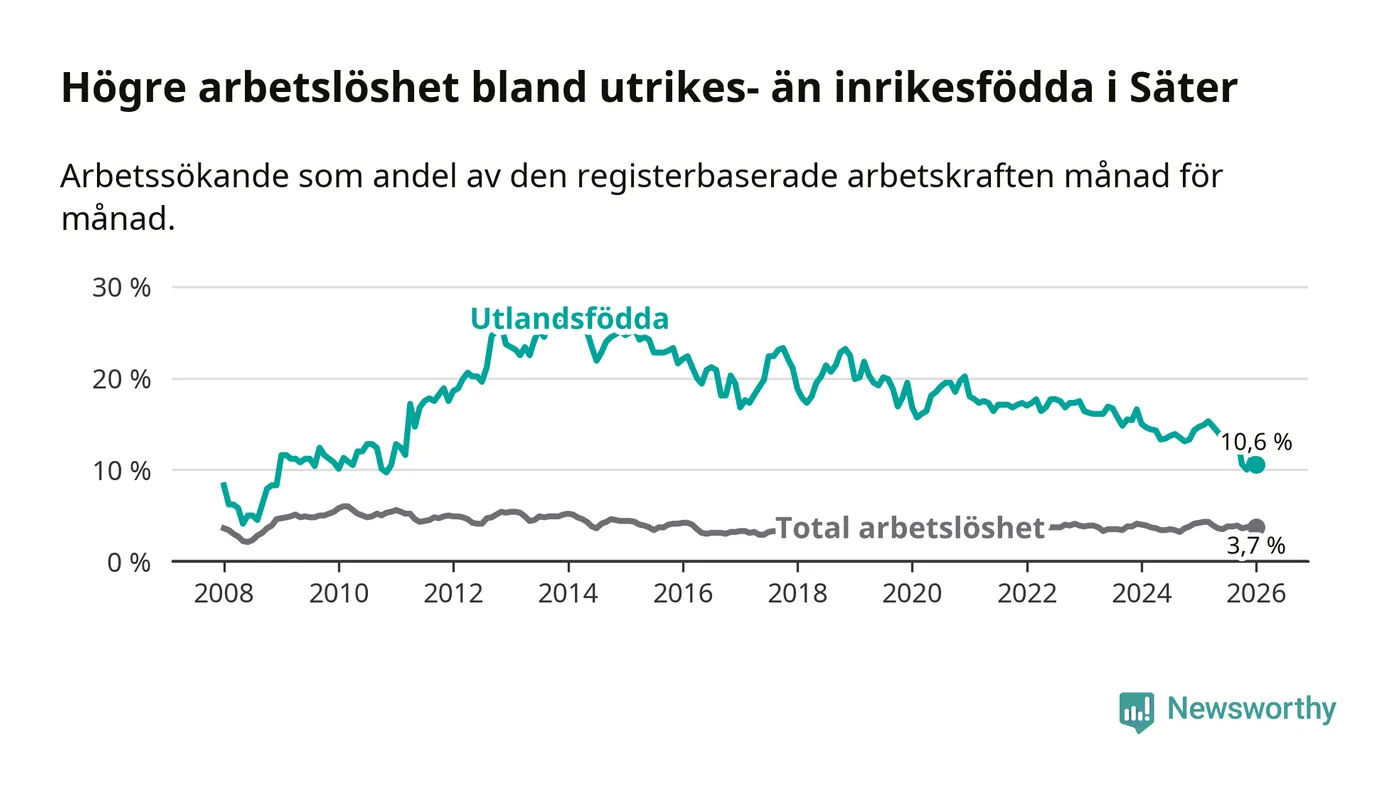 Skillnaden i arbetslöshet mellan utrikesfödda och hela befolkningen är 6,9 procentenheter i Säter. Det är en betydligt mindre skillnad än för ett år sedan (−3,6 procentenheter).