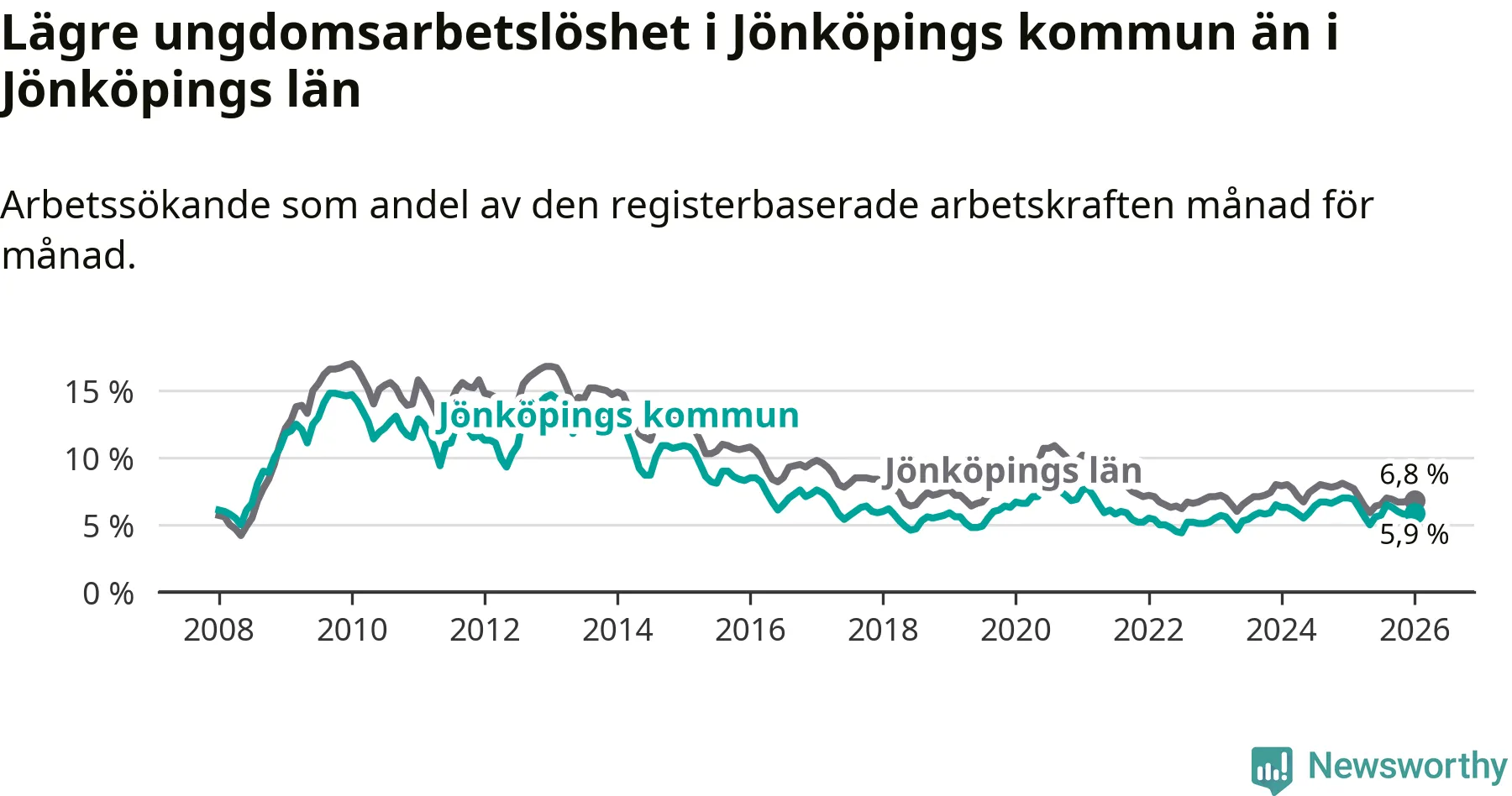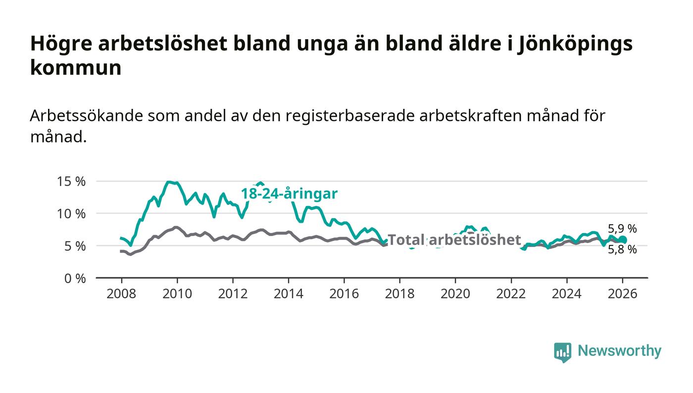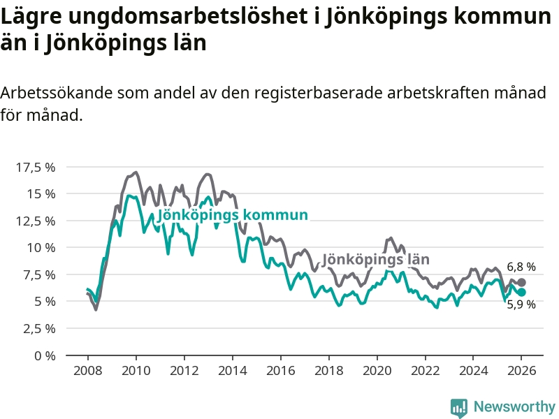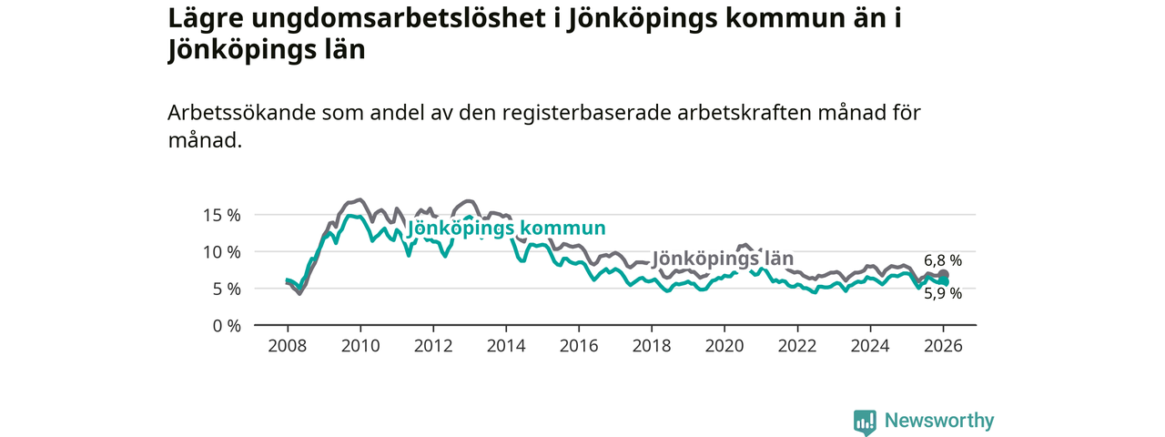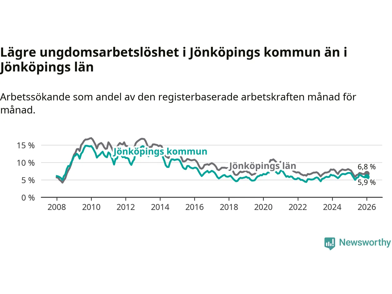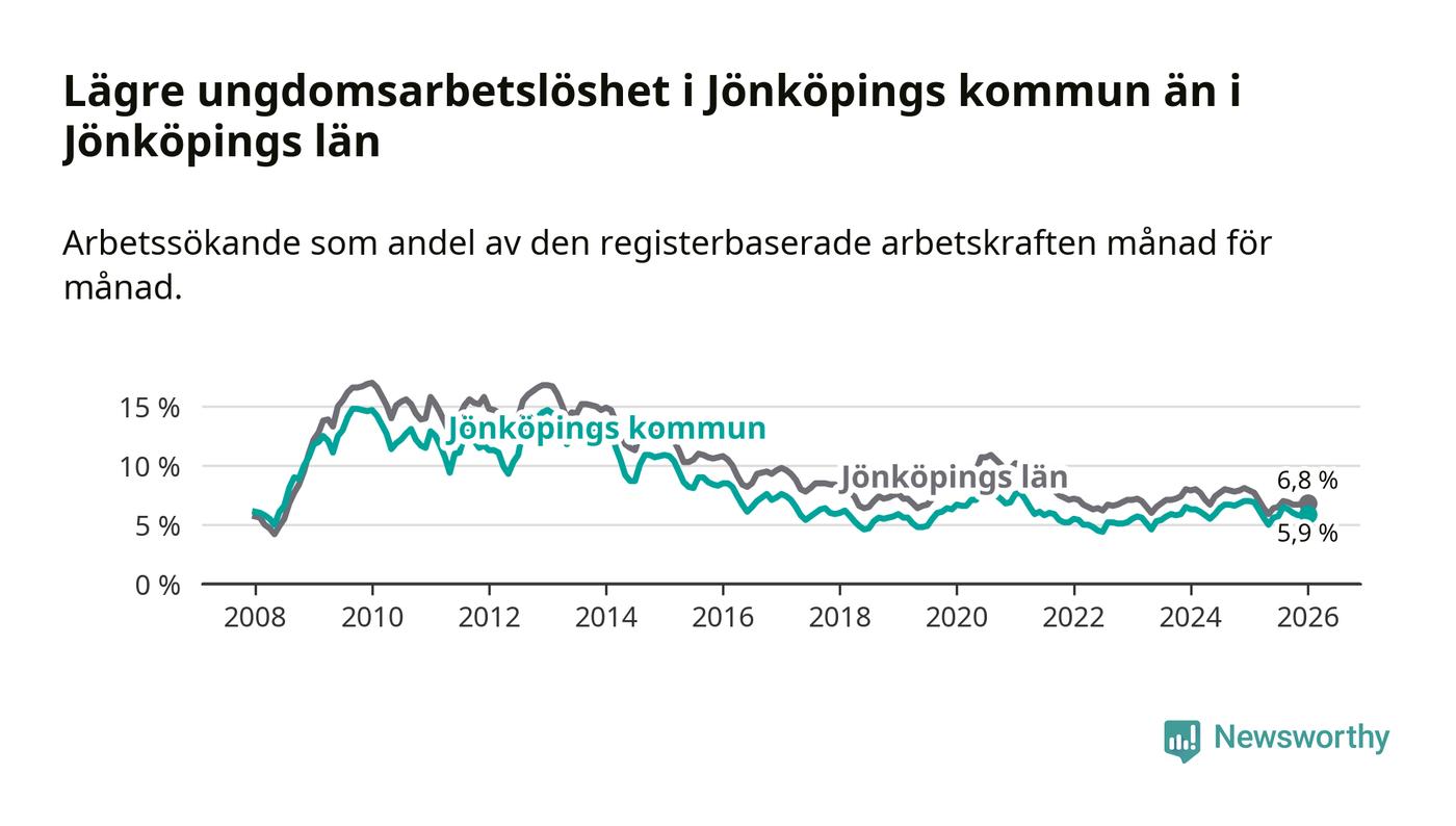 I och med den senaste månadens nedgång har de ungas arbetslöshet i Jönköping sjunkit tio månader i följd (ner från 6,3 procent i mars 2025 till 5,9 procent nu).