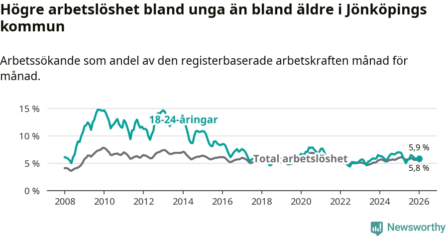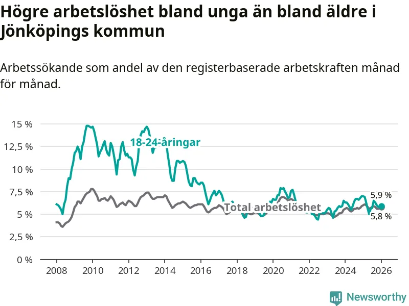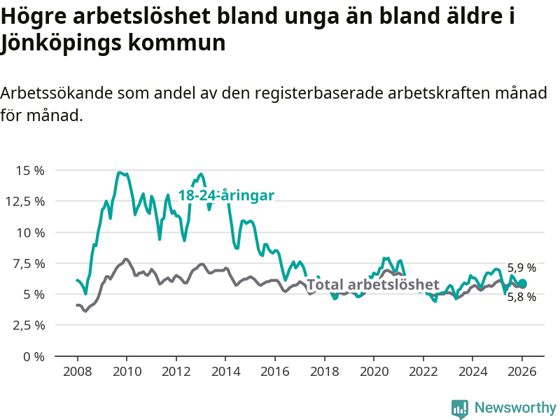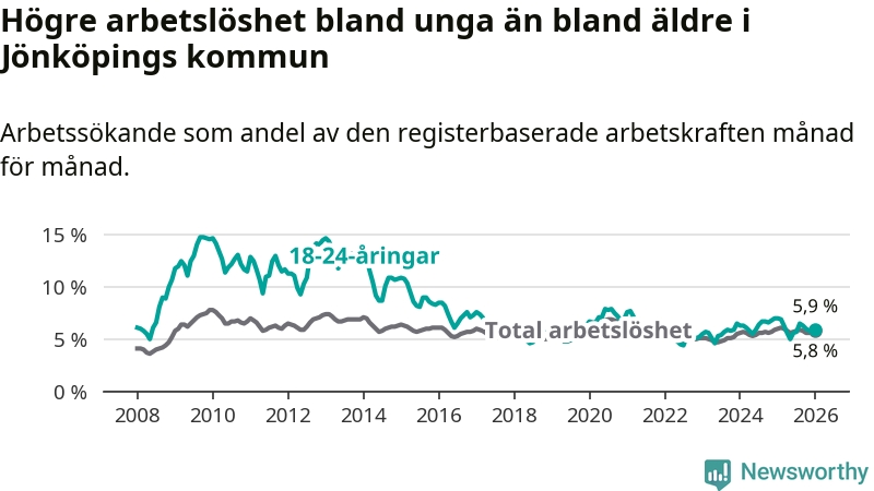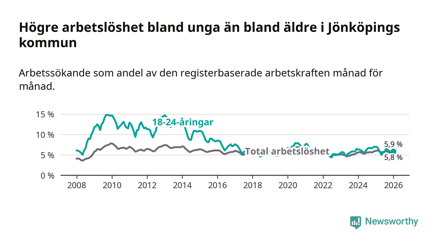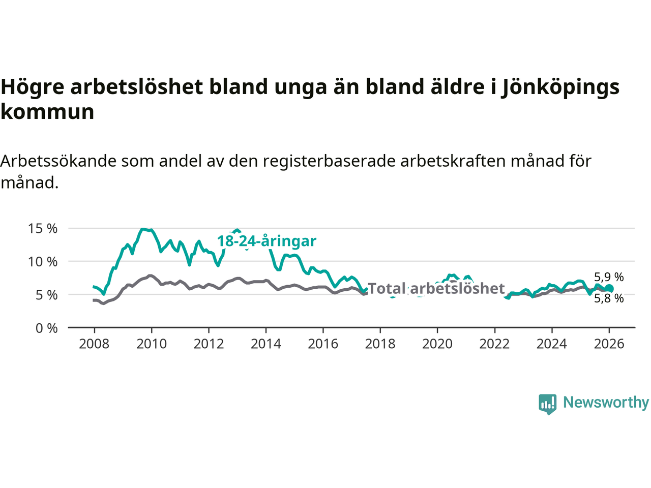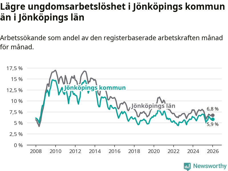 I och med den senaste månadens nedgång har de ungas arbetslöshet i Jönköping sjunkit tio månader i följd (ner från 6,3 procent i mars 2025 till 5,9 procent nu).