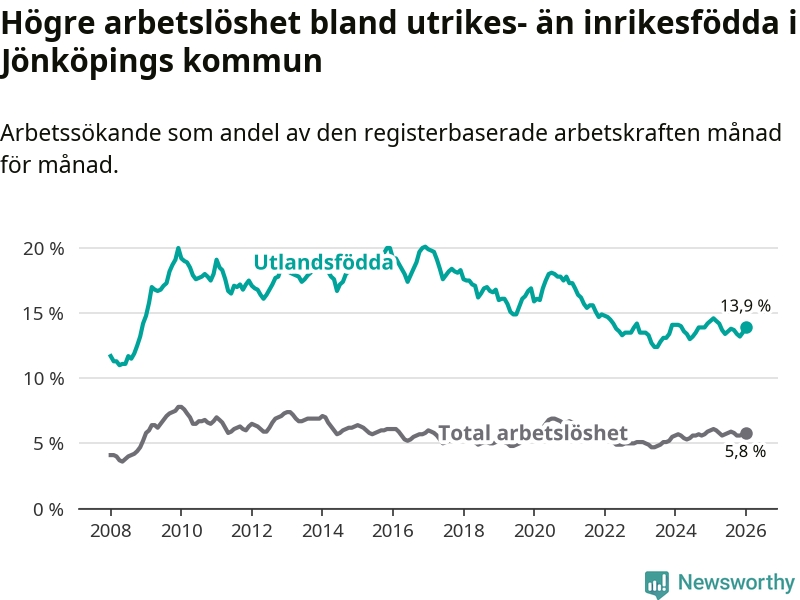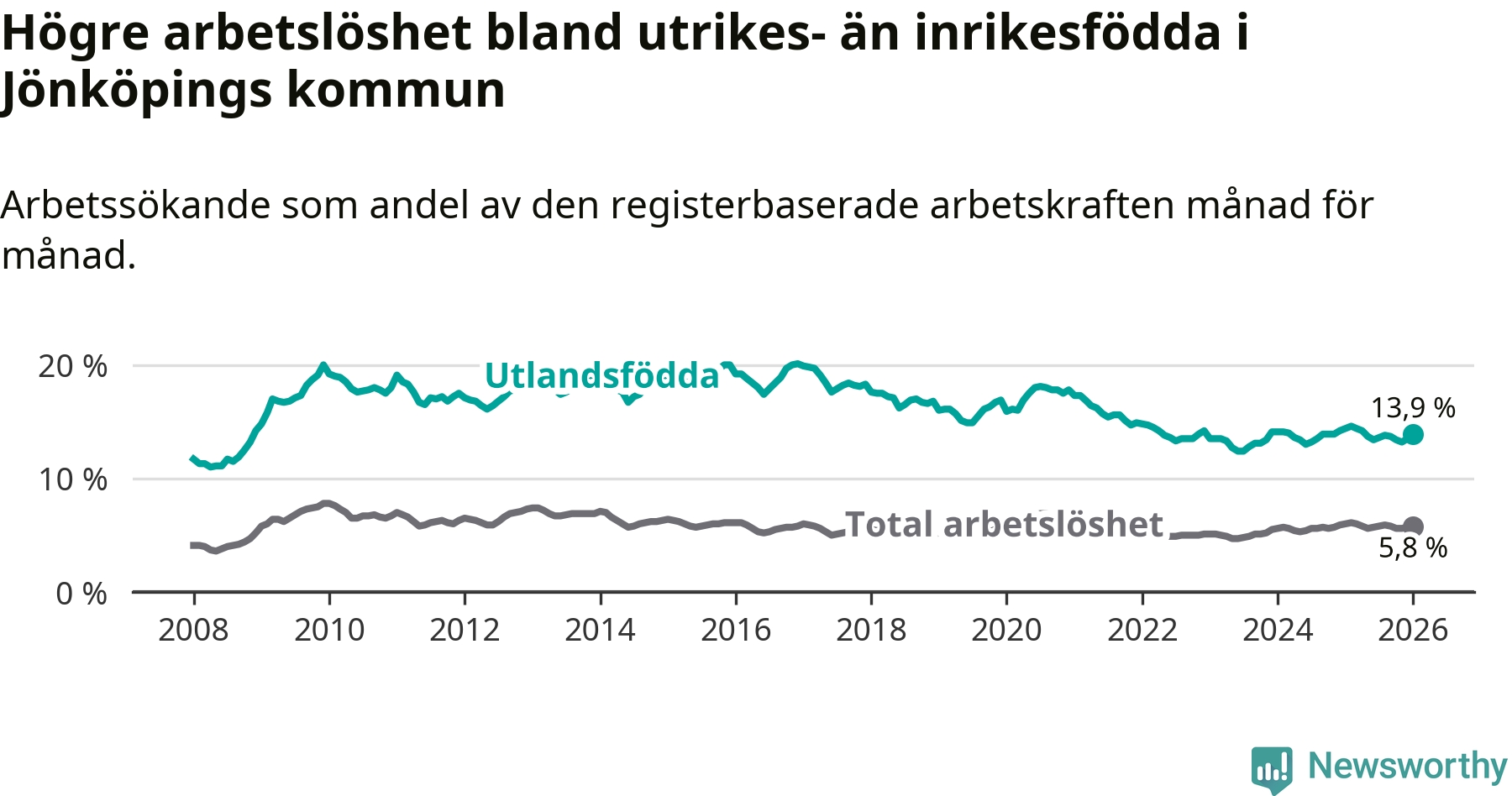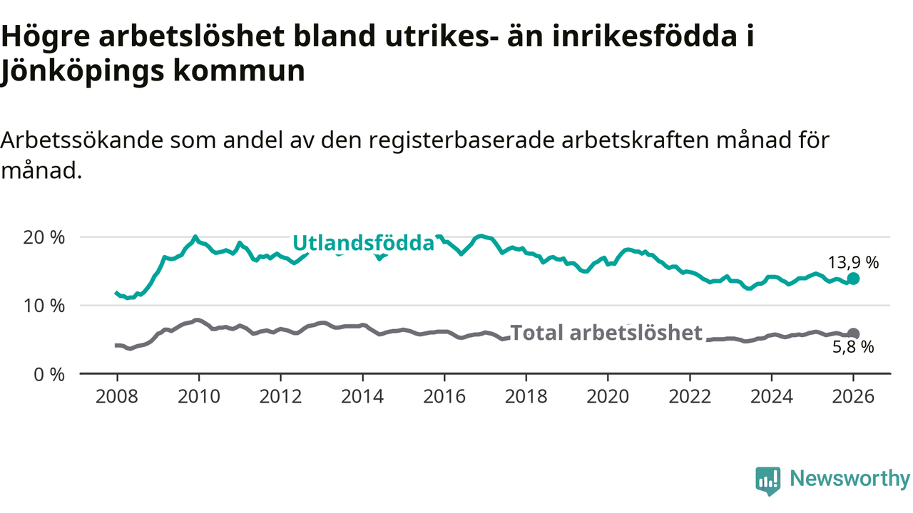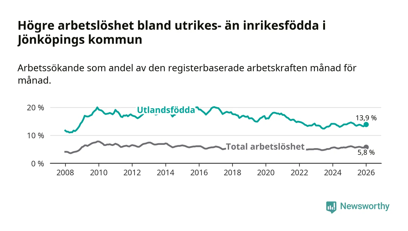 Arbetslösheten bland utlandsfödda var 13,9 procent i Jönköping under januari månad, motsvarande 2 595 av 18 669 personer. Det är 0,5 procentenheter färre än vid samma tidpunkt i fjol (−23 om man räknar personer).
