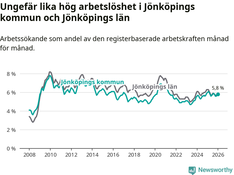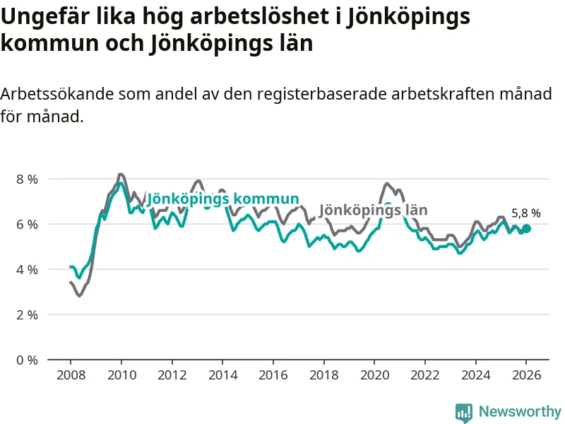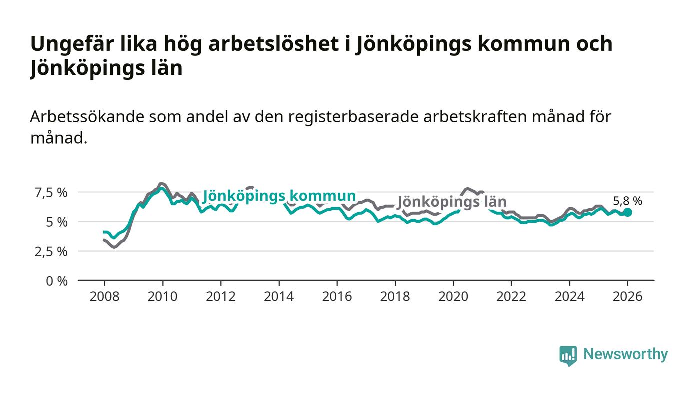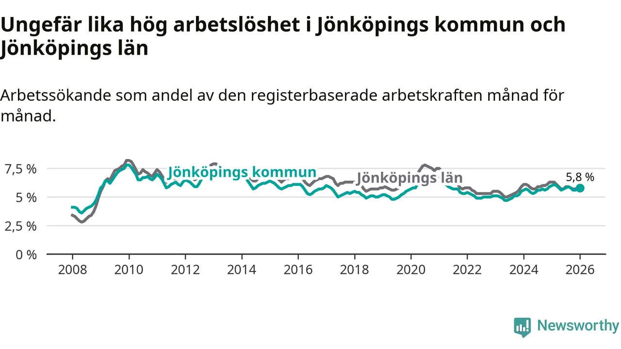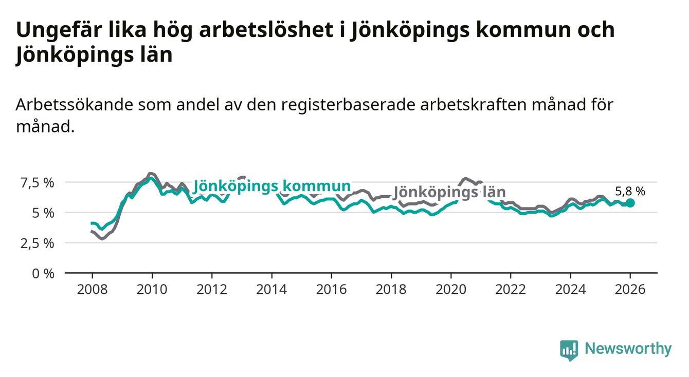 Under januari månad rapporterade Jönköpings kommun en total arbetslöshet på 5,8 procent. Det är en minskning jämfört med samma tidpunkt i fjol (−0,2 procentenheter). Även i Jönköpings län sjunker arbetslösheten .