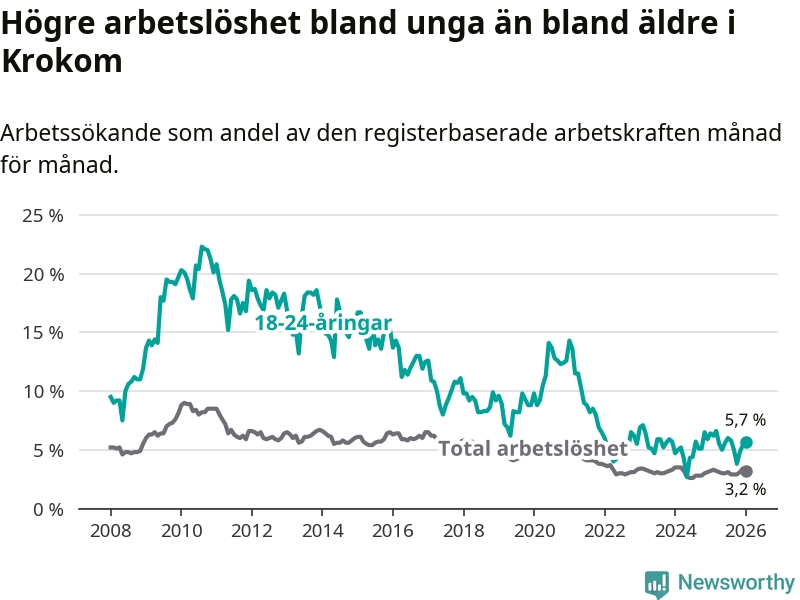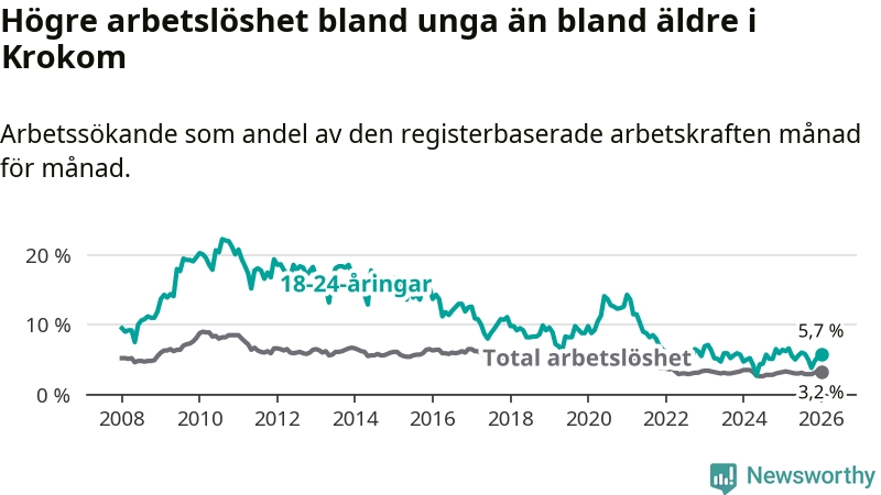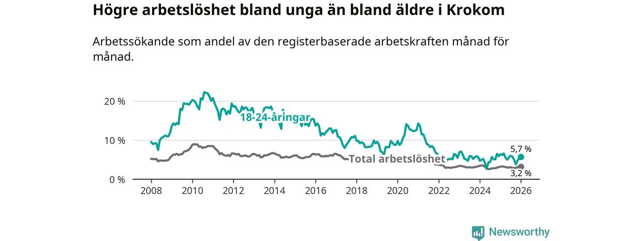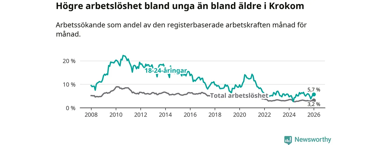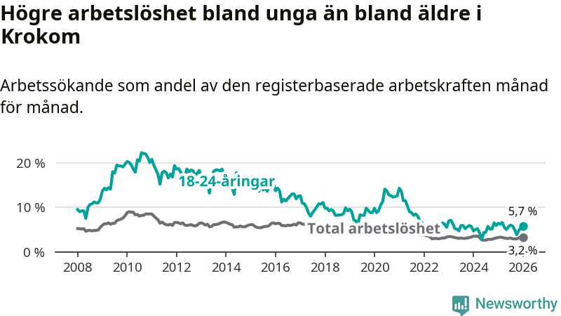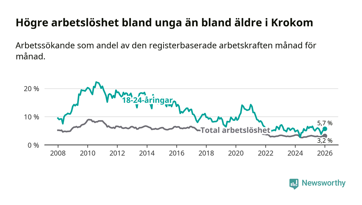 Till skillnad från den totala arbetslösheten sjunker arbetslösheten bland unga (−0,7 procentenheter). I januari var 5,7 procent av 18–24-åringarna inskrivna som arbetssökande (motsvarande 38 personer). Mäter vi antalet inskrivna ser vi en minskning med två personer på ett års sikt.