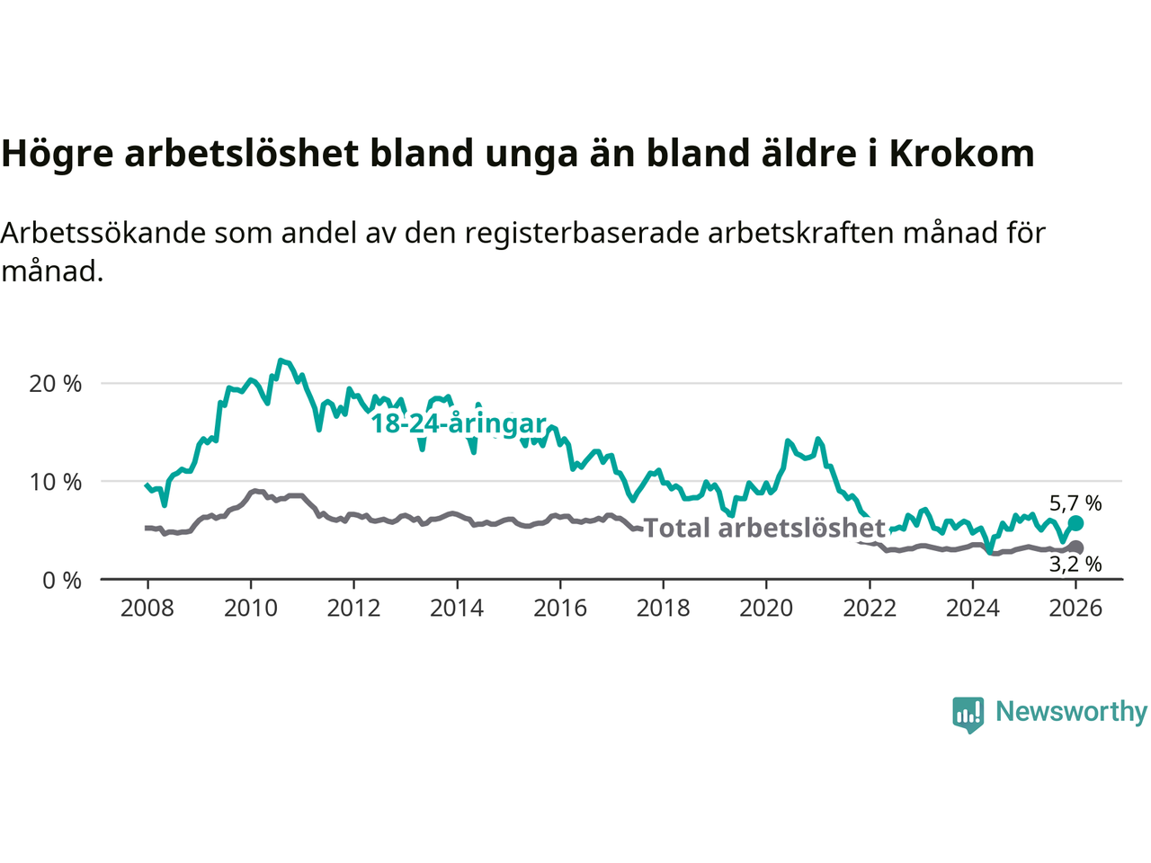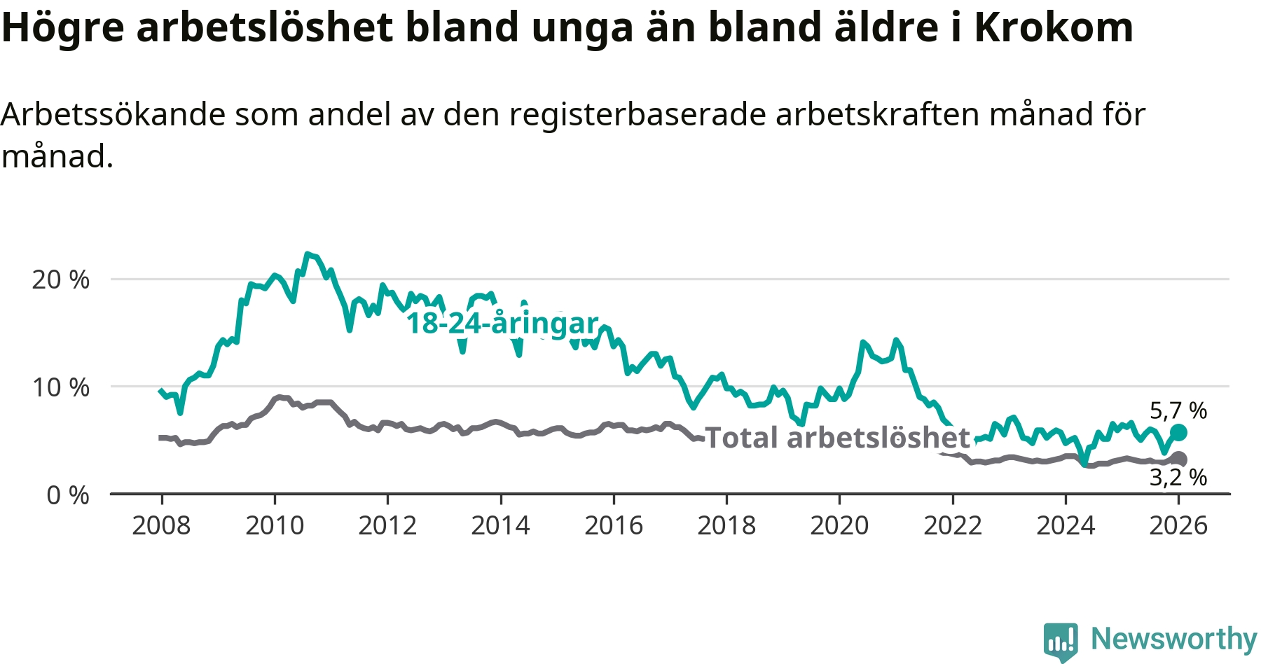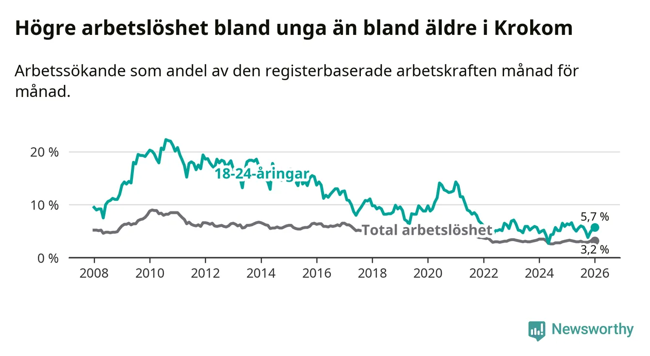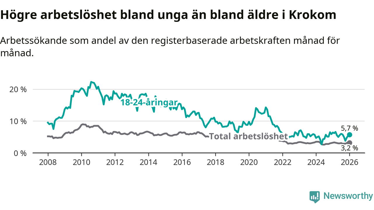 Till skillnad från den totala arbetslösheten sjunker arbetslösheten bland unga (−0,7 procentenheter). I januari var 5,7 procent av 18–24-åringarna inskrivna som arbetssökande (motsvarande 38 personer). Mäter vi antalet inskrivna ser vi en minskning med två personer på ett års sikt.