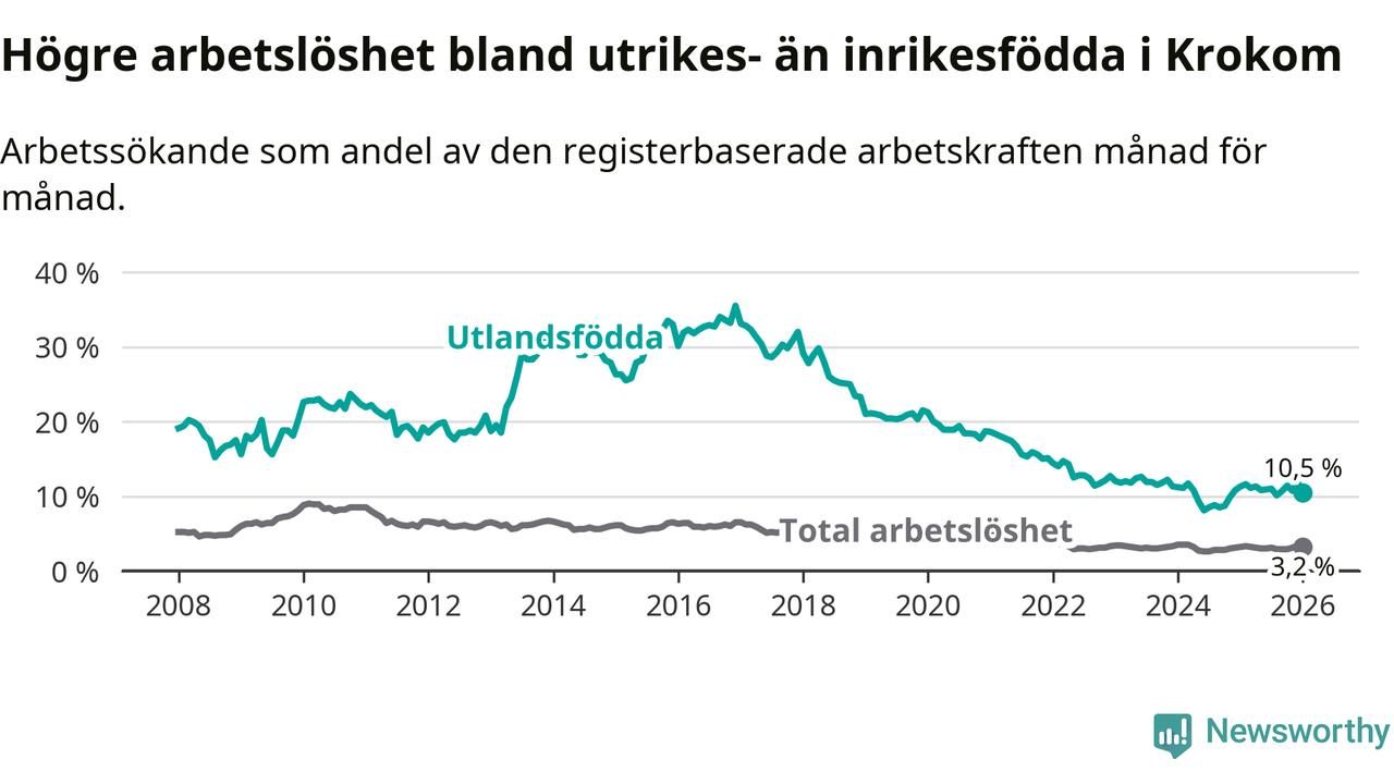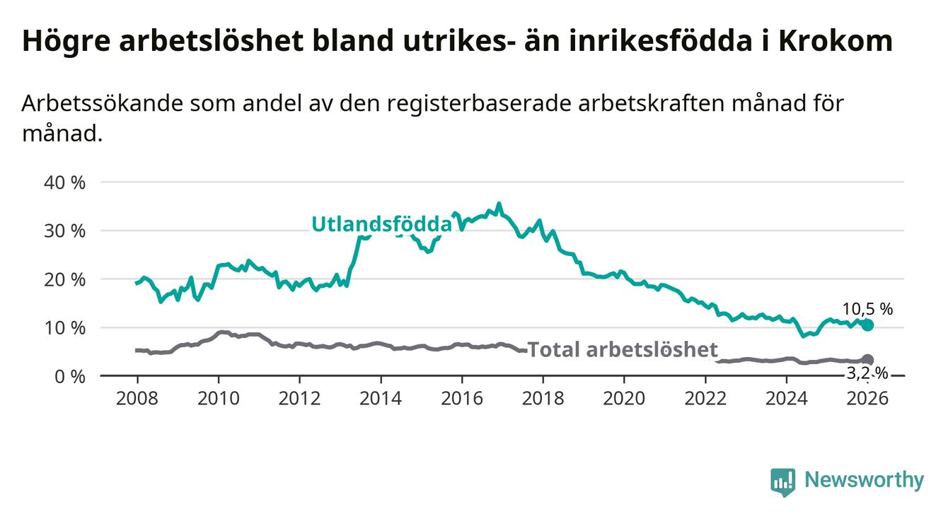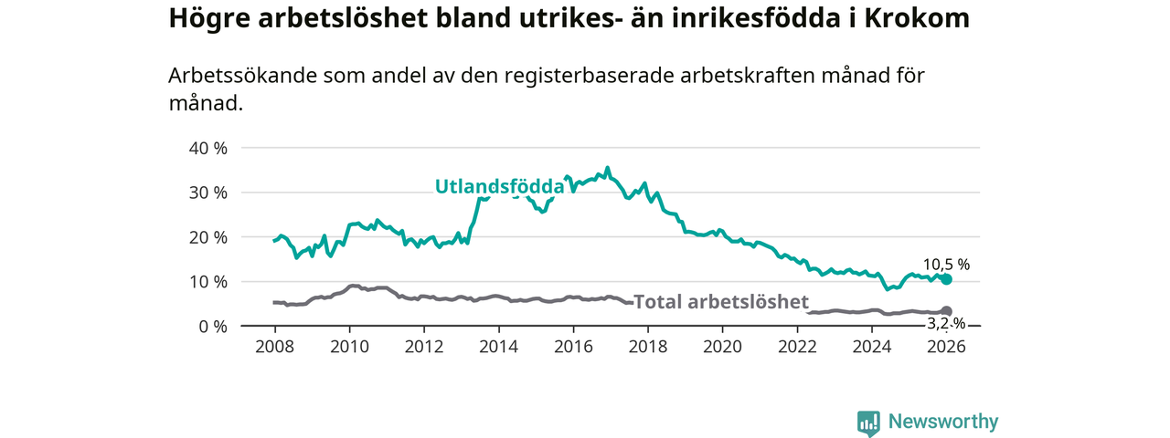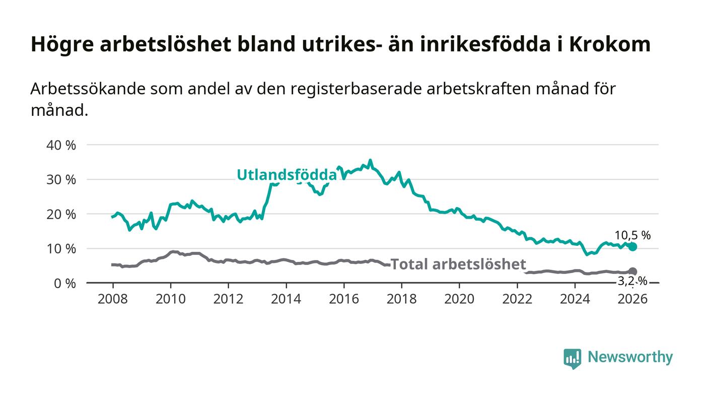 Arbetslösheten bland utlandsfödda var 10,5 procent i Krokom under januari månad, motsvarande 74 av 705 personer. Det är 0,8 procentenheter färre än vid samma tidpunkt i fjol (±0 om man räknar personer). Den senaste månadens nedgång innebär ett trendbrott. Under de nio föregående månaderna hade arbetslösheten bland utlandsfödda varit högre än motsvarande tidpunkt året innan.