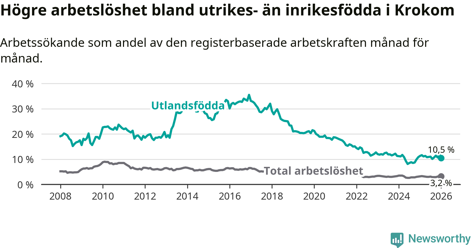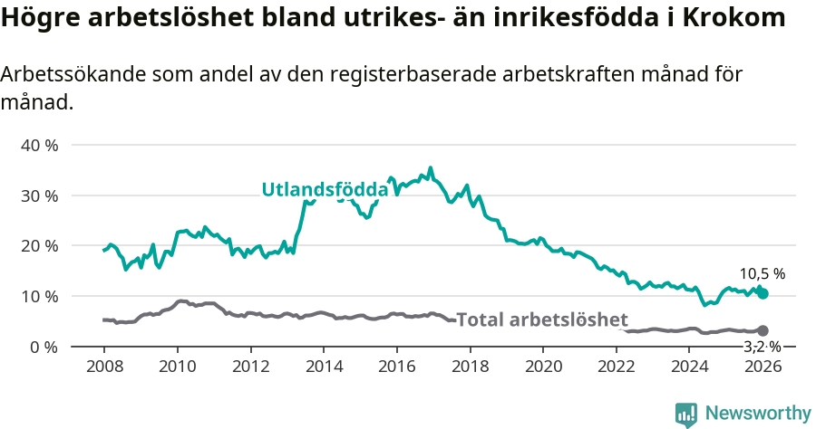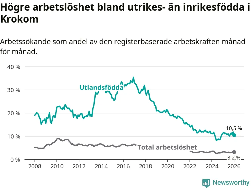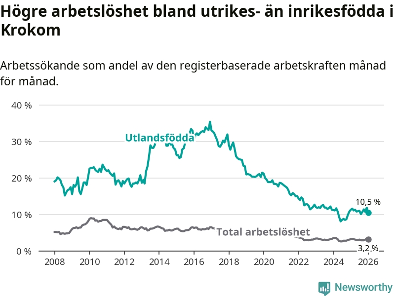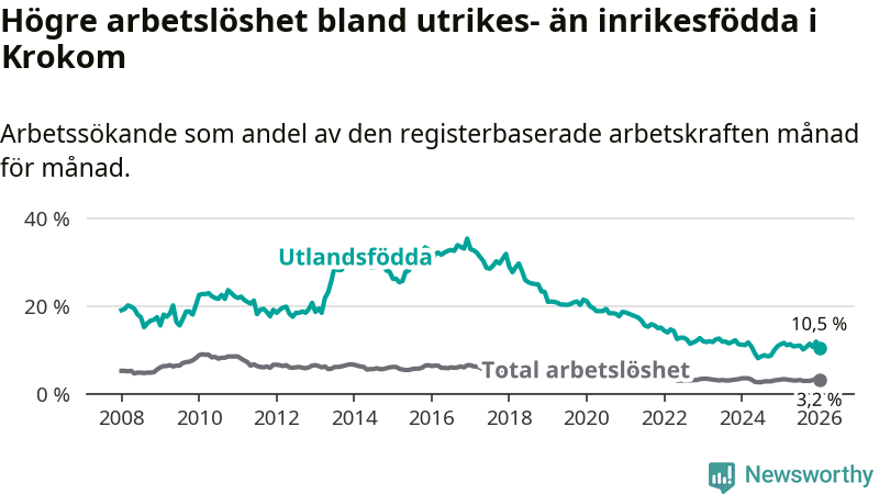 Arbetslösheten bland utlandsfödda var 10,5 procent i Krokom under januari månad, motsvarande 74 av 705 personer. Det är 0,8 procentenheter färre än vid samma tidpunkt i fjol (±0 om man räknar personer). Den senaste månadens nedgång innebär ett trendbrott. Under de nio föregående månaderna hade arbetslösheten bland utlandsfödda varit högre än motsvarande tidpunkt året innan.