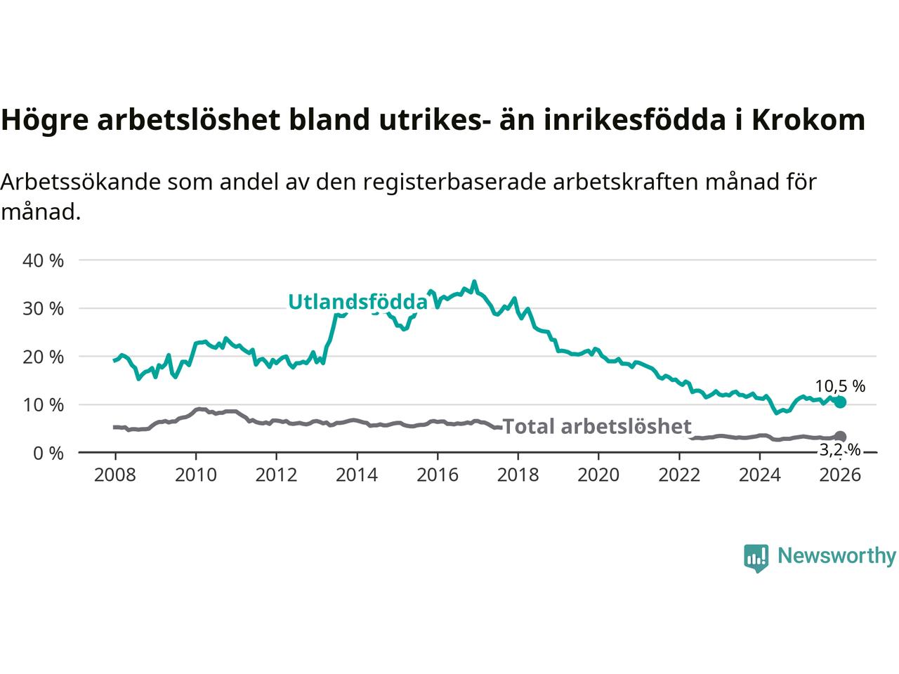 Läs mer om arbetslösheten bland utlandsfödda längre ner i den här texten.