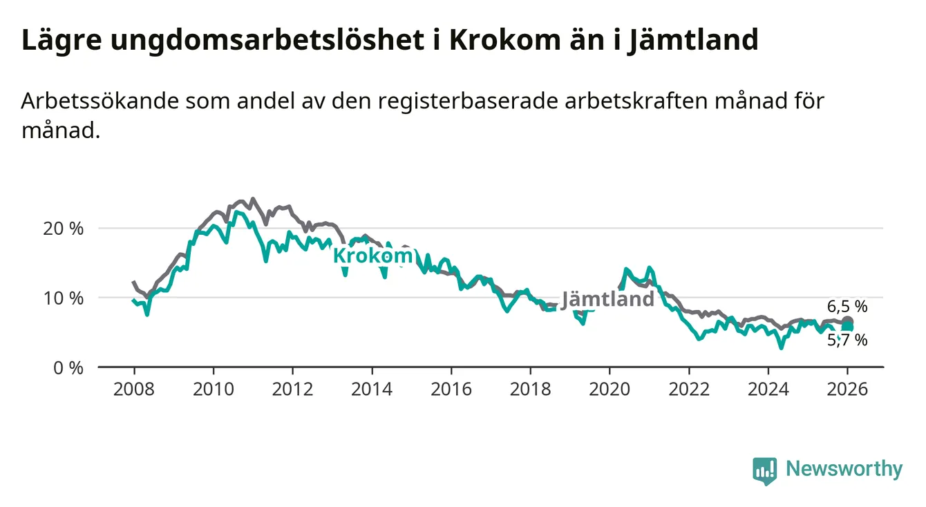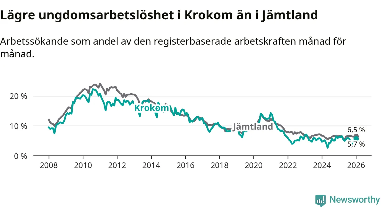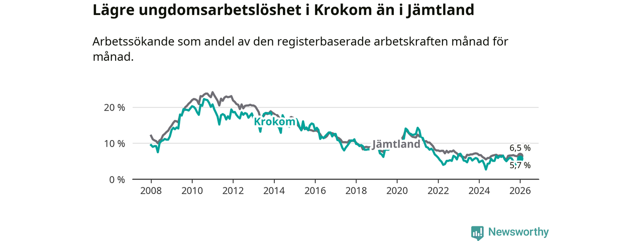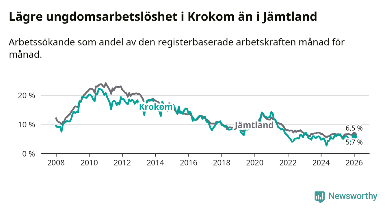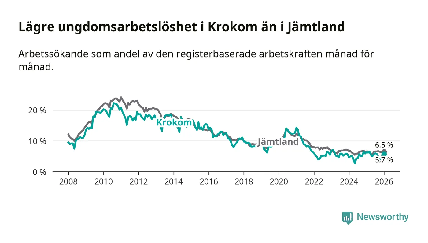 Precis som den totala arbetslösheten ligger ungdomsarbetslösheten i Krokom lägre än i Jämtland som helhet. Skillnaden mellan kommunen och länet är 0,8 procentenheter.