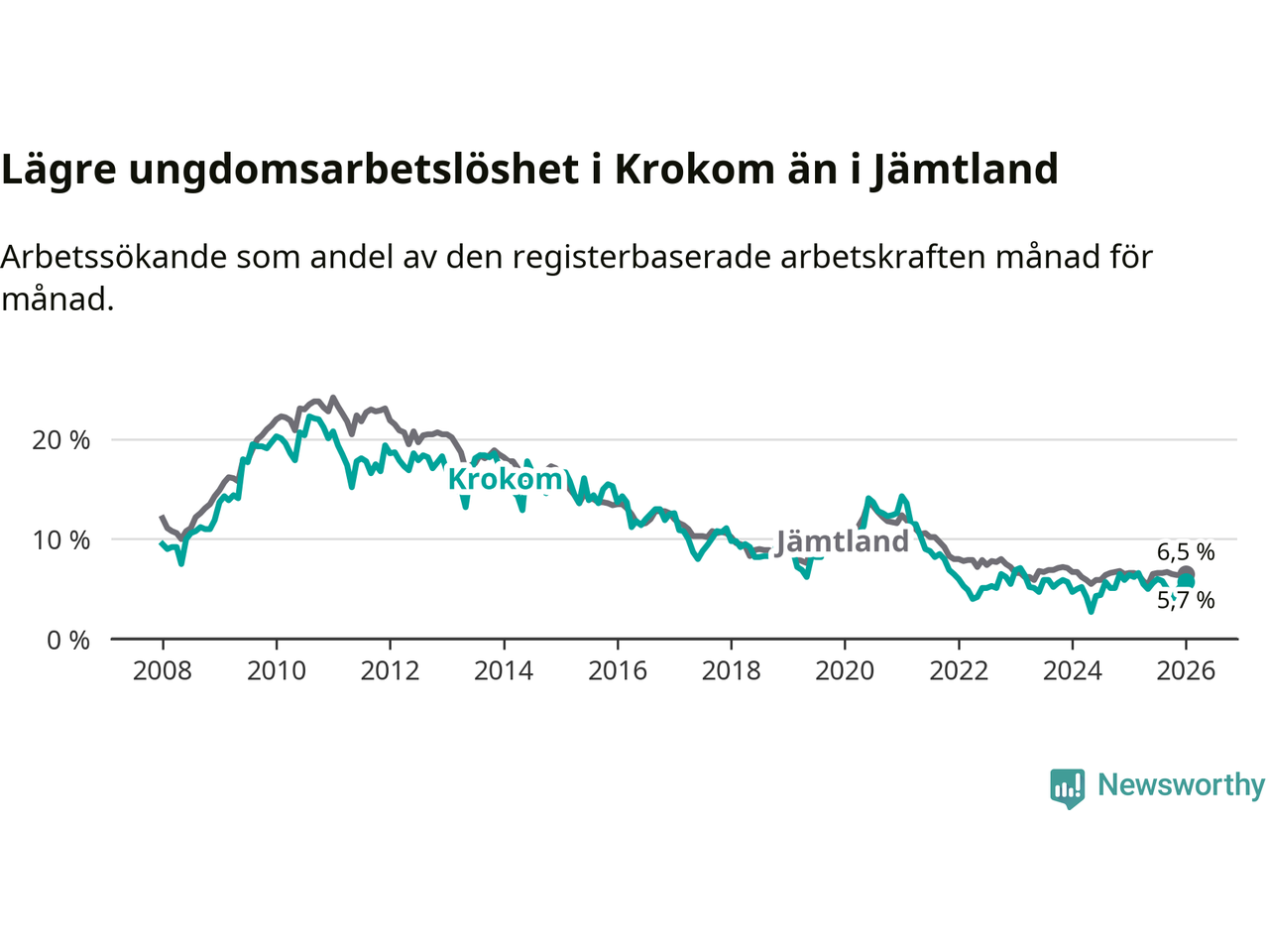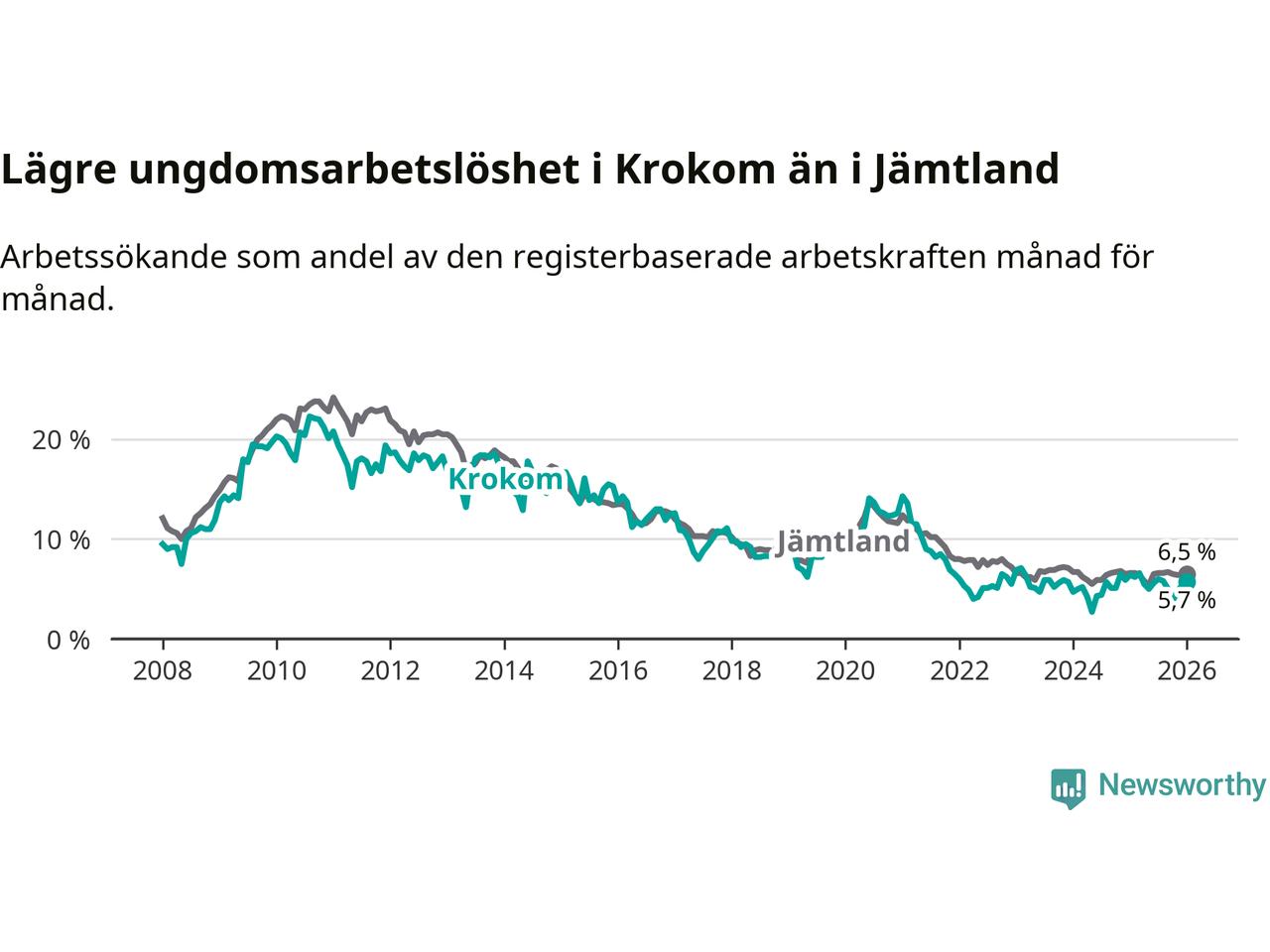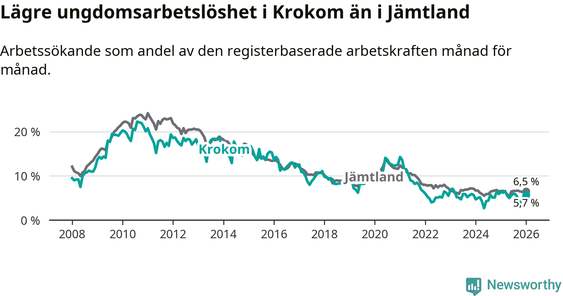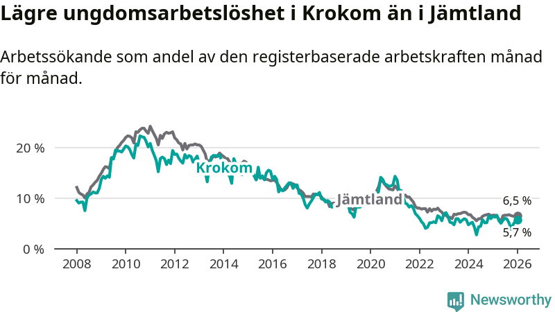 Precis som den totala arbetslösheten ligger ungdomsarbetslösheten i Krokom lägre än i Jämtland som helhet. Skillnaden mellan kommunen och länet är 0,8 procentenheter.
