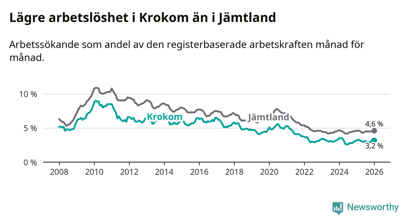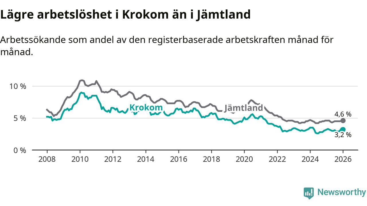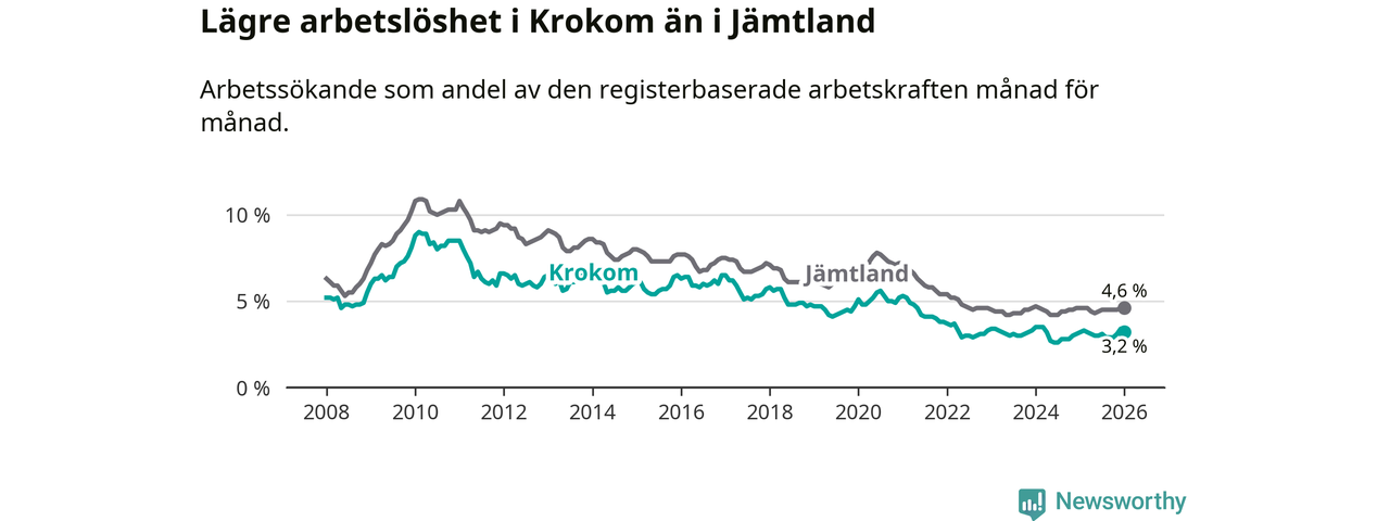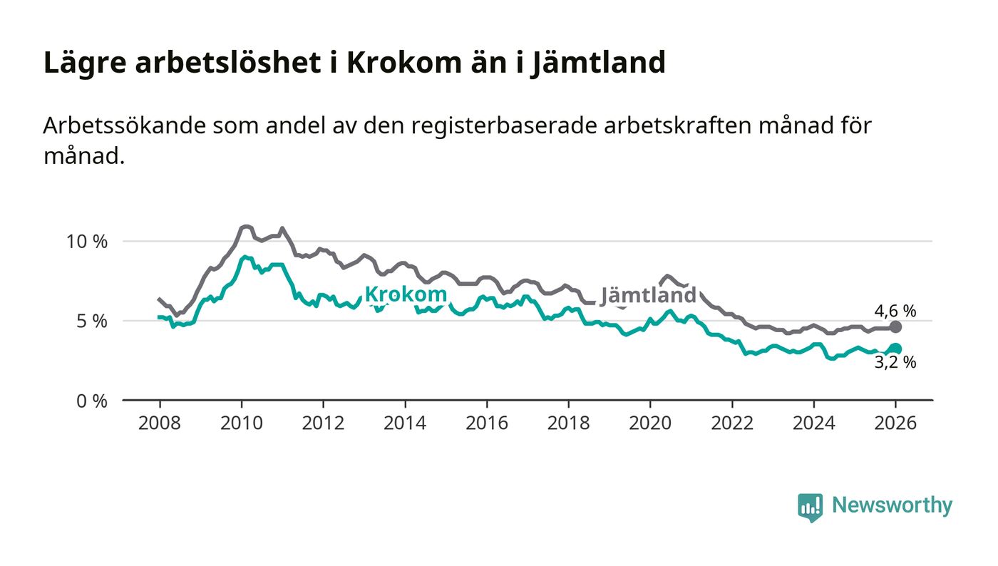 Perstorp är den kommun som har högst arbetslöshet just nu (13,4 procent) i landet som helhet, medan Gällivare, Kiruna och Sorsele har den lägsta (2,4 procent). Krokoms arbetslöshet sticker ut som den nionde lägsta i hela landet.