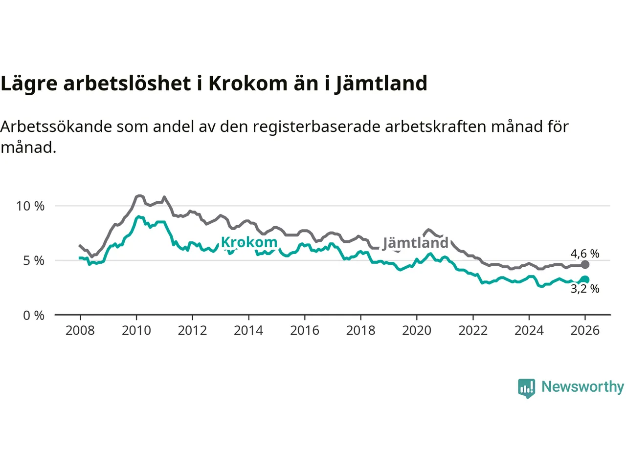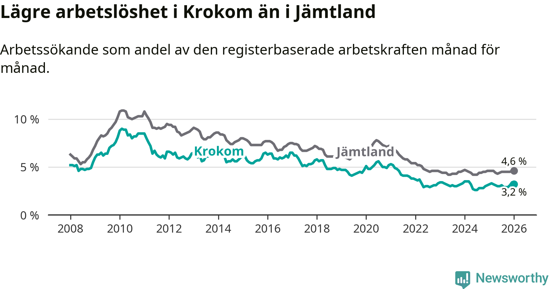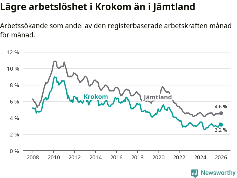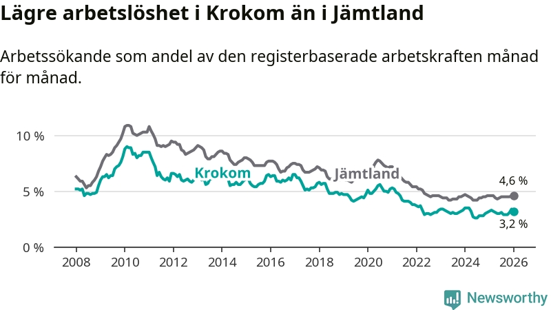 Perstorp är den kommun som har högst arbetslöshet just nu (13,4 procent) i landet som helhet, medan Gällivare, Kiruna och Sorsele har den lägsta (2,4 procent). Krokoms arbetslöshet sticker ut som den nionde lägsta i hela landet.