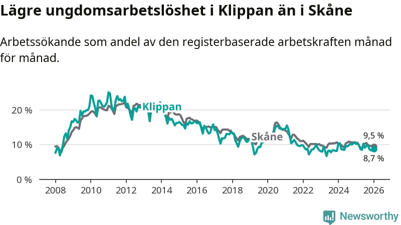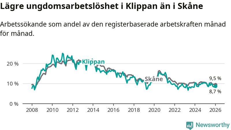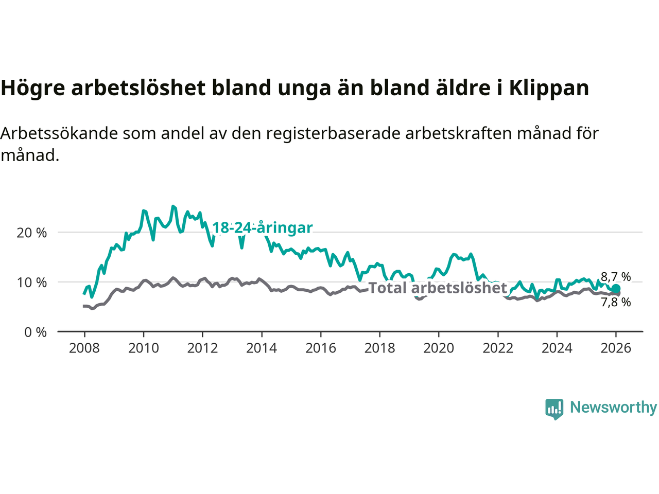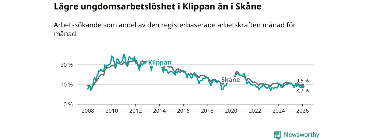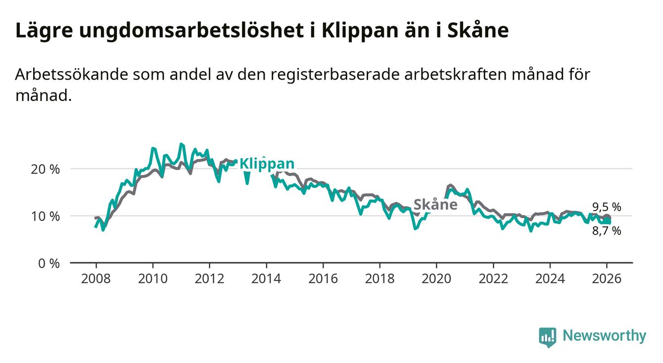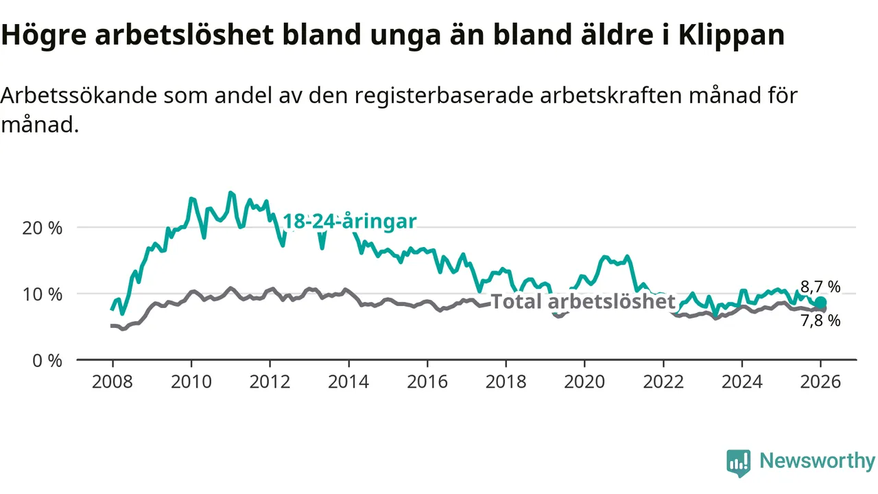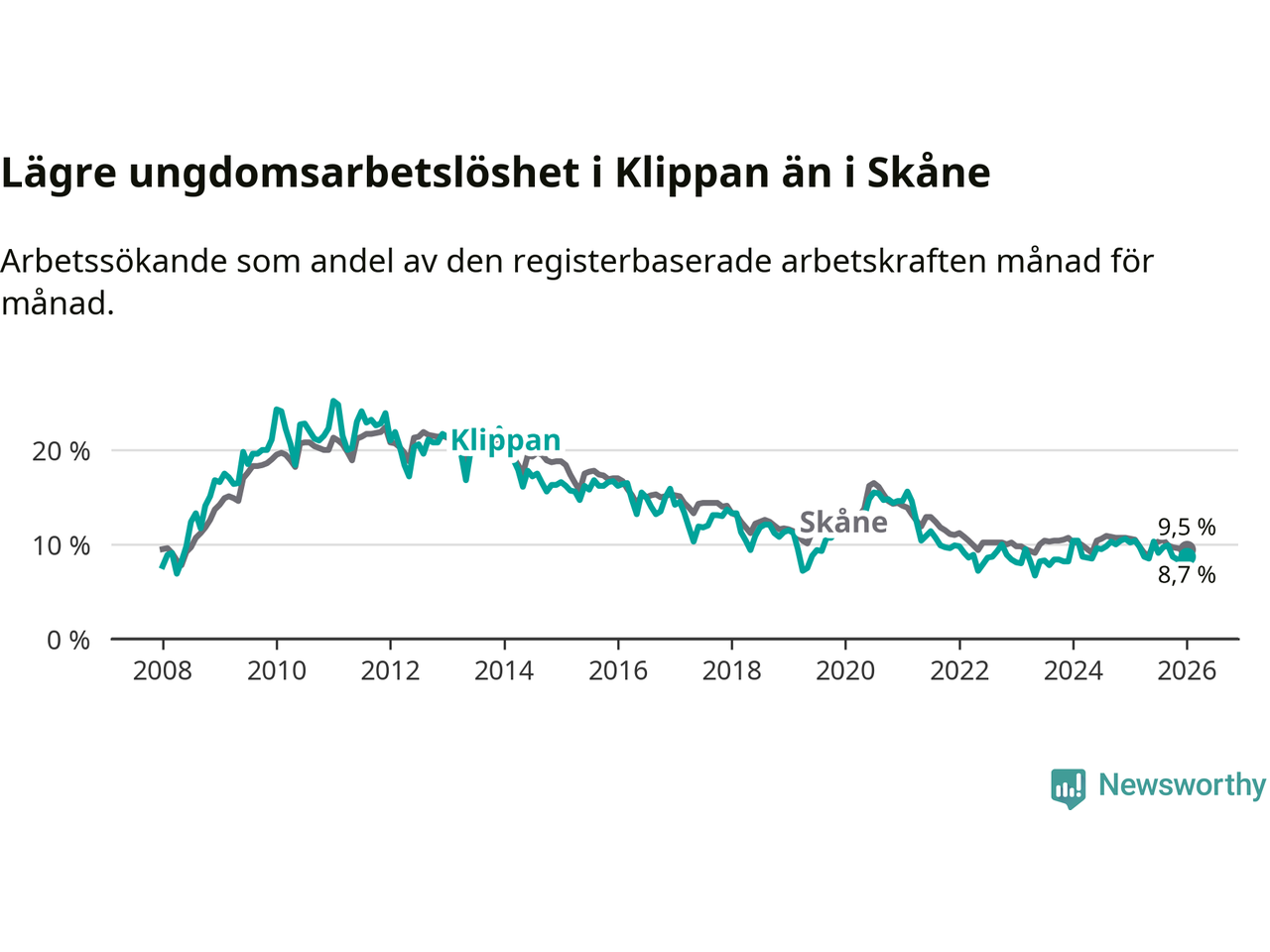 I och med den senaste månadens nedgång har de ungas arbetslöshet i Klippan sjunkit sju månader i följd (ner från 10,3 procent i juni 2025 till 8,7 procent nu).