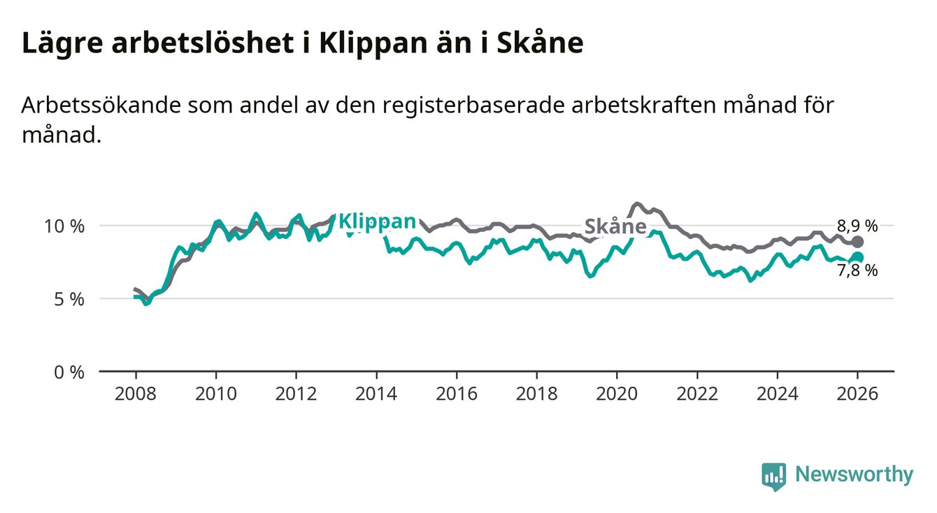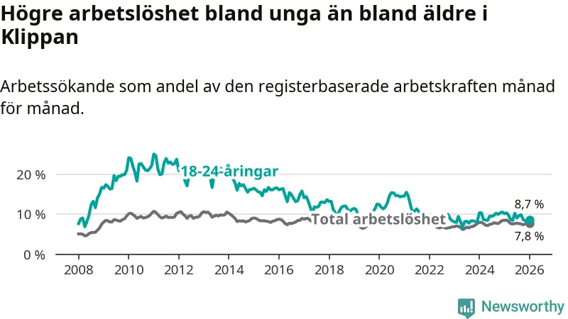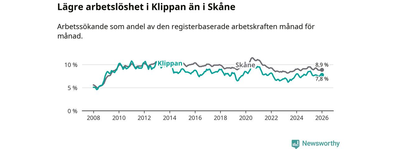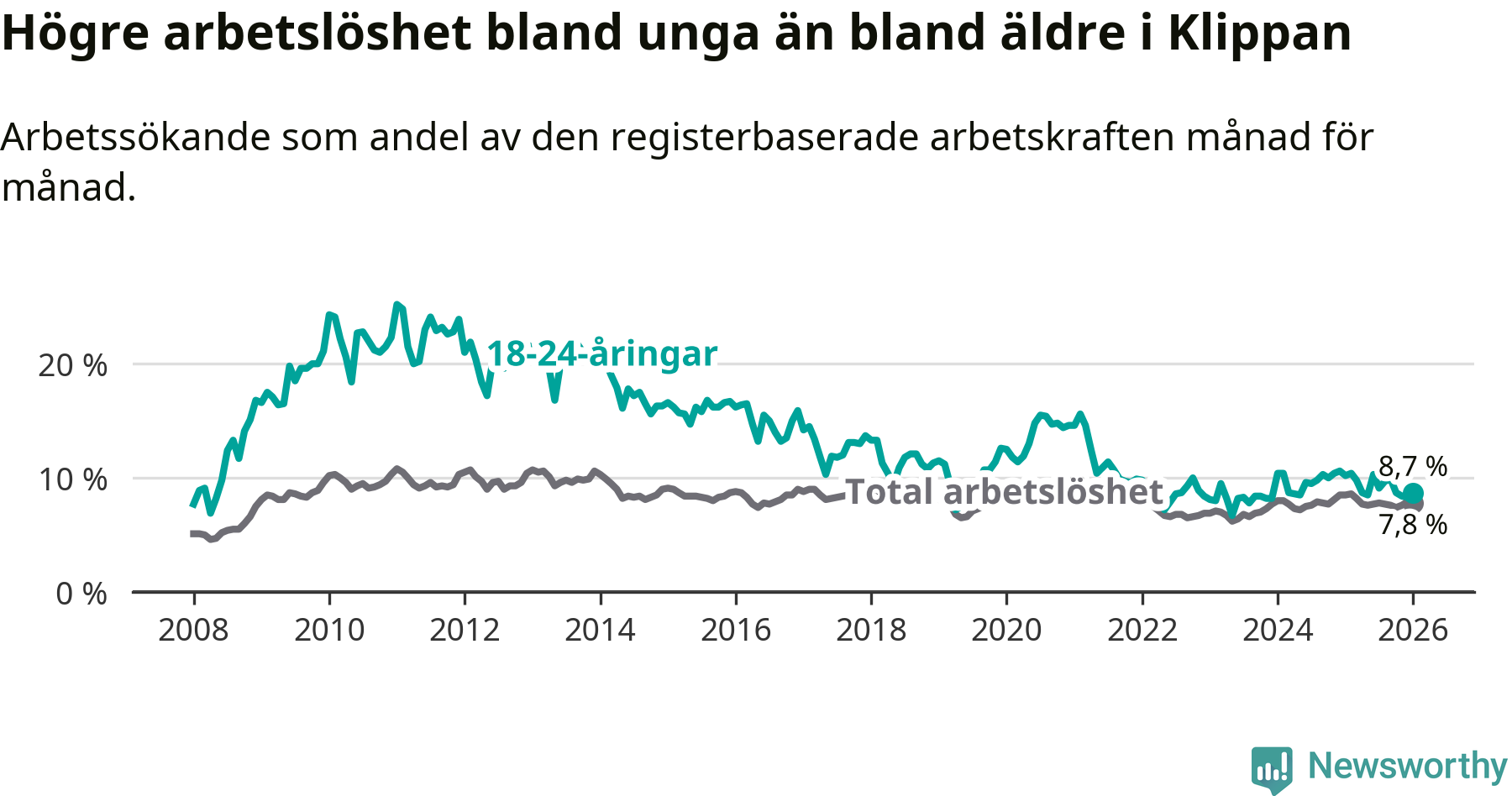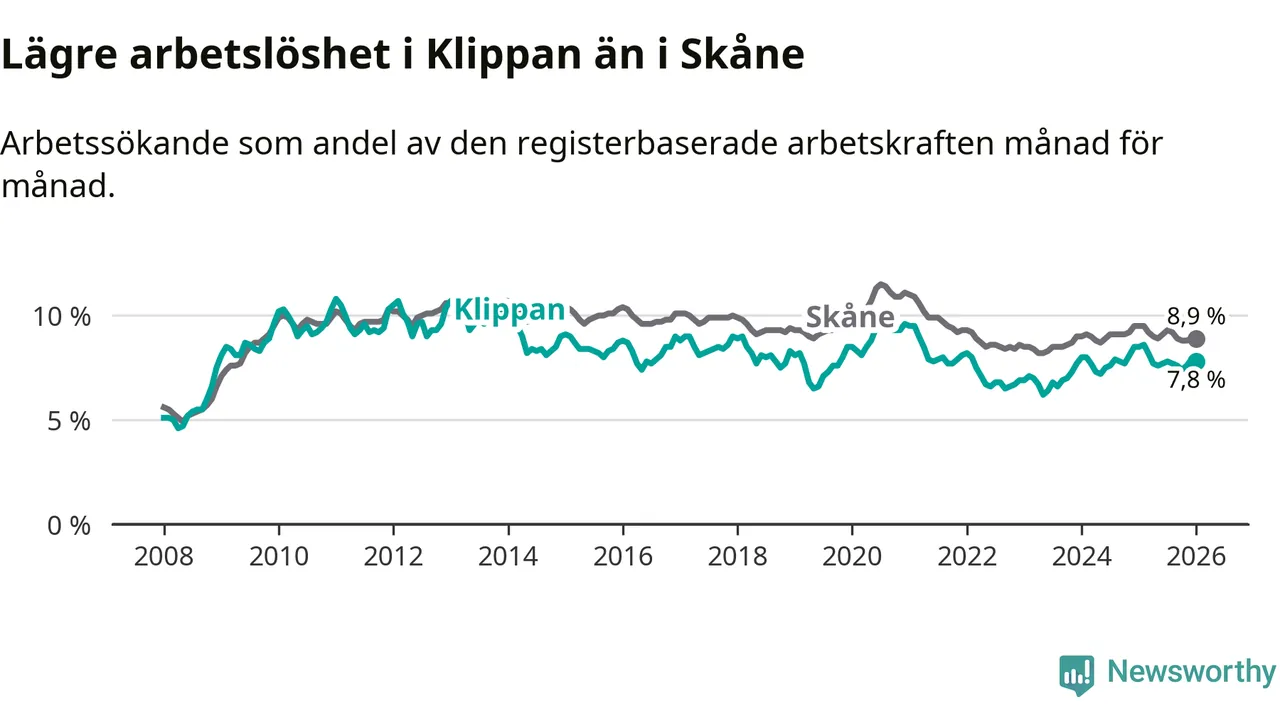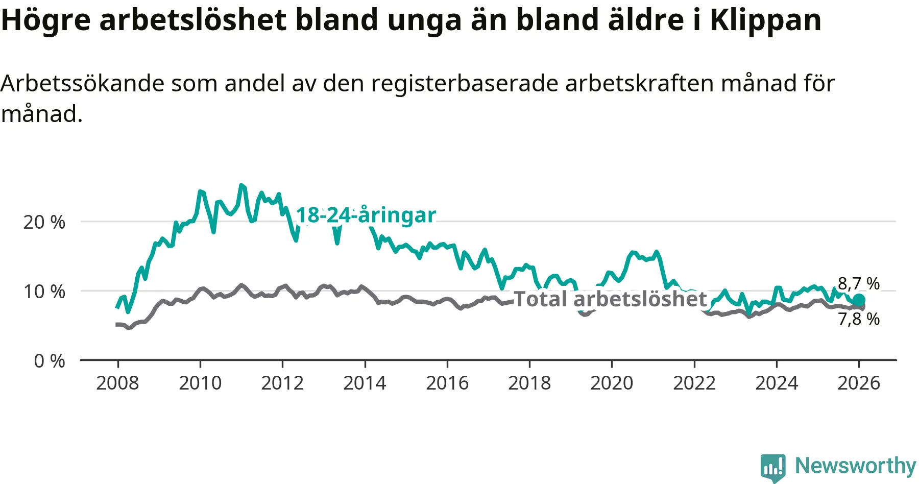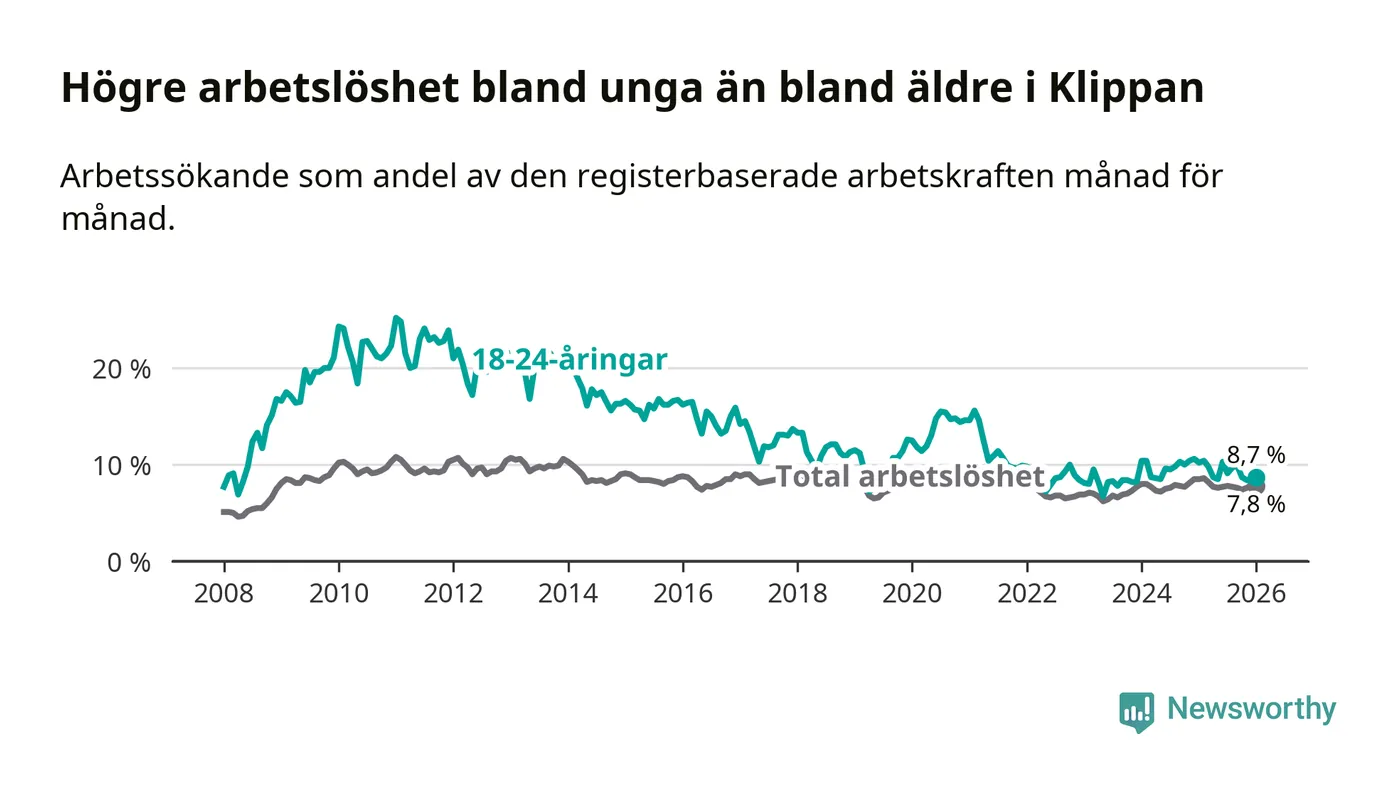 I och med den senaste månadens nedgång har de ungas arbetslöshet i Klippan sjunkit sju månader i följd (ner från 10,3 procent i juni 2025 till 8,7 procent nu).