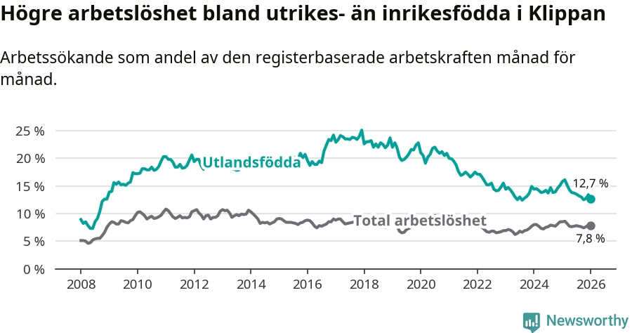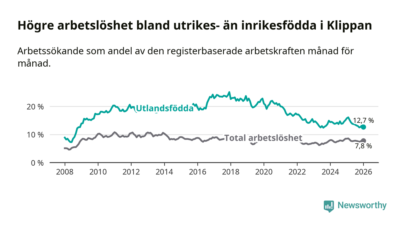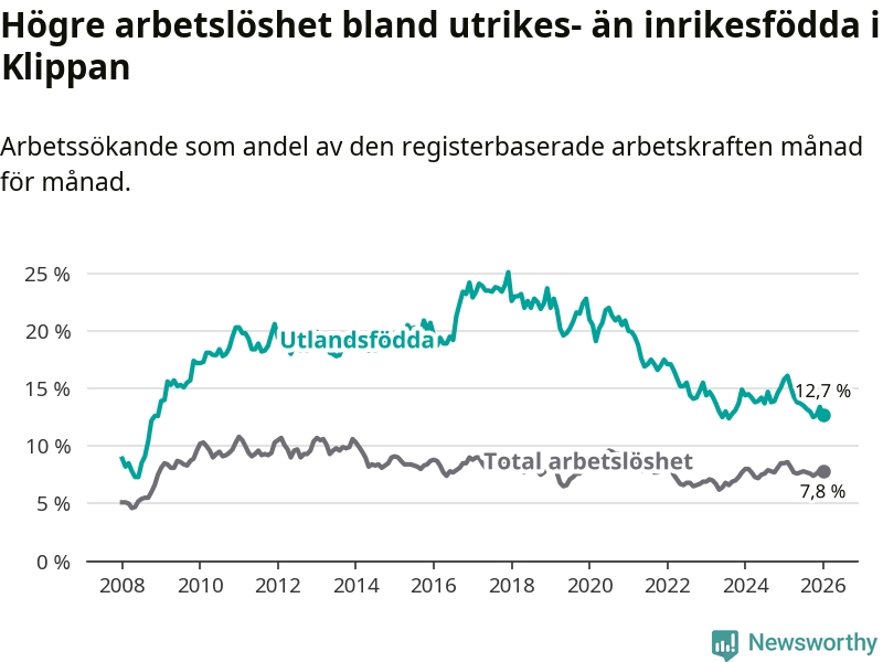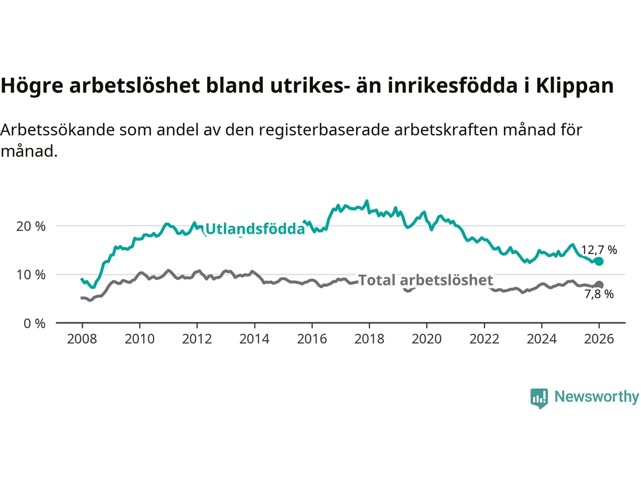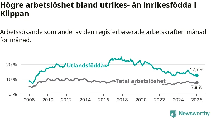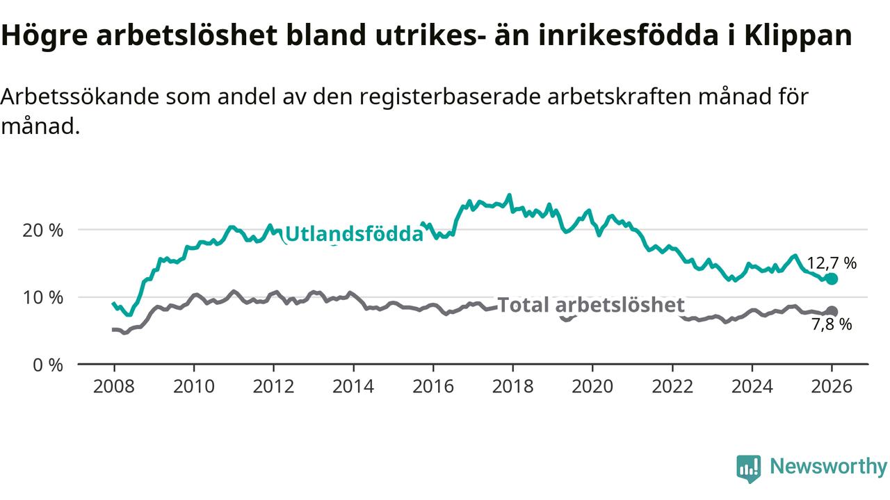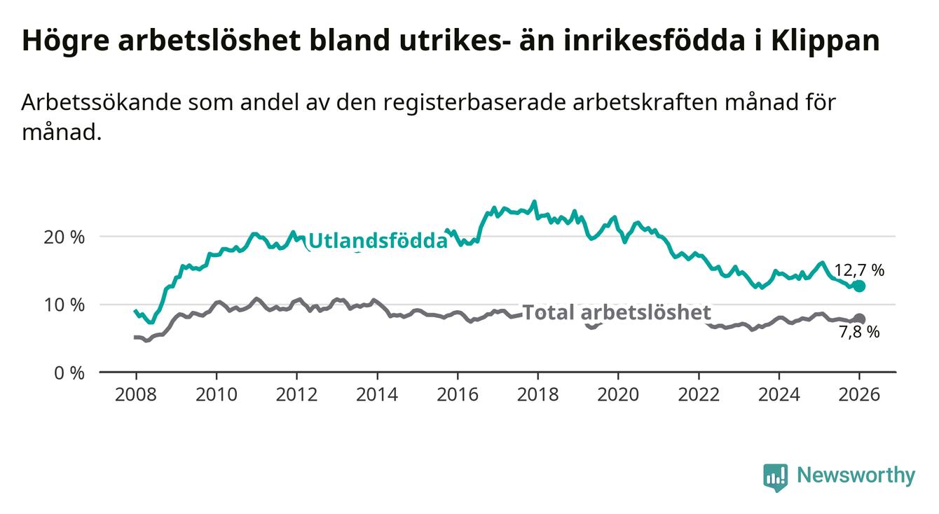 Arbetslösheten bland utlandsfödda var 12,7 procent i Klippan under januari månad, motsvarande 238 av 1 874 personer. Det är 3,1 procentenheter färre än vid samma tidpunkt i fjol (−56 om man räknar personer). Därmed är de utlandsföddas arbetslöshet lägre än vid samma tidpunkt i fjol för nionde månaden i följd. Sedan april 2025 har arbetslösheten bland utlandsfödda minskat från 14,3 till 12,7 procent.