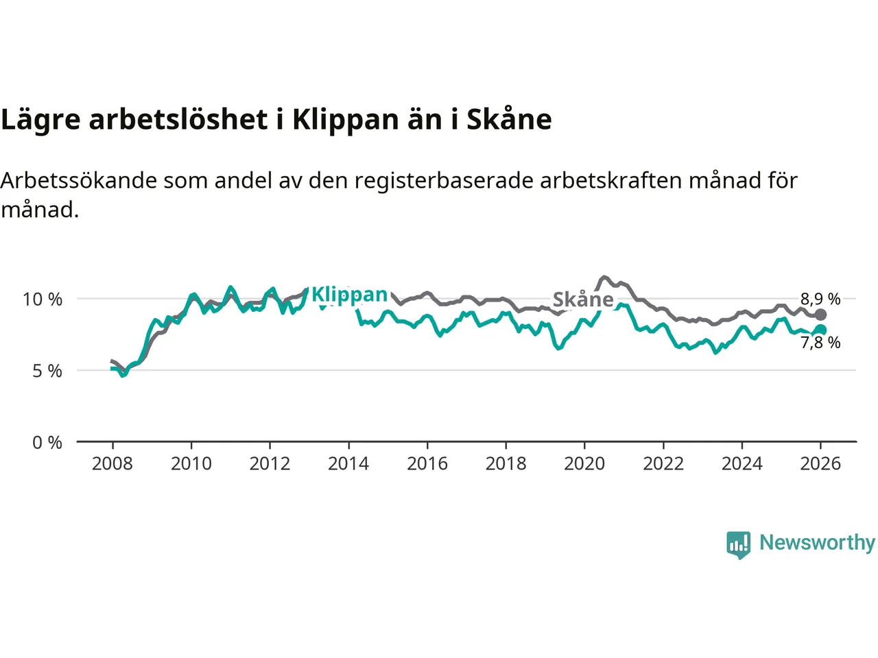 Under januari månad rapporterade Klippans kommun en total arbetslöshet på 7,8 procent. Det är en minskning jämfört med samma tidpunkt i fjol (−0,7 procentenheter). Även i Skåne län sjunker arbetslösheten .