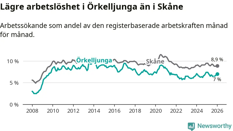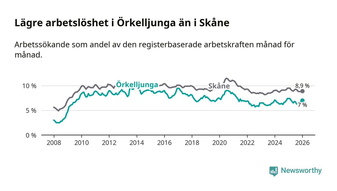 Örkelljunga hade redan tidigare lägre arbetslöshet än snittet i hela Skåne län och nu växer klyftan (7,0 procent i kommunen, jämfört med 8,9 procent i hela länet). Lomma har den lägsta arbetslösheten i länet (3,9 procent), medan Perstorp har den högsta (13,4 procent). För att Örkelljunga skulle komma ner i samma arbetslöshetsnivå som Lomma skulle 149 personer behöva sysselsättas.