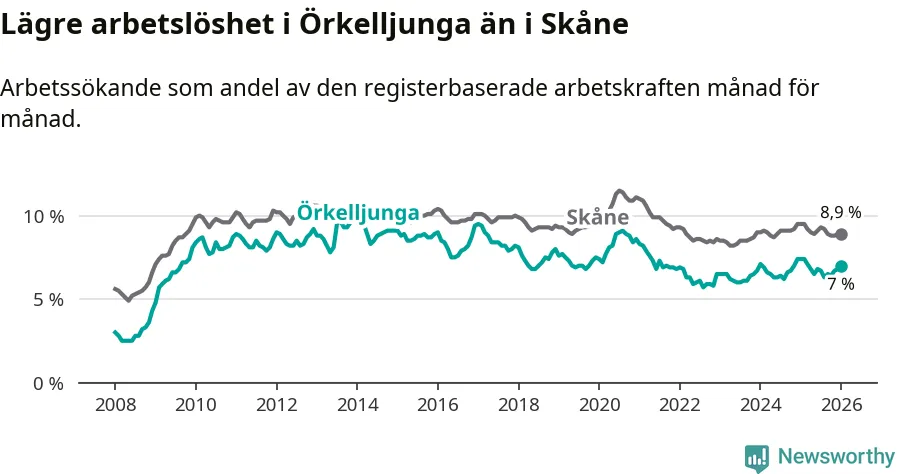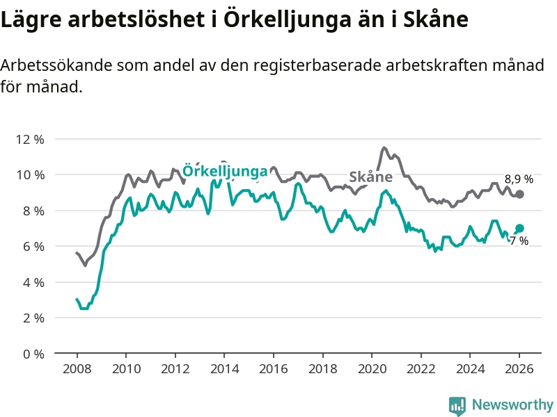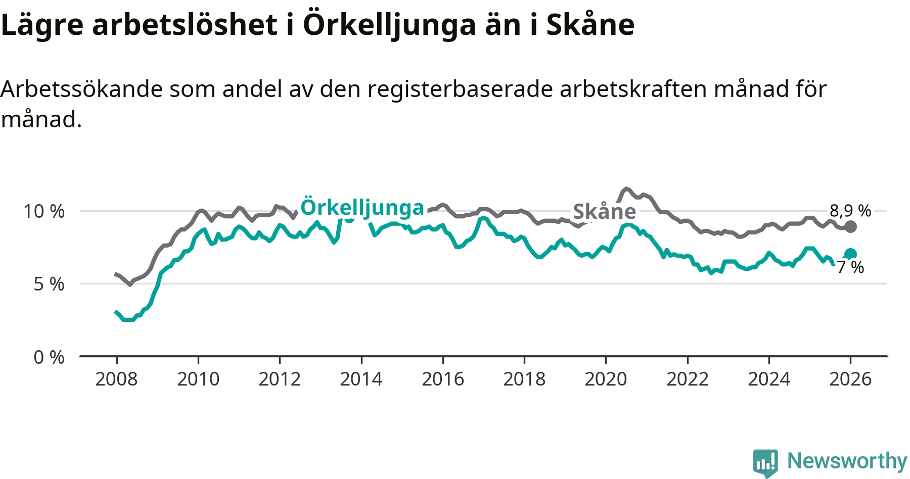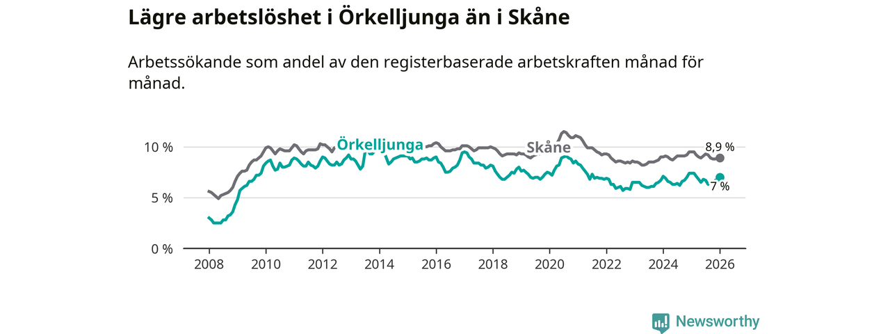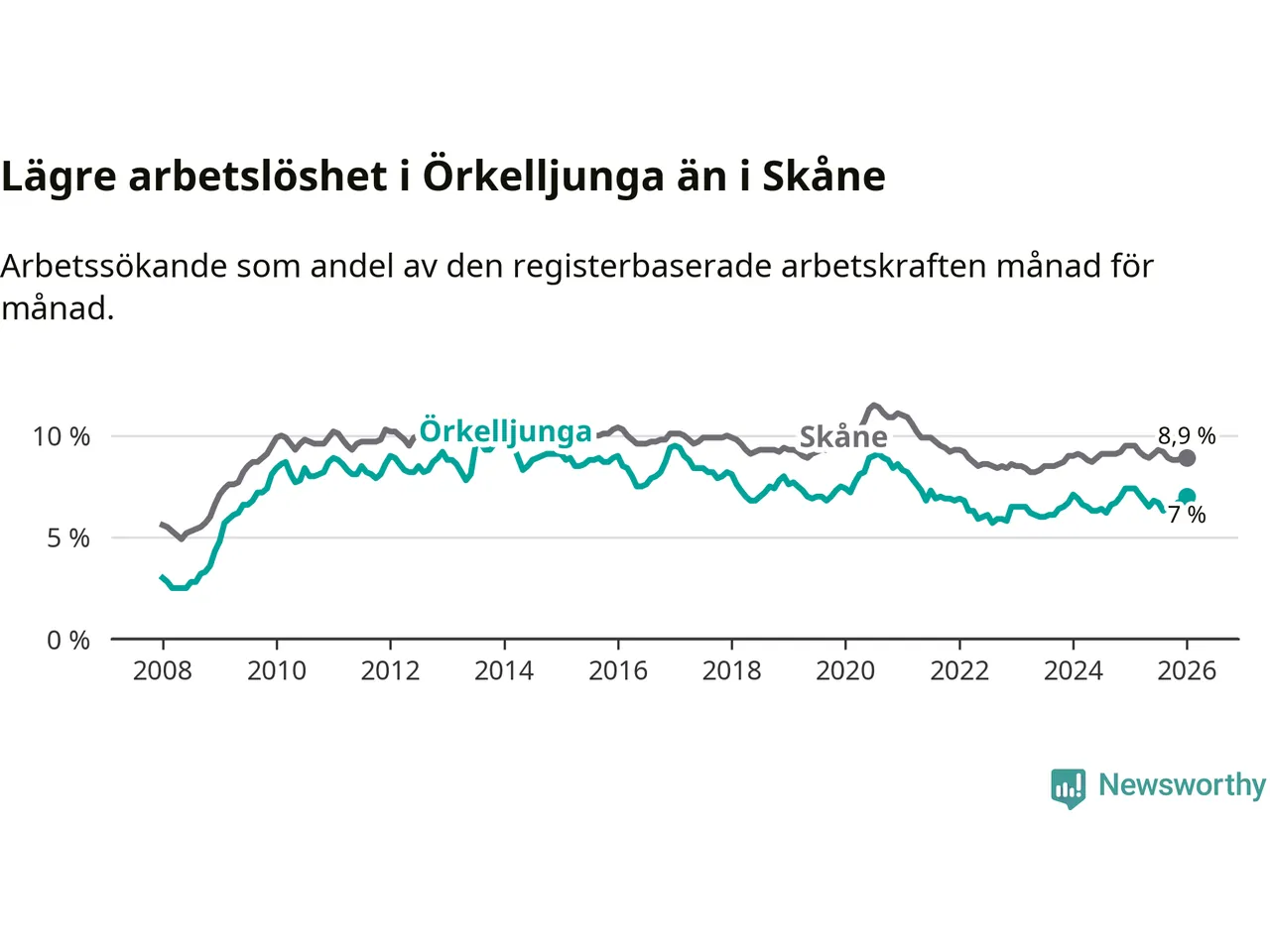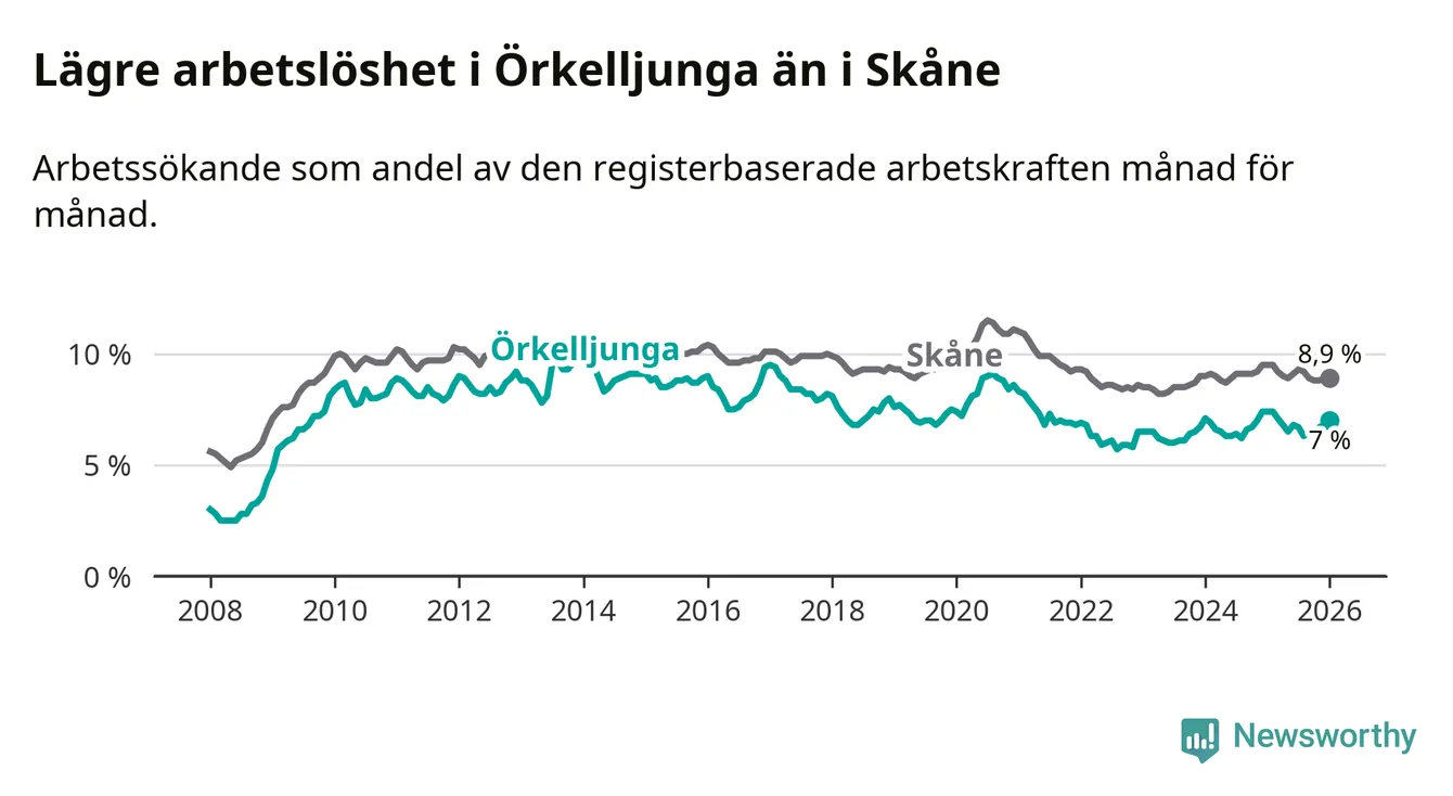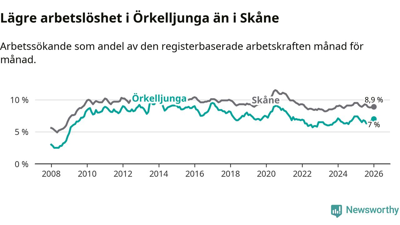 Under januari månad rapporterade Örkelljunga kommun en total arbetslöshet på 7,0 procent. Det är en minskning jämfört med samma tidpunkt i fjol (−0,4 procentenheter). Även i Skåne län sjunker arbetslösheten .