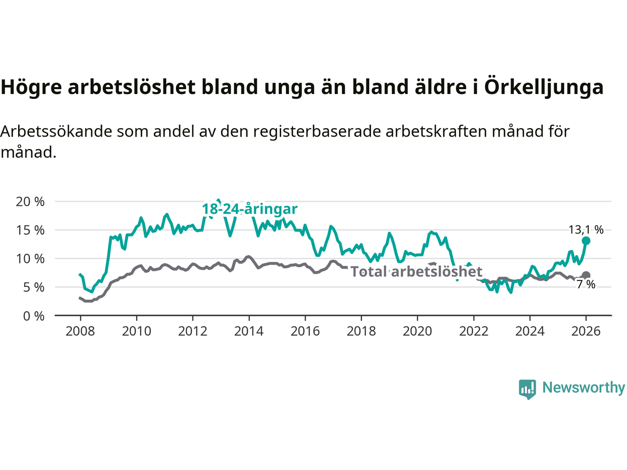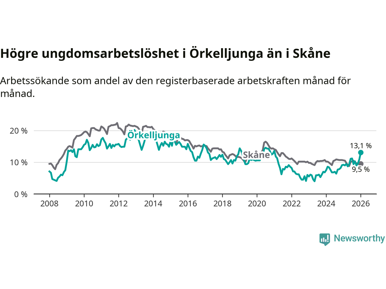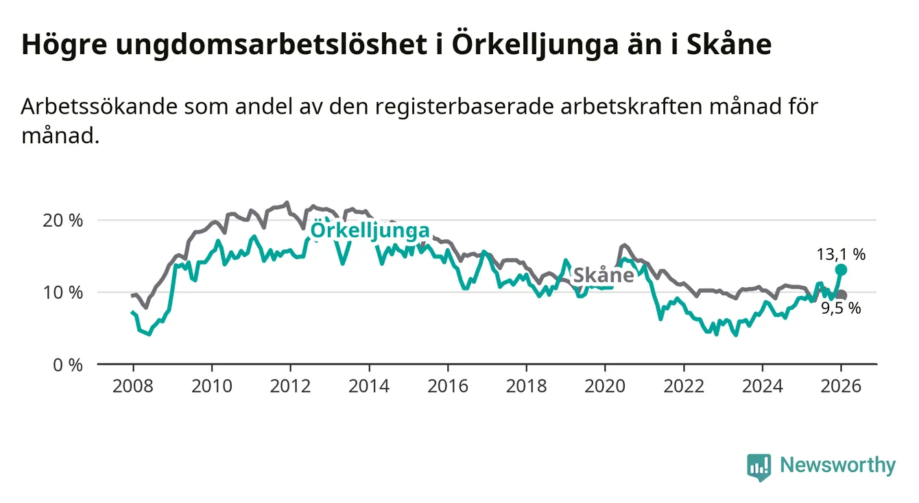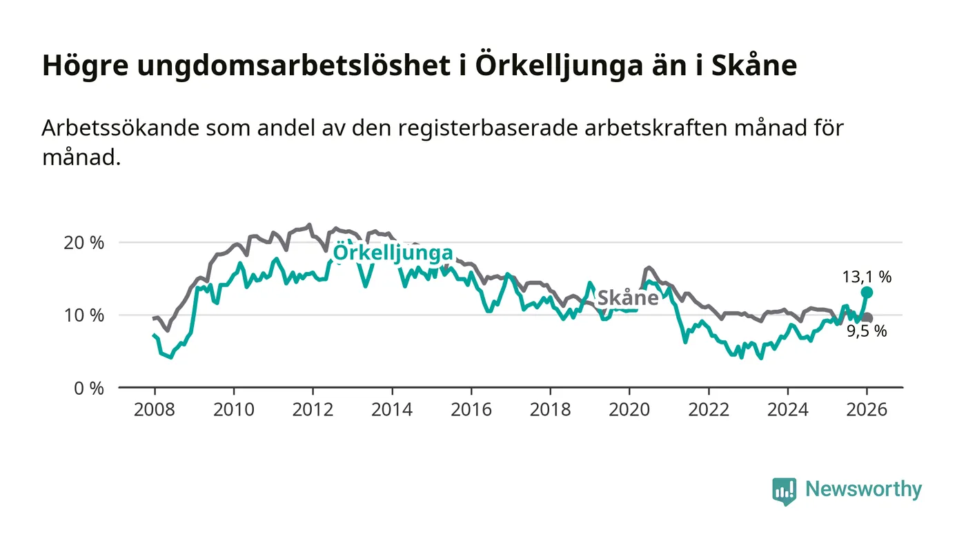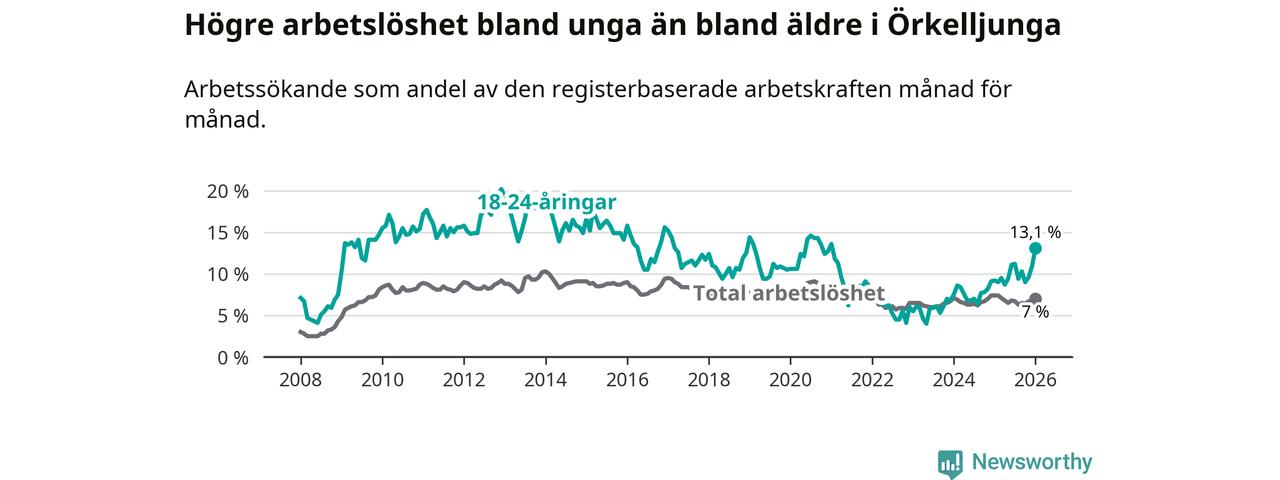 Den senaste månadsstatistiken från Arbetsförmedlingen visar på en uppgång i ungdoms­arbetslöshet i Örkelljunga kommun med 3,9 procentenheter. Arbetslösheten bland personer i åldern 18–24 år låg i januari på 13,1 procent.