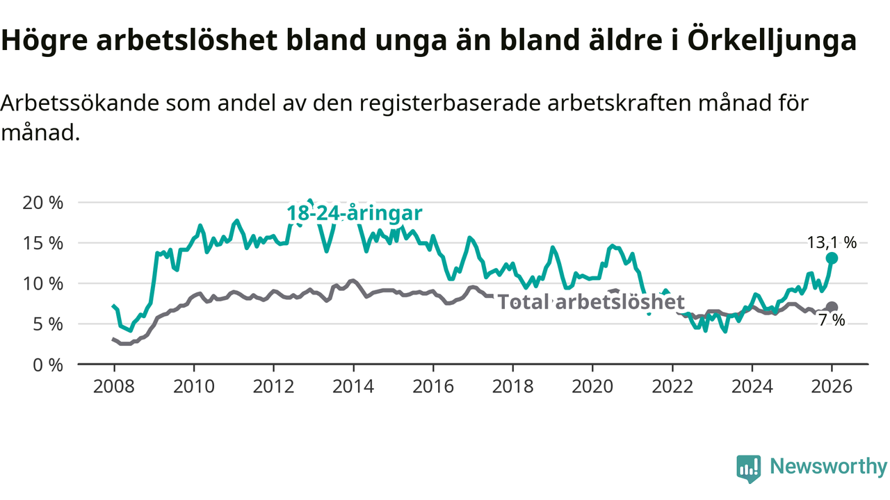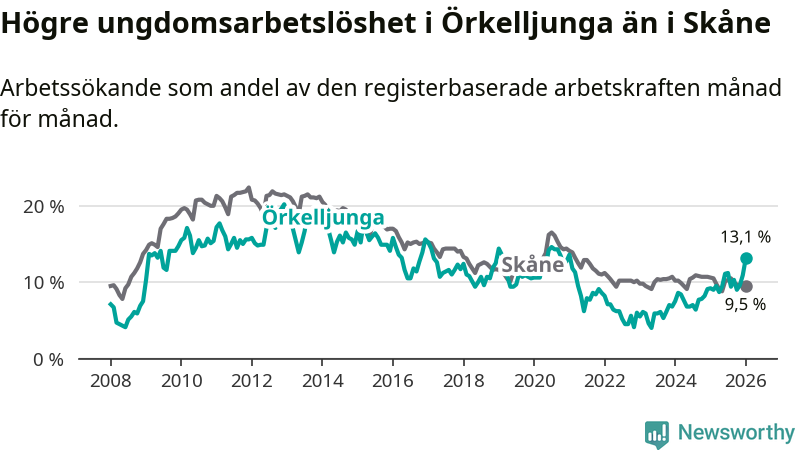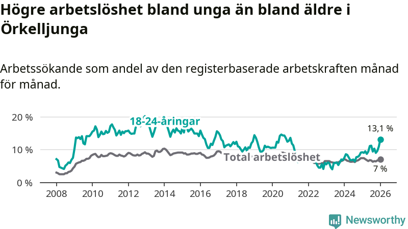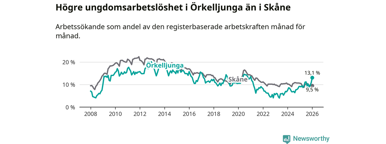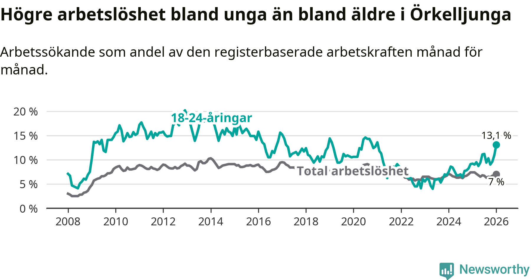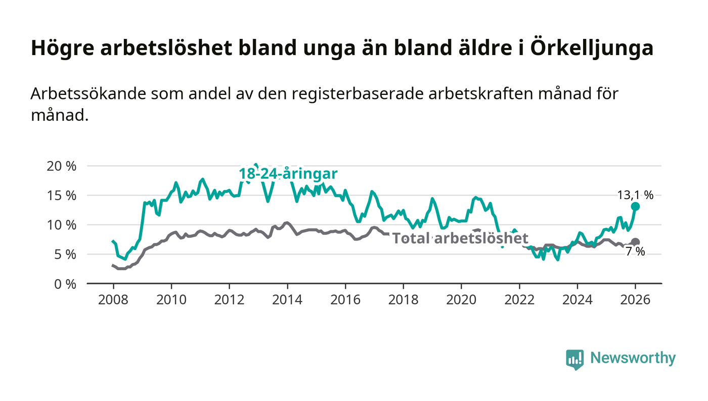 Den senaste månadsstatistiken från Arbetsförmedlingen visar på en uppgång i ungdoms­arbetslöshet i Örkelljunga kommun med 3,9 procentenheter. Arbetslösheten bland personer i åldern 18–24 år låg i januari på 13,1 procent.