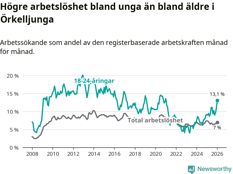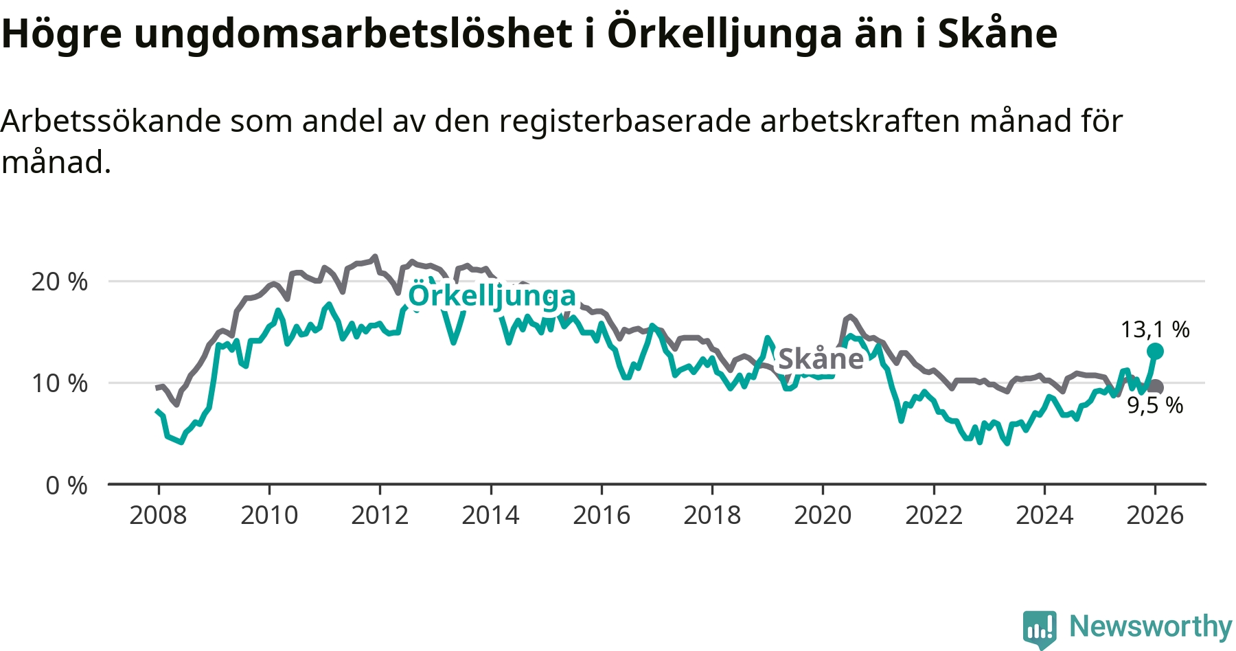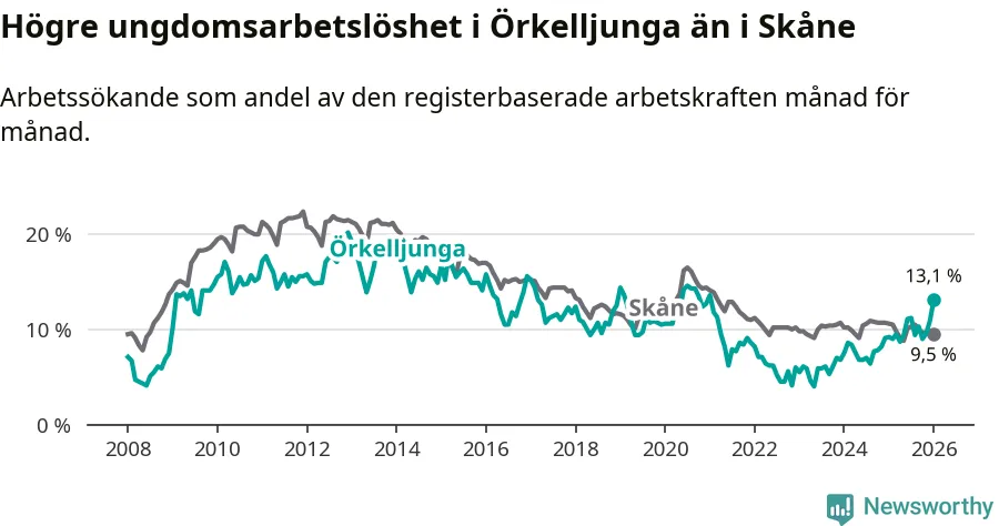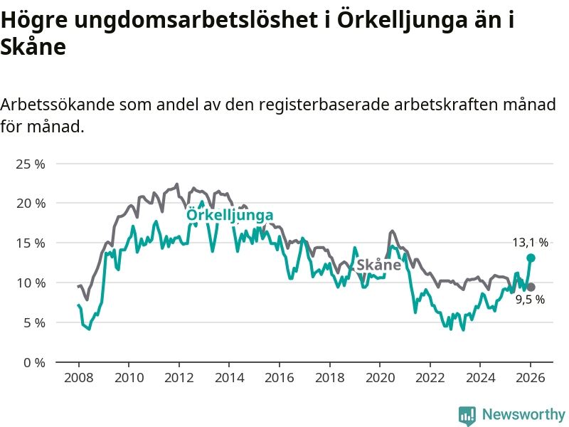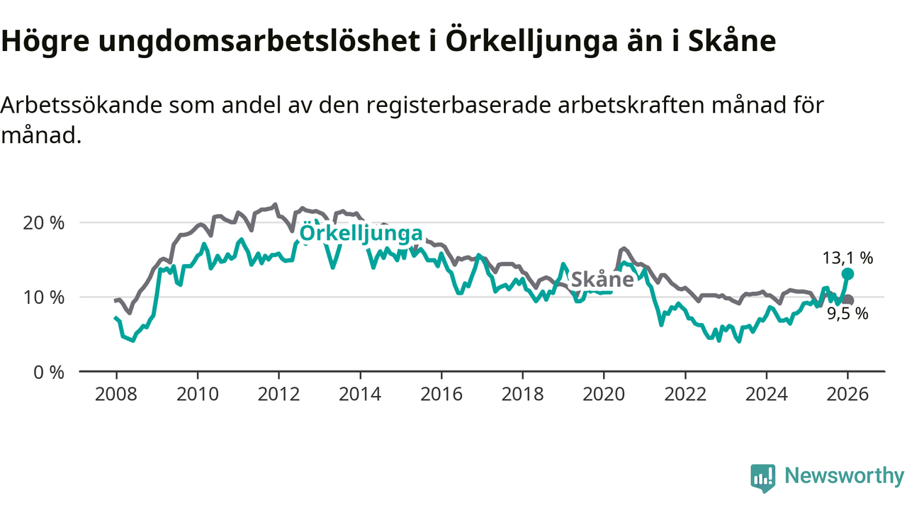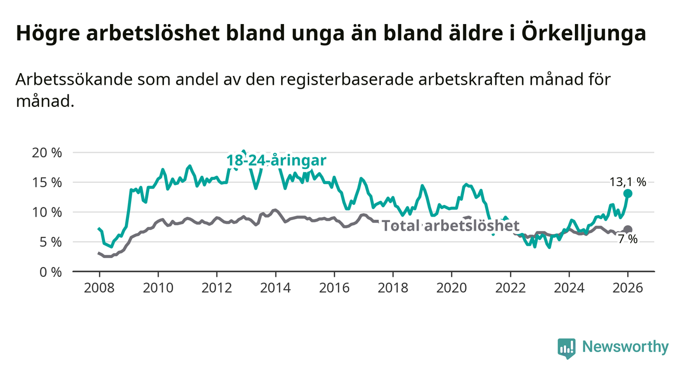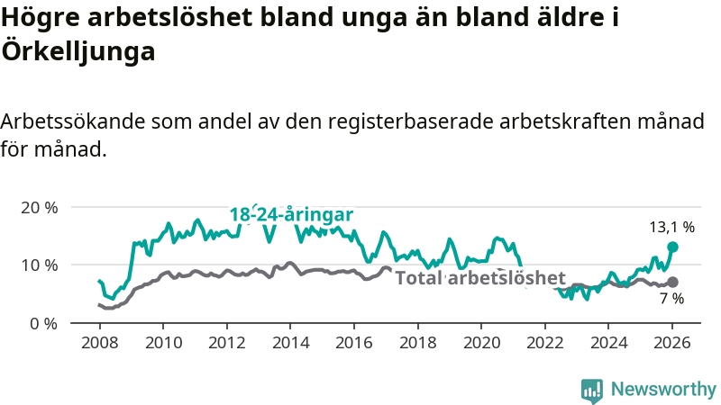 Den senaste månadsstatistiken från Arbetsförmedlingen visar på en uppgång i ungdoms­arbetslöshet i Örkelljunga kommun med 3,9 procentenheter. Arbetslösheten bland personer i åldern 18–24 år låg i januari på 13,1 procent.