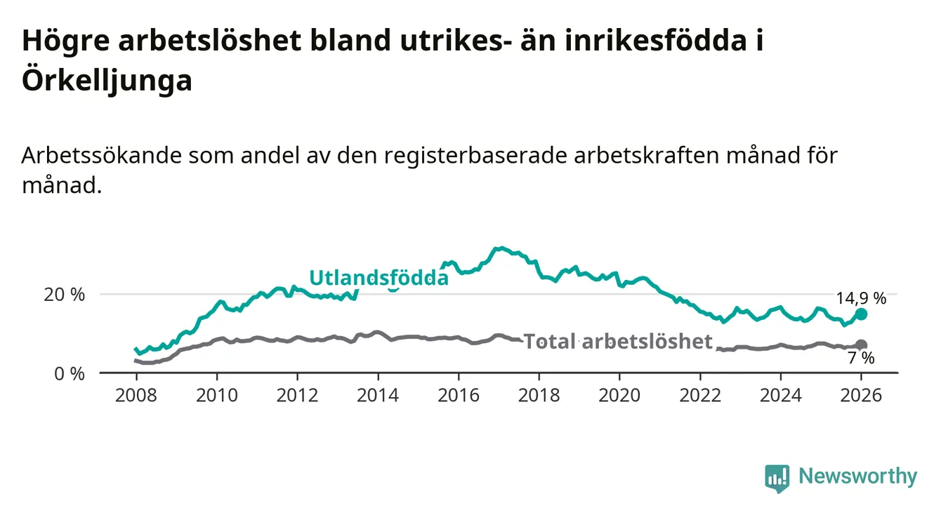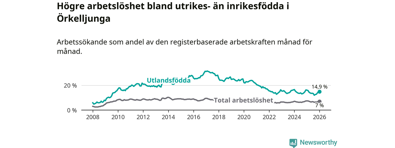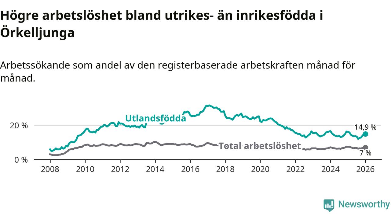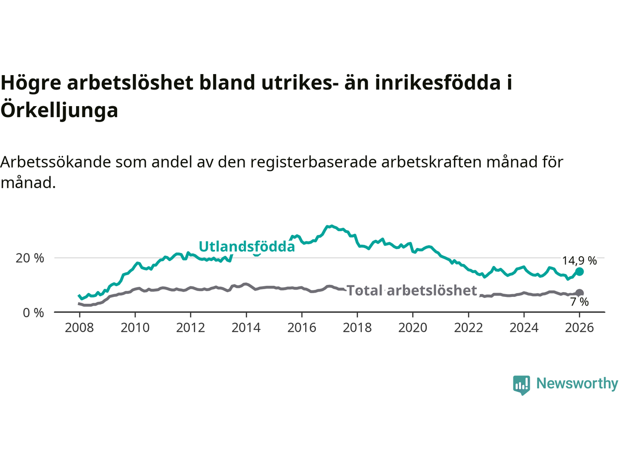 Arbetslösheten bland utlandsfödda var 14,9 procent i Örkelljunga under januari månad, motsvarande 149 av 1 000 personer. Det är 1,2 procentenheter färre än vid samma tidpunkt i fjol (−15 om man räknar personer). Därmed är de utlandsföddas arbetslöshet lägre än vid samma tidpunkt i fjol för sjunde månaden i följd. Sedan juni 2025 har arbetslösheten bland utlandsfödda minskat från 13,6 till 14,9 procent.