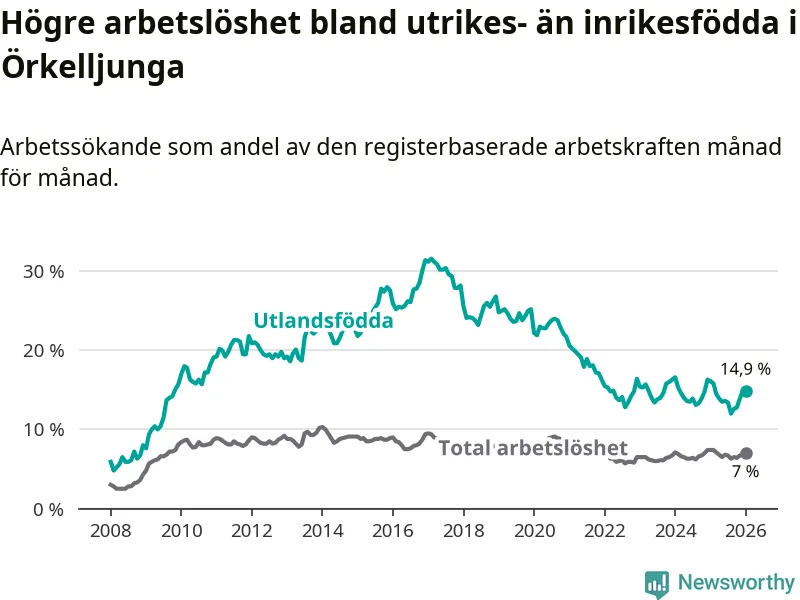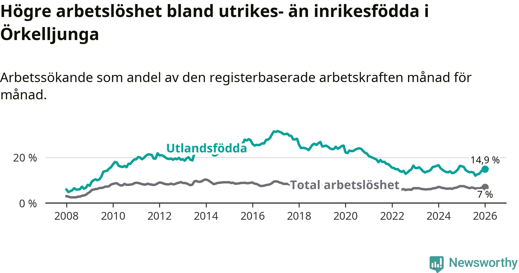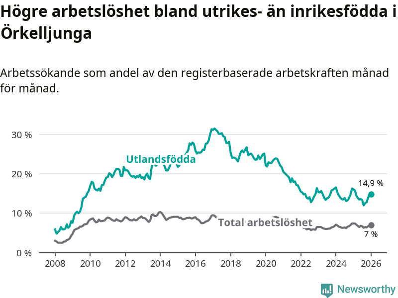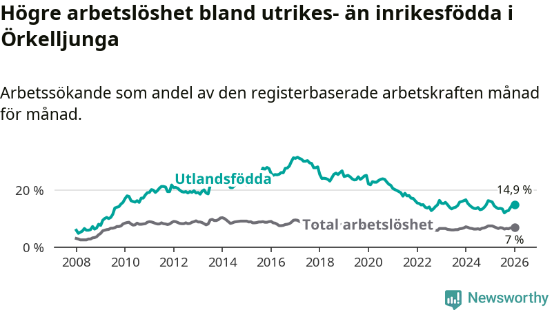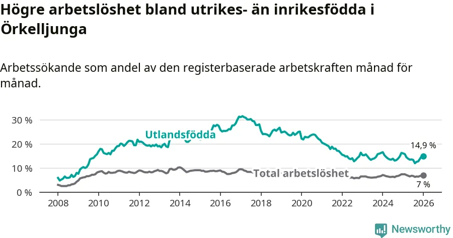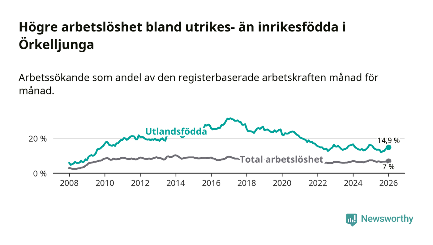 Arbetslösheten bland utlandsfödda var 14,9 procent i Örkelljunga under januari månad, motsvarande 149 av 1 000 personer. Det är 1,2 procentenheter färre än vid samma tidpunkt i fjol (−15 om man räknar personer). Därmed är de utlandsföddas arbetslöshet lägre än vid samma tidpunkt i fjol för sjunde månaden i följd. Sedan juni 2025 har arbetslösheten bland utlandsfödda minskat från 13,6 till 14,9 procent.