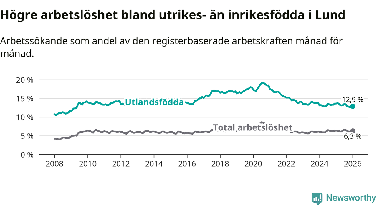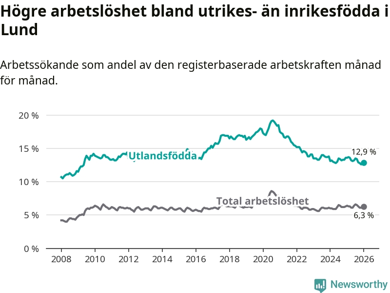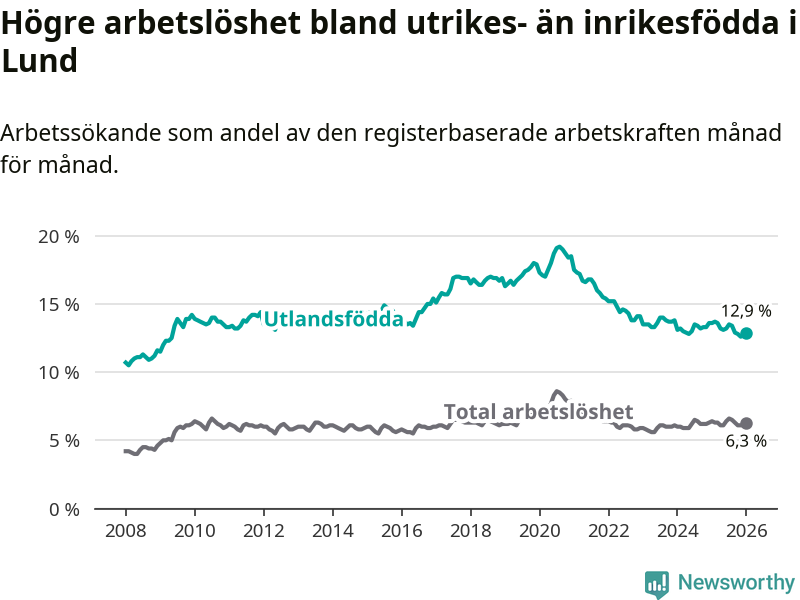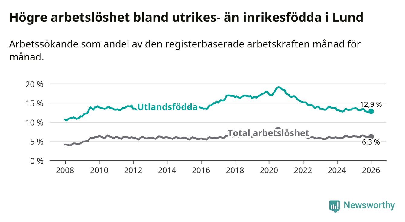 Arbetslösheten bland utlandsfödda var 12,9 procent i Lund under januari månad, motsvarande 2 121 av 16 442 personer. Det är 0,7 procentenheter färre än vid samma tidpunkt i fjol (−73 om man räknar personer).