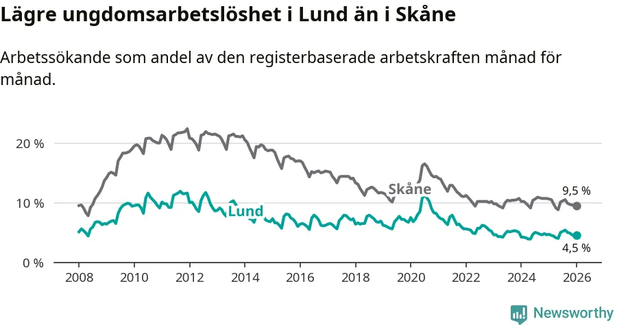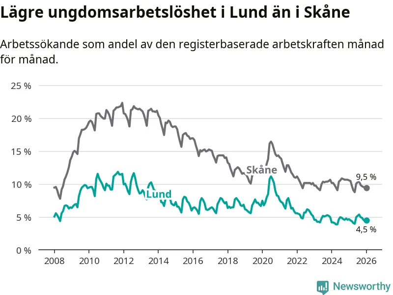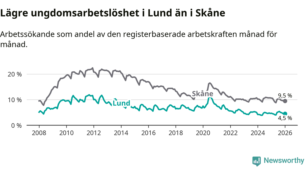 Precis som den totala arbetslösheten ligger ungdomsarbetslösheten i Lund lägre än i Skåne som helhet. Skillnaden mellan kommunen och länet är 5,0 procentenheter.