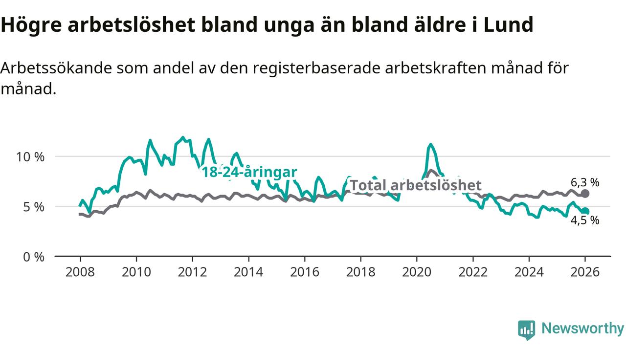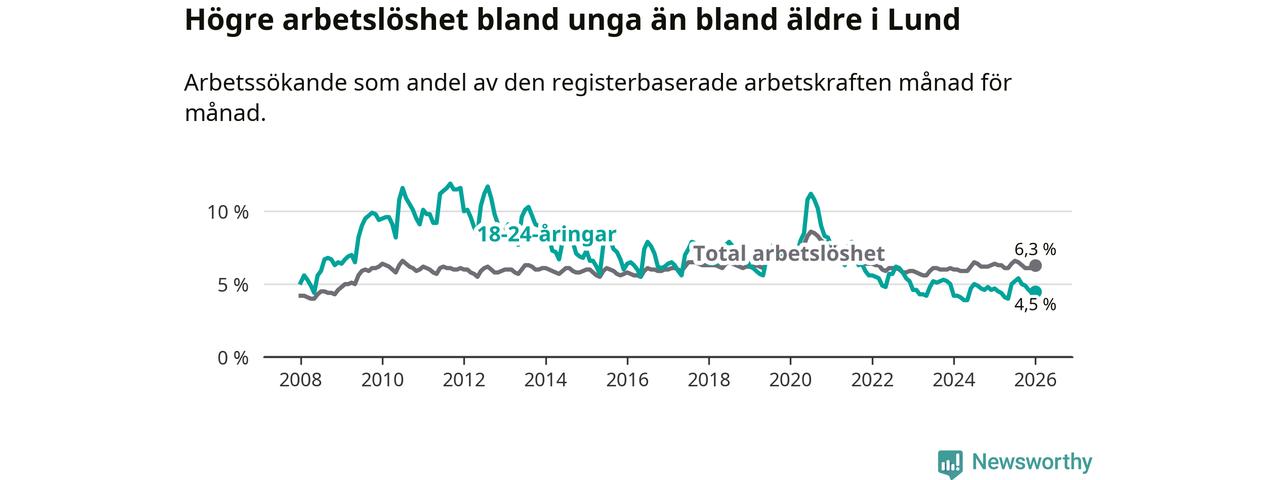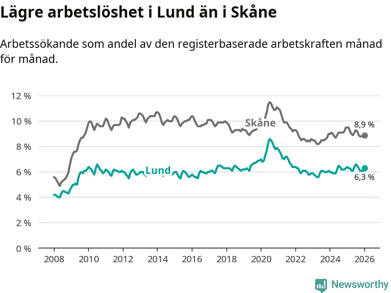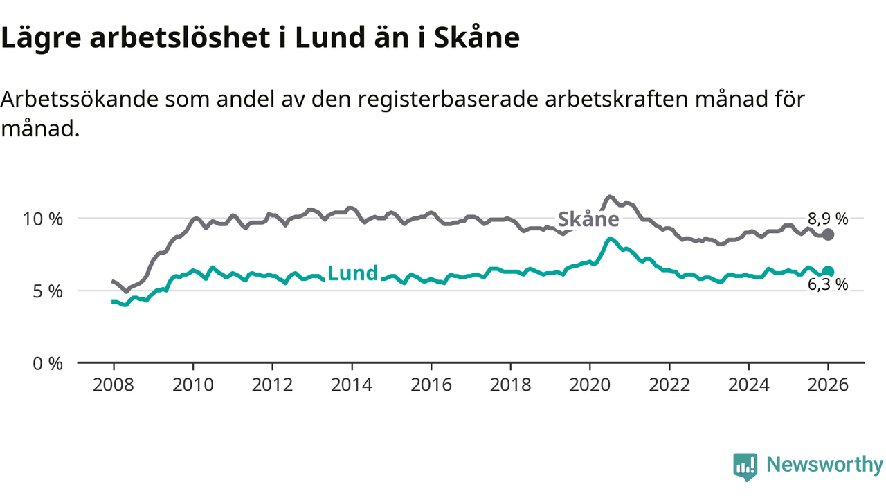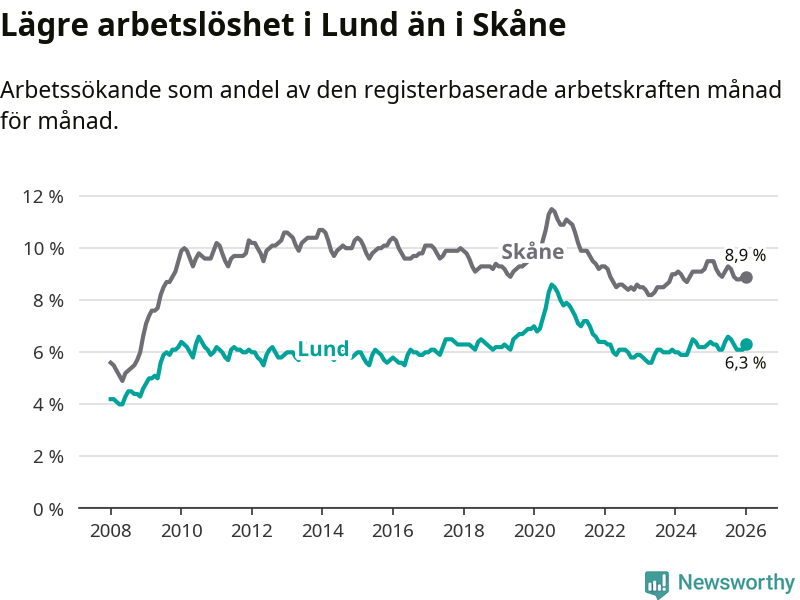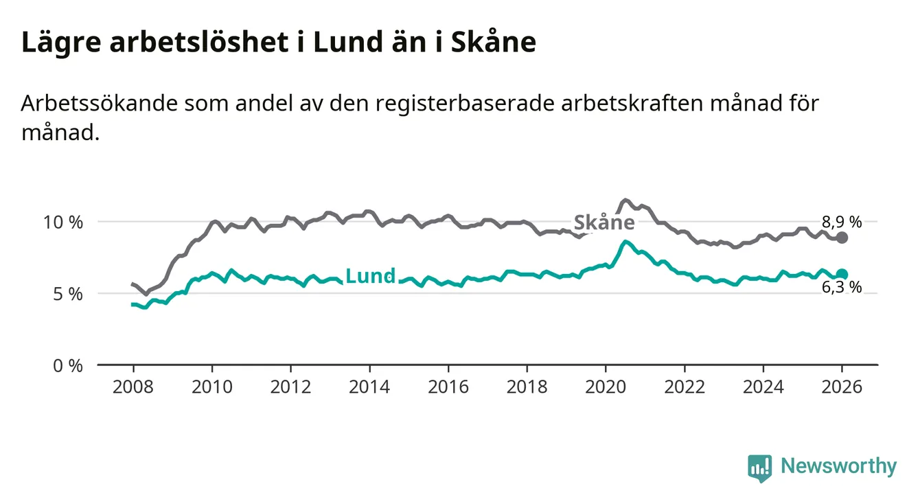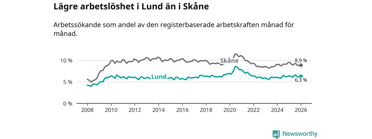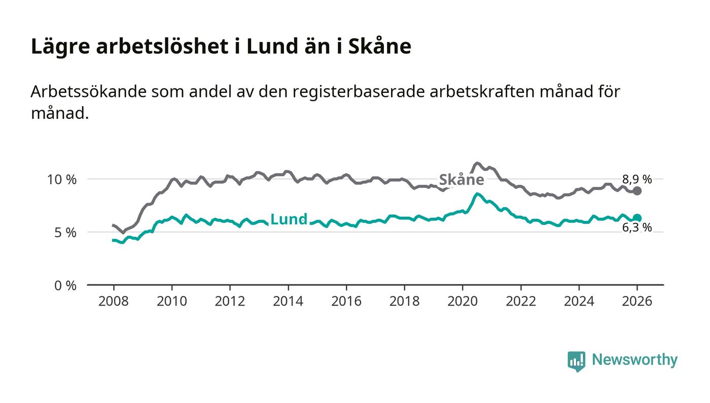 Under januari månad rapporterade Lunds kommun en total arbetslöshet på 6,3 procent. Det är en minskning jämfört med samma tidpunkt i fjol (−0,1 procentenheter). Även i Skåne län sjunker arbetslösheten .