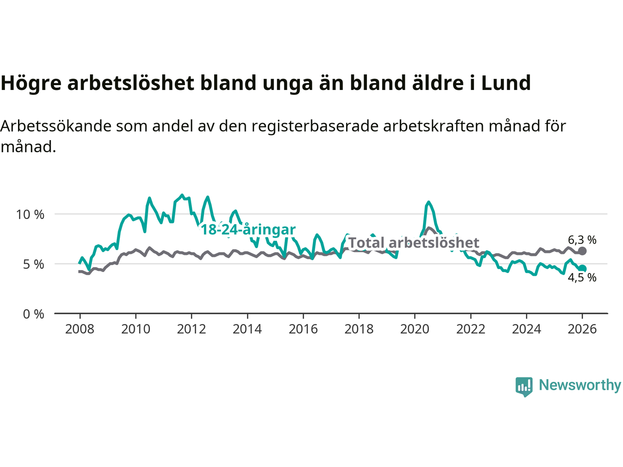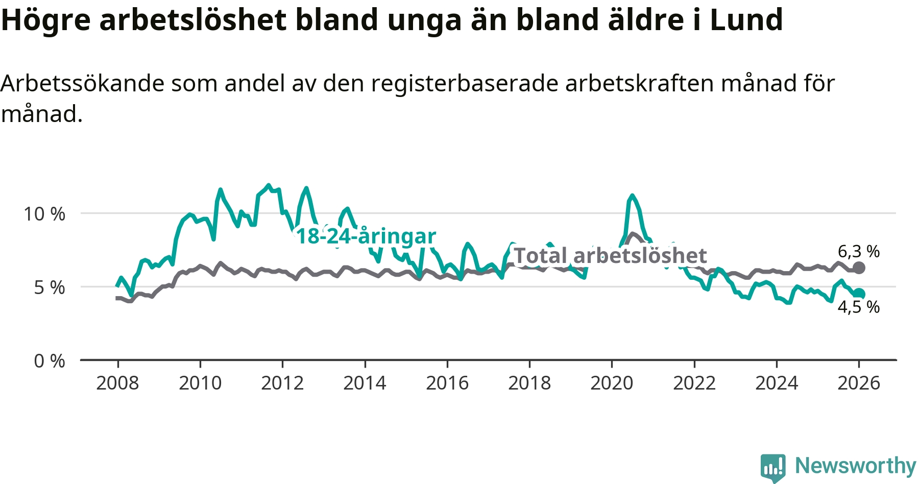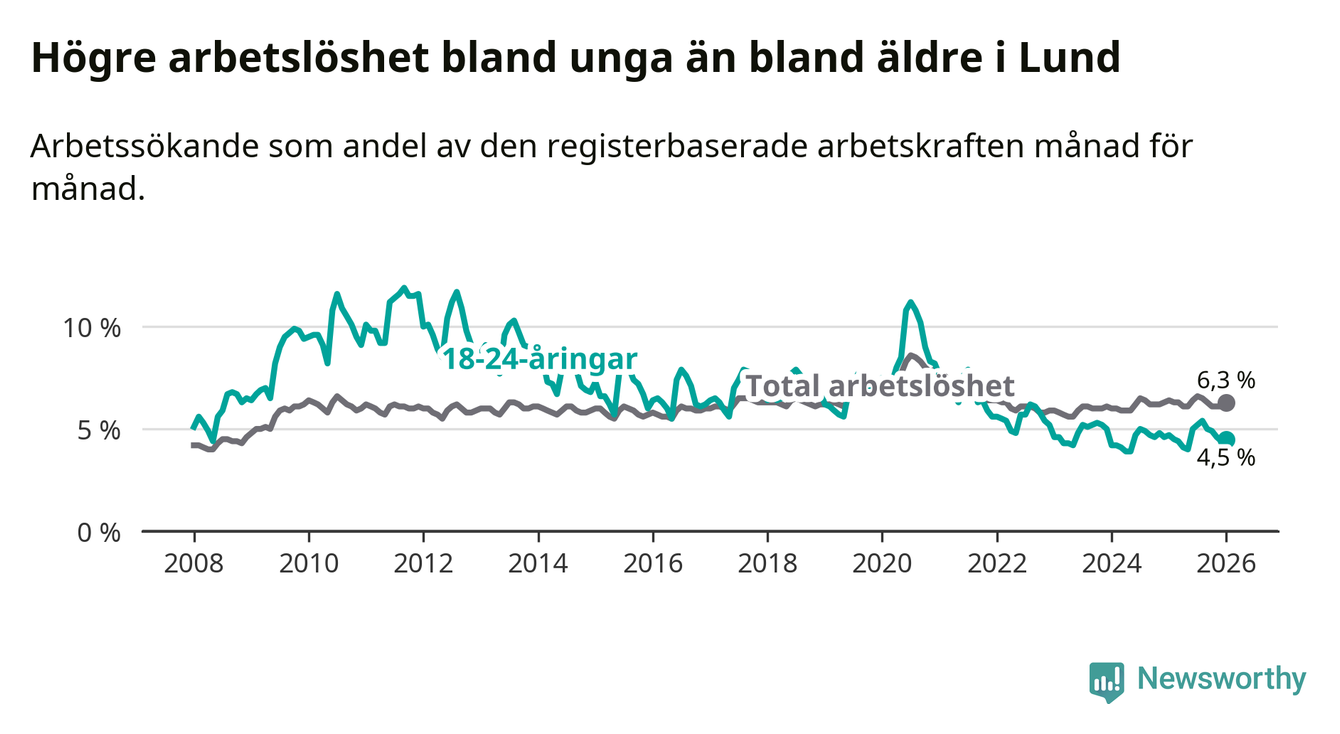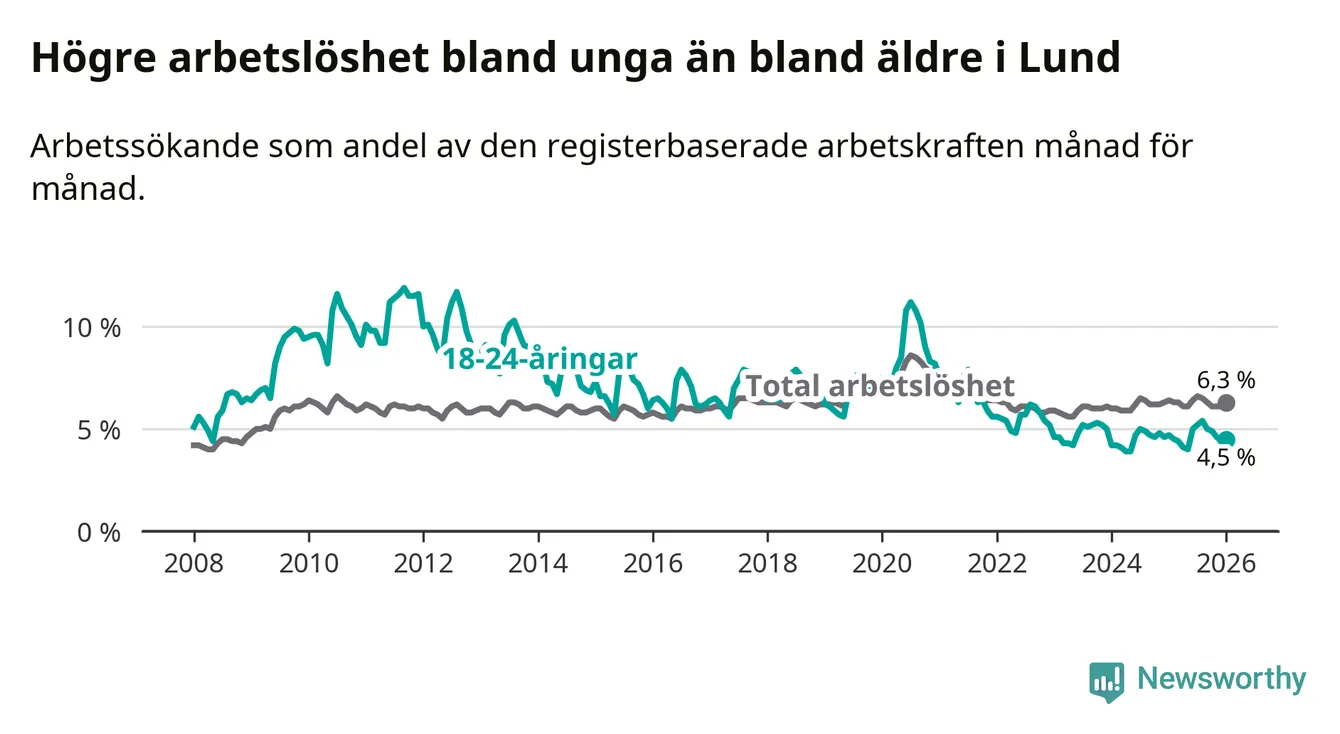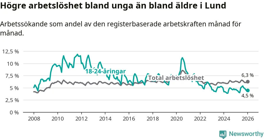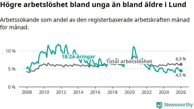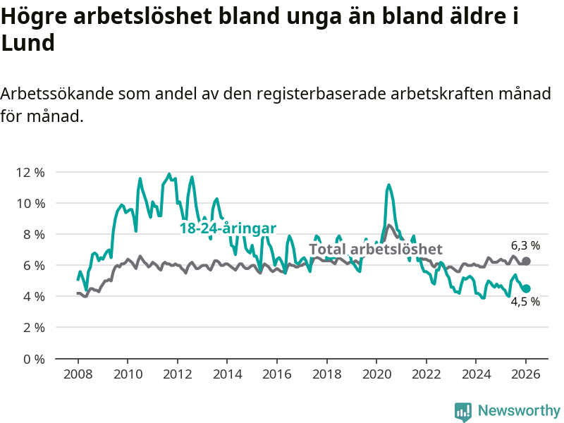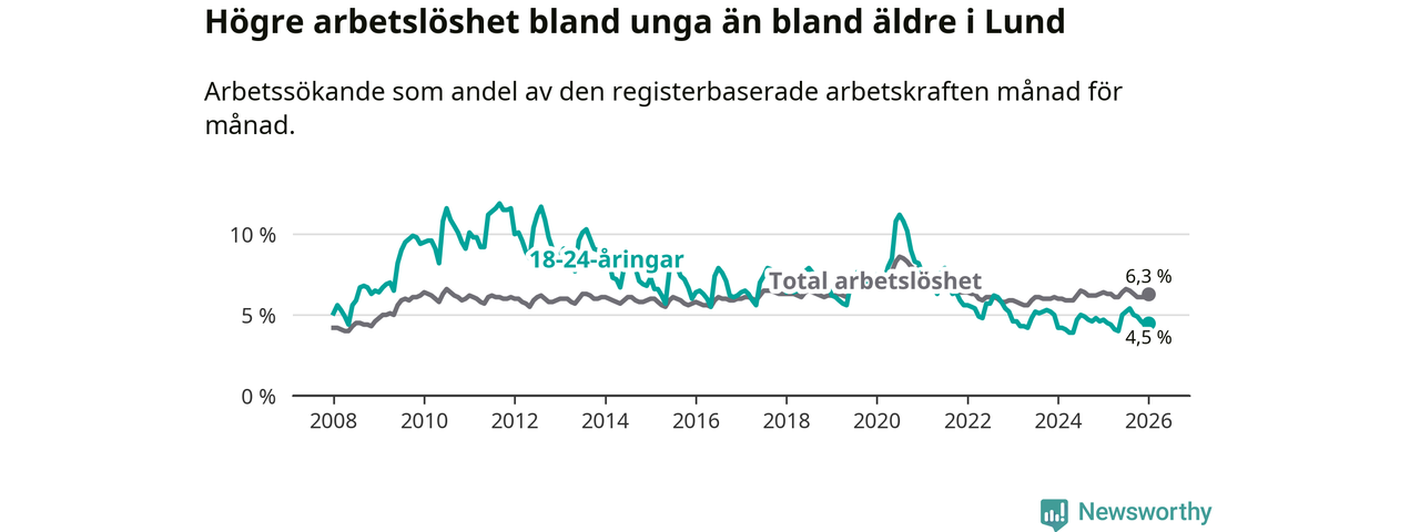 Under januari månad rapporterade Lunds kommun en total arbetslöshet på 6,3 procent. Det är en minskning jämfört med samma tidpunkt i fjol (−0,1 procentenheter). Även i Skåne län sjunker arbetslösheten .