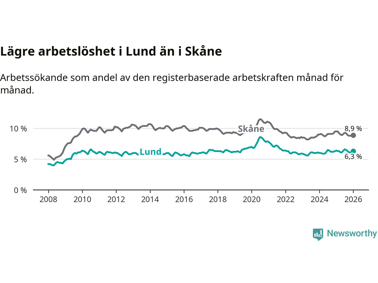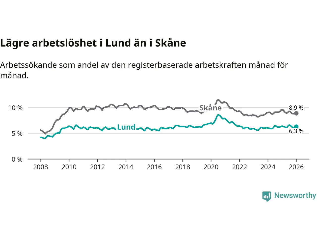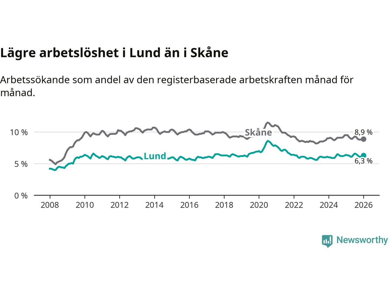 Lund hade redan tidigare lägre arbetslöshet än snittet i hela Skåne län och nu växer klyftan (6,3 procent i kommunen, jämfört med 8,9 procent i hela länet). Lomma har den lägsta arbetslösheten i länet (3,9 procent), medan Perstorp har den högsta (13,4 procent). För att Lund skulle komma ner i samma arbetslöshetsnivå som Lomma skulle 1 493 personer behöva sysselsättas.