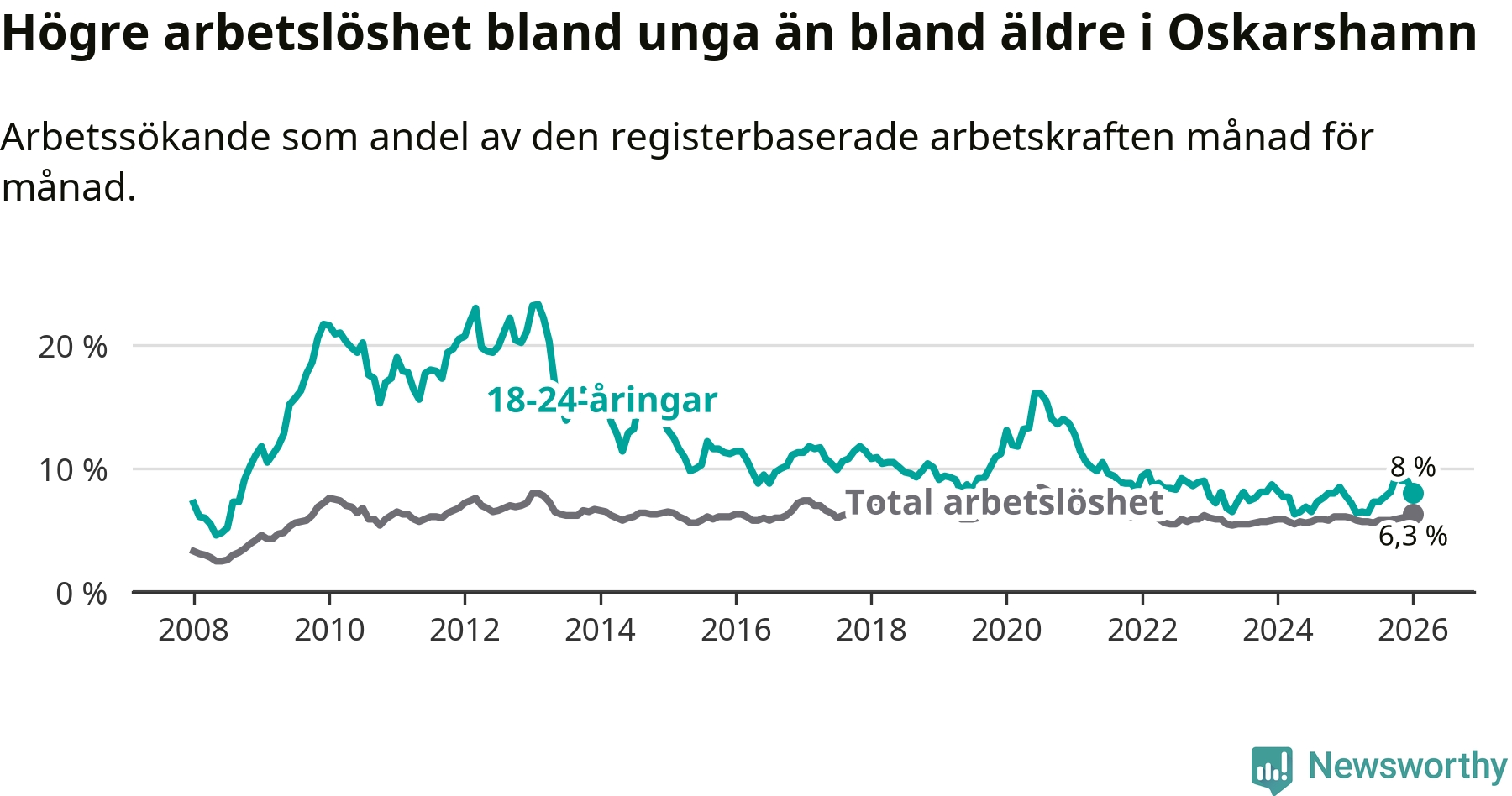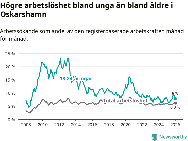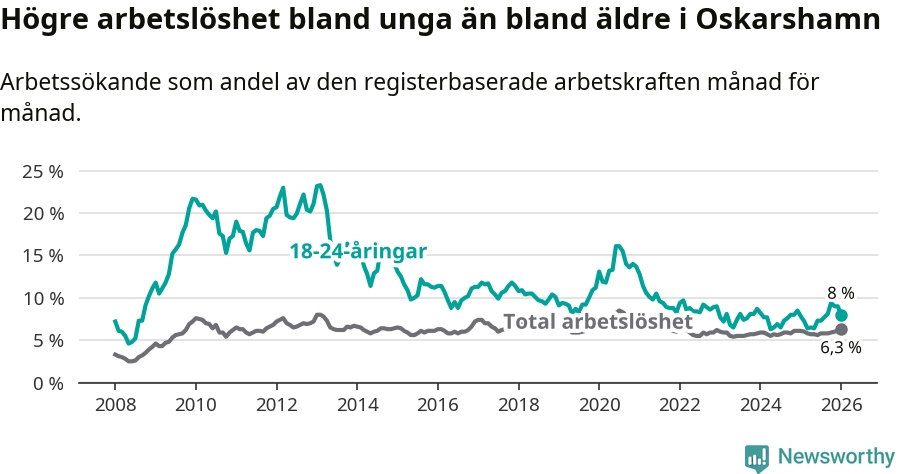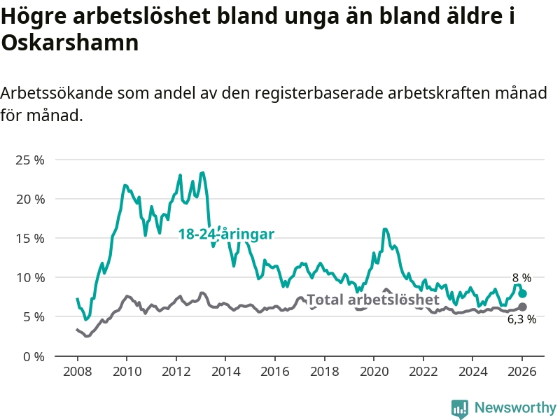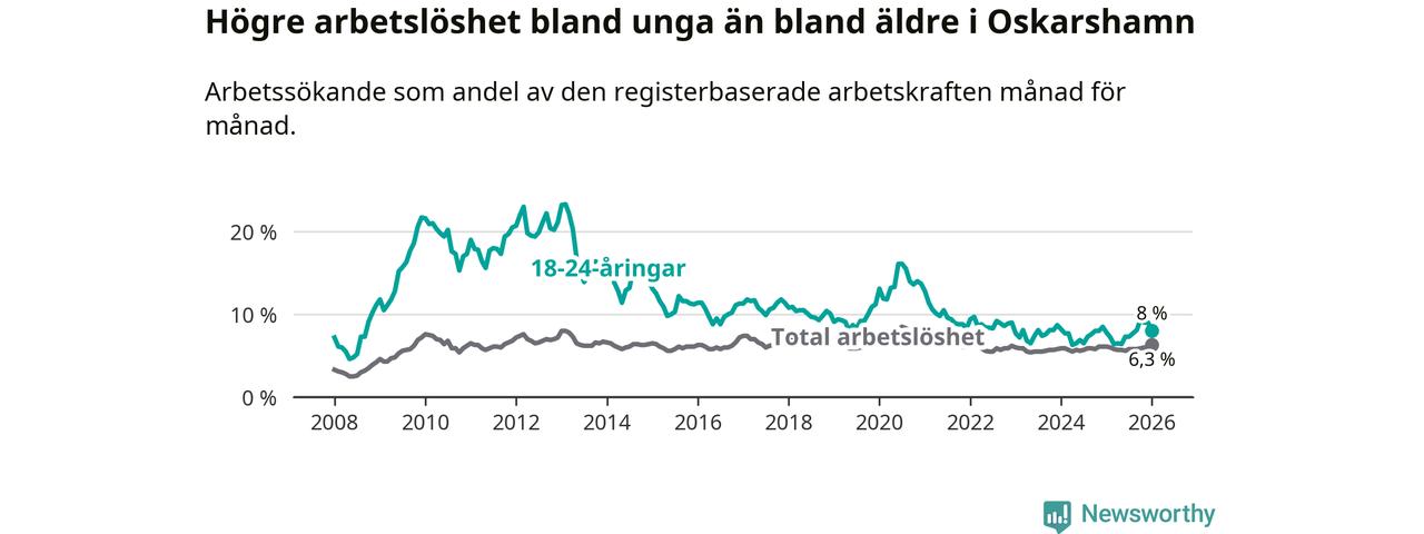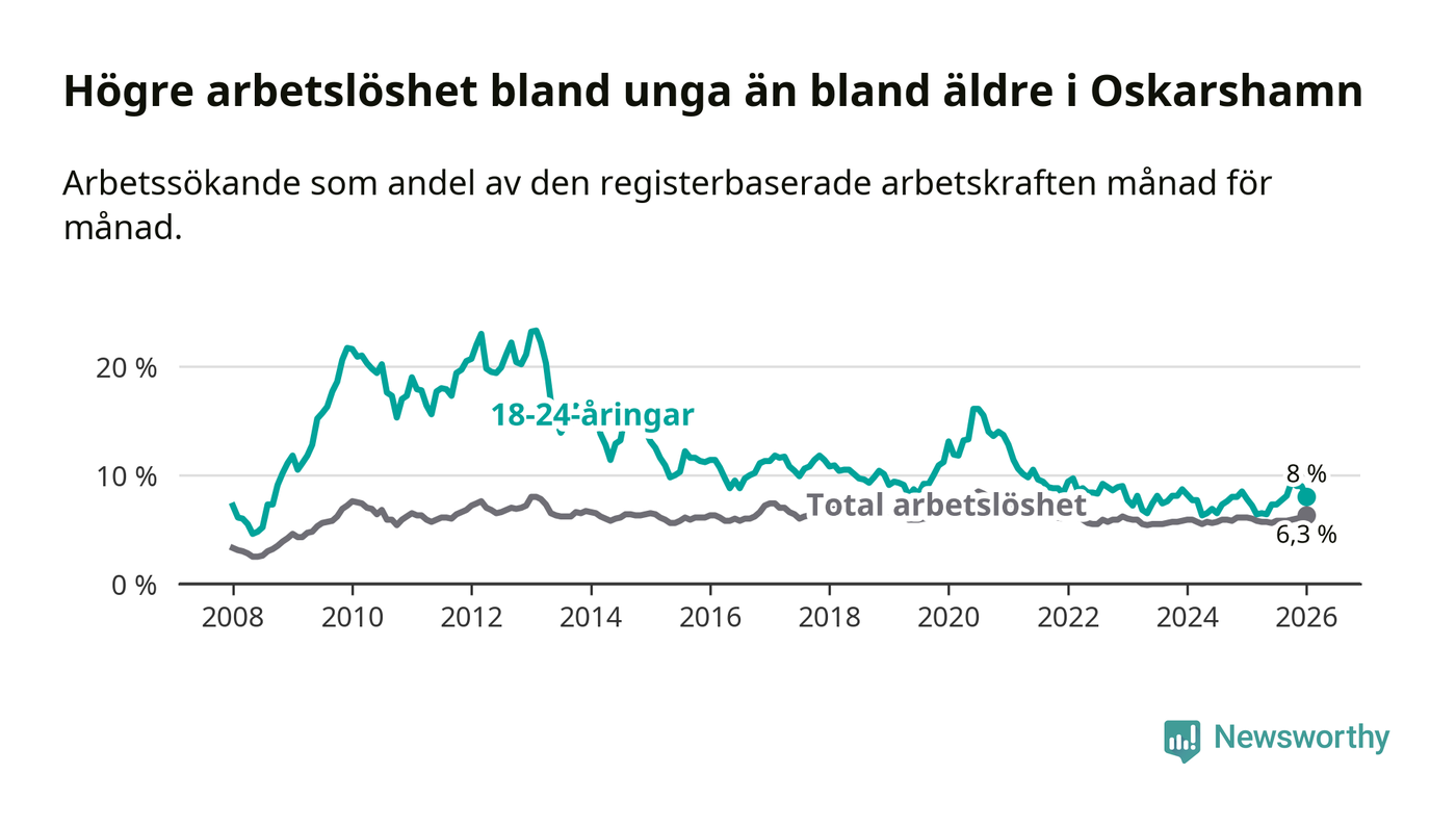 I och med den senaste månadens uppgång har de ungas arbetslöshet i Oskarshamn stigit åtta månader i följd (upp från 6,4 procent i maj 2025 till 8,0 procent nu).