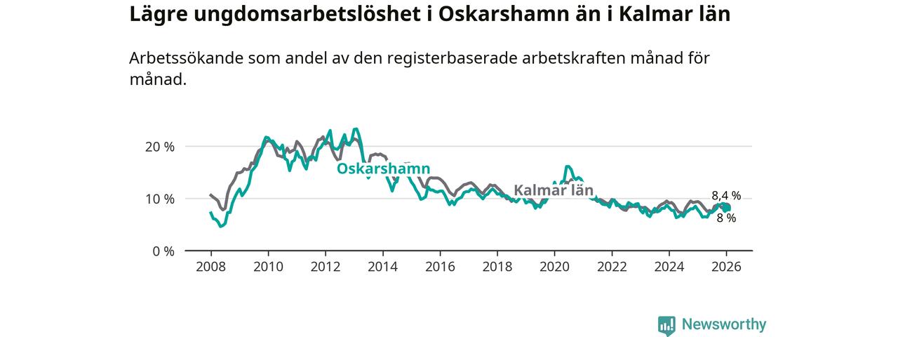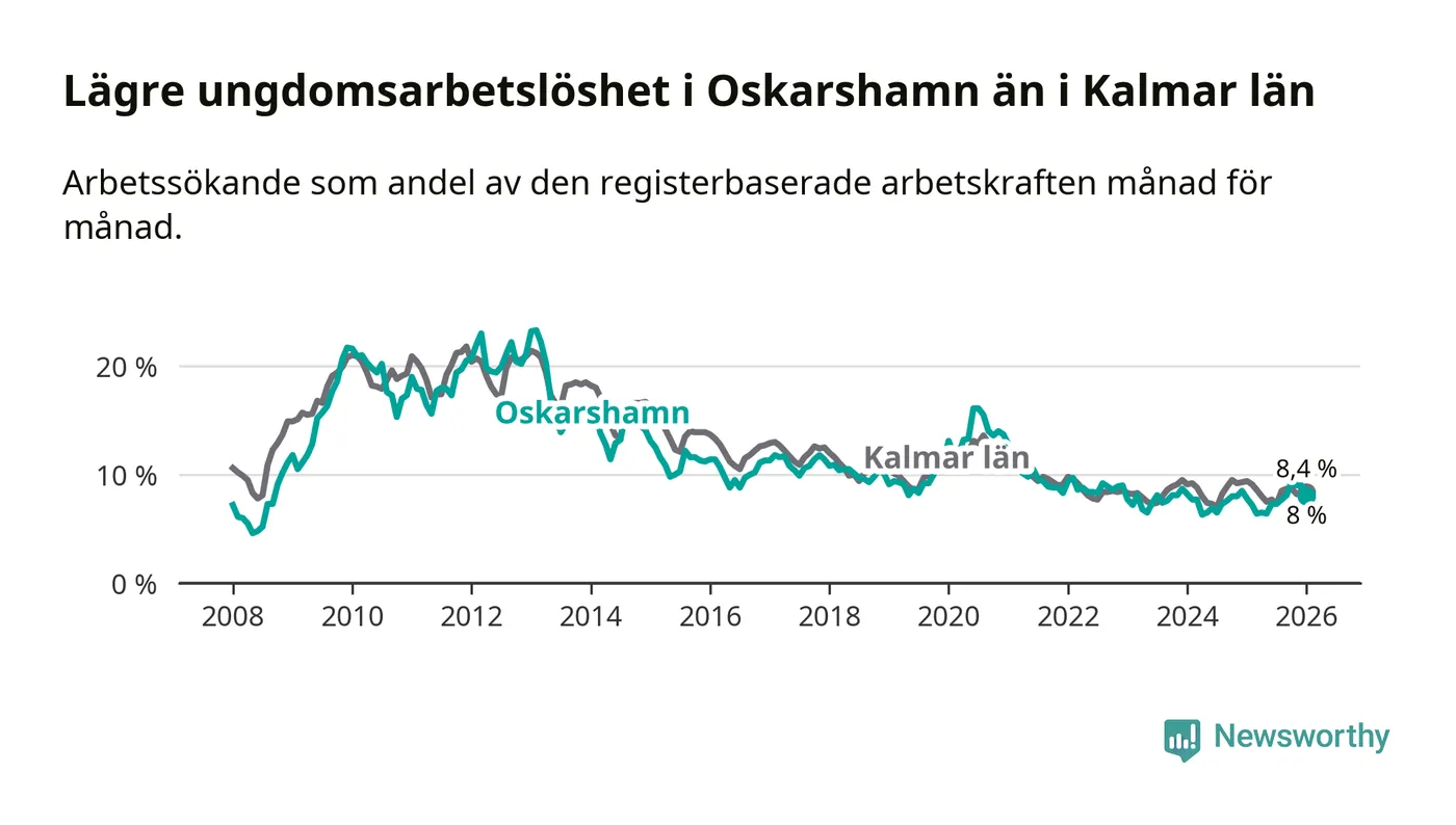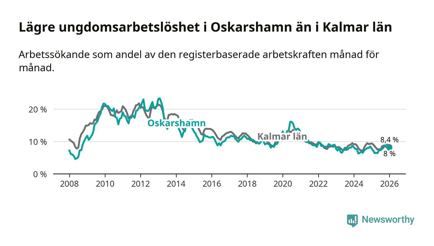 Medan Oskarshamn har ungefär samma total arbetslöshet som Kalmar län, ligger ungdomsarbetslösheten 0,4 procentenheter lägre i Oskarshamn.