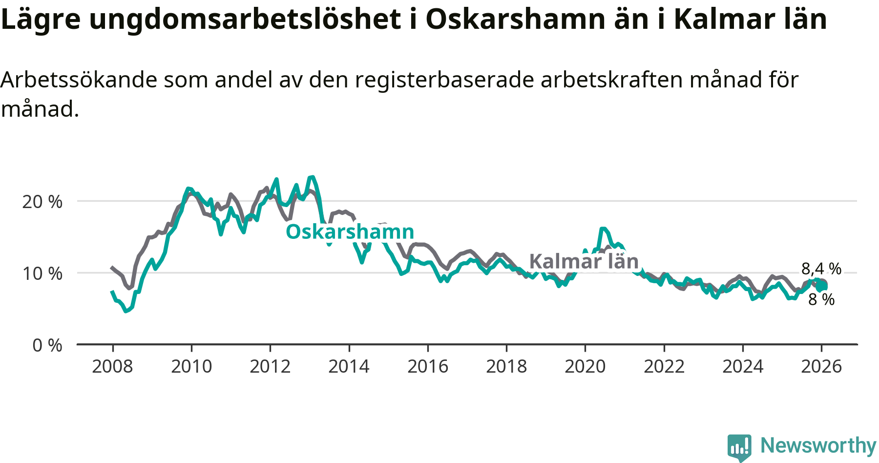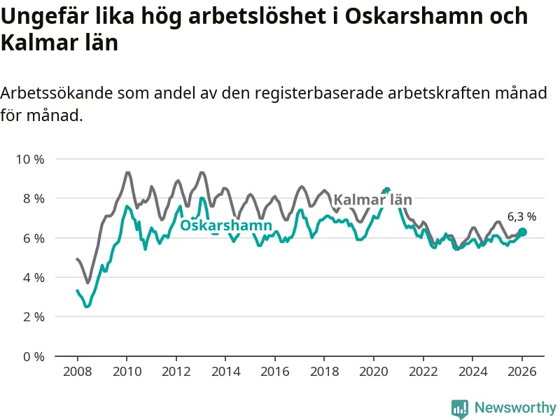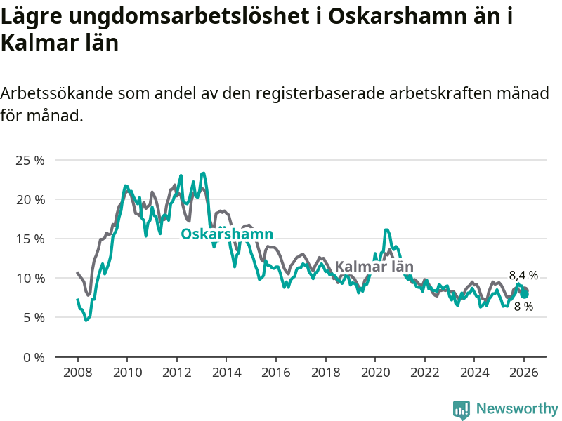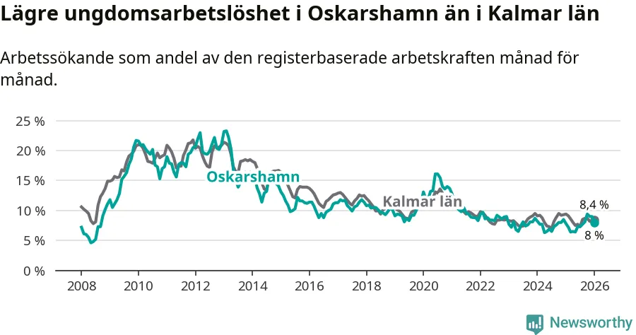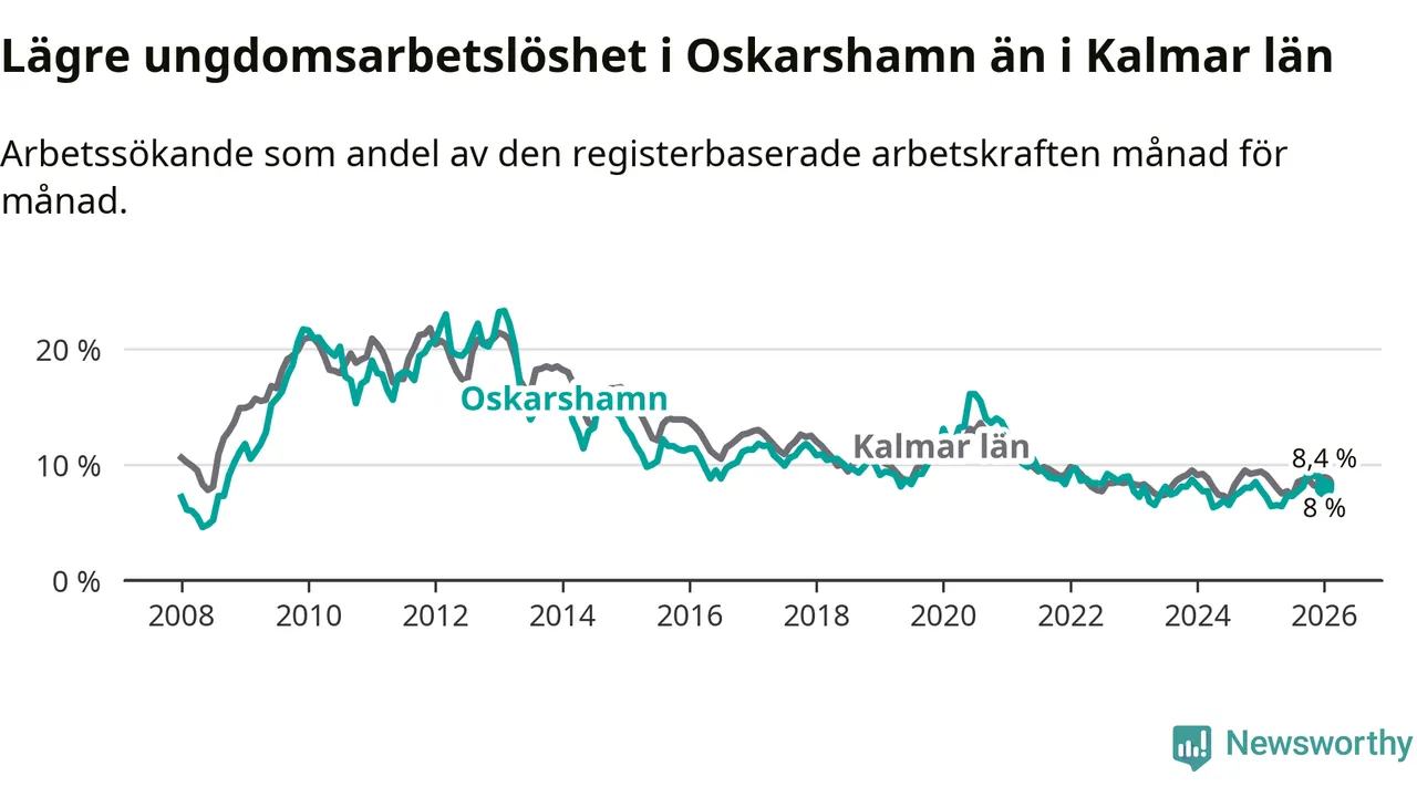 Medan Oskarshamn har ungefär samma total arbetslöshet som Kalmar län, ligger ungdomsarbetslösheten 0,4 procentenheter lägre i Oskarshamn.