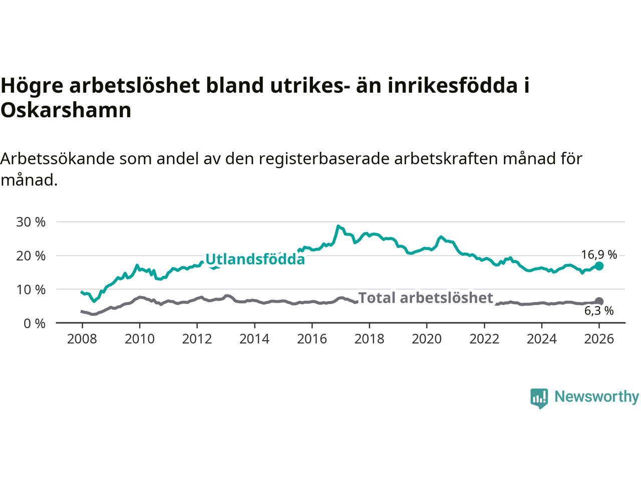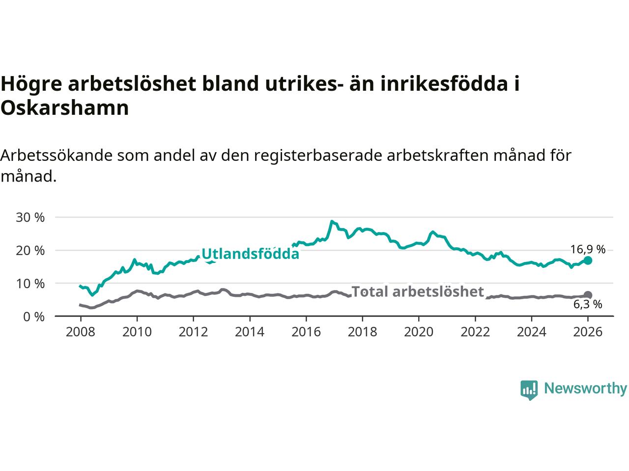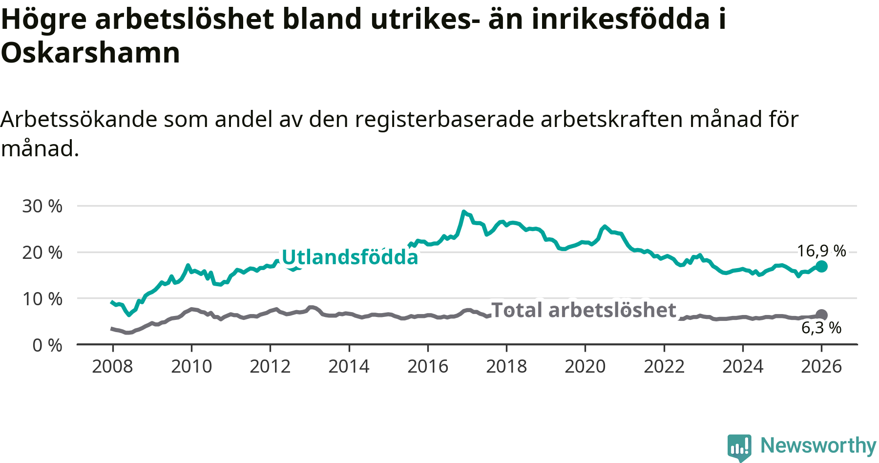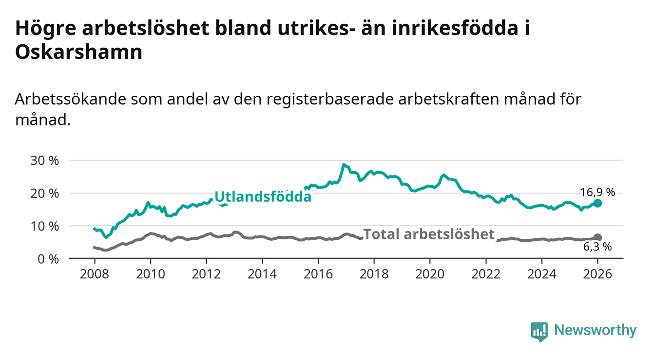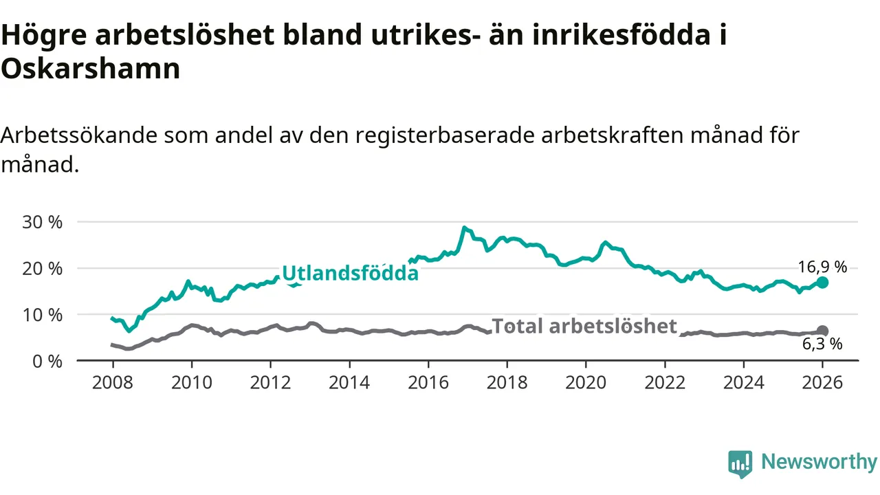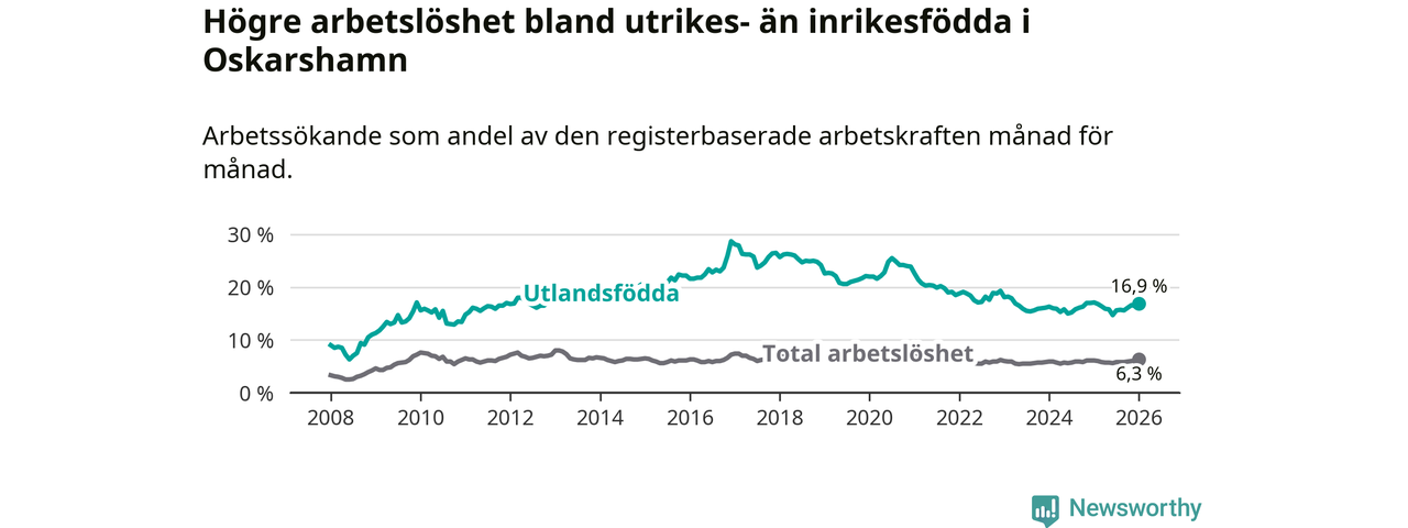 Arbetslösheten bland utlandsfödda var 16,9 procent i Oskarshamn under januari månad, motsvarande 431 av 2 550 personer. Det är 0,2 procentenheter färre än vid samma tidpunkt i fjol (−1 om man räknar personer). Därmed är de utlandsföddas arbetslöshet lägre än vid samma tidpunkt i fjol för sjätte månaden i följd. Sedan juli 2025 har arbetslösheten bland utlandsfödda minskat från 15,6 till 16,9 procent.