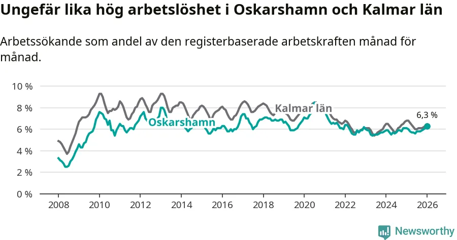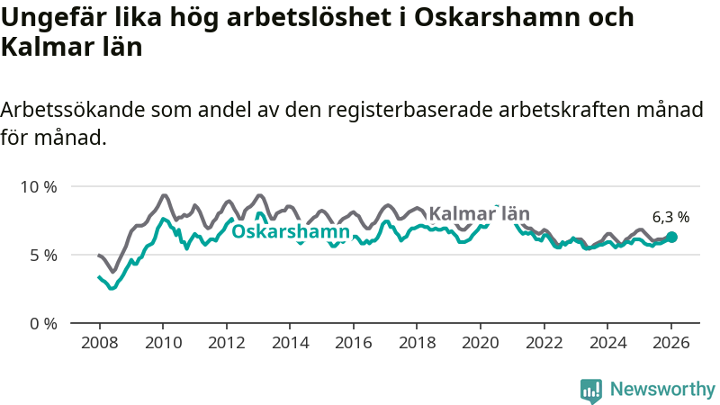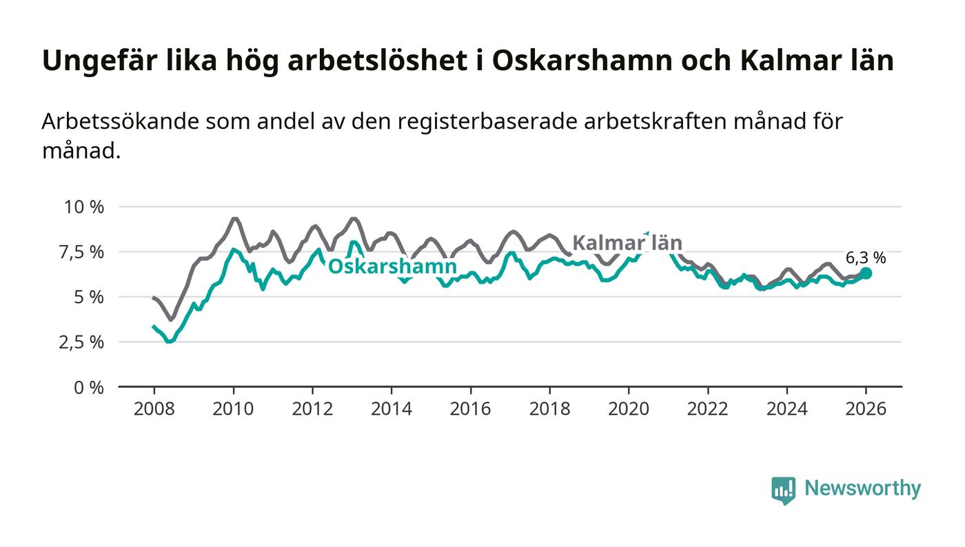 Den ökande arbetslösheten gör att Oskarshamn nu har i stort sett samma arbetslöshetsnivå som hela Kalmar län. Mörbylånga har den lägsta arbetslösheten i länet (3,8 procent), medan Högsby har den högsta (8,3 procent). För att Oskarshamn skulle komma ner i samma arbetslöshetsnivå som Mörbylånga skulle 329 personer behöva sysselsättas.