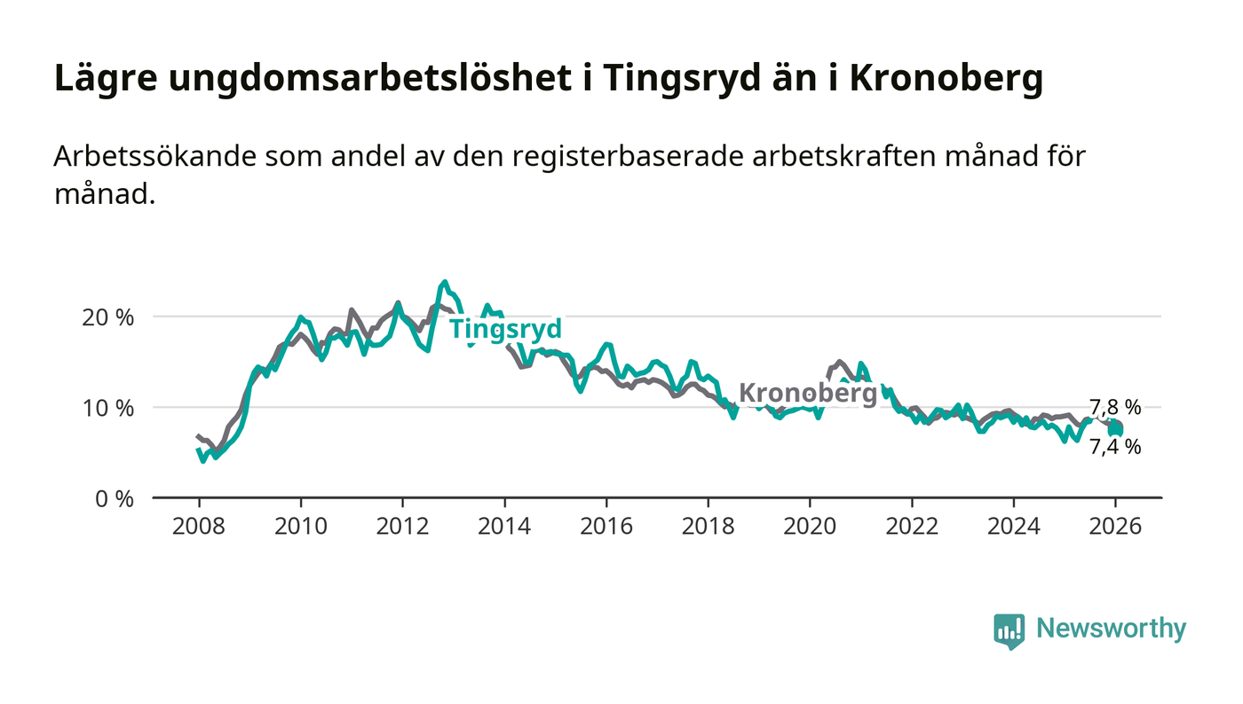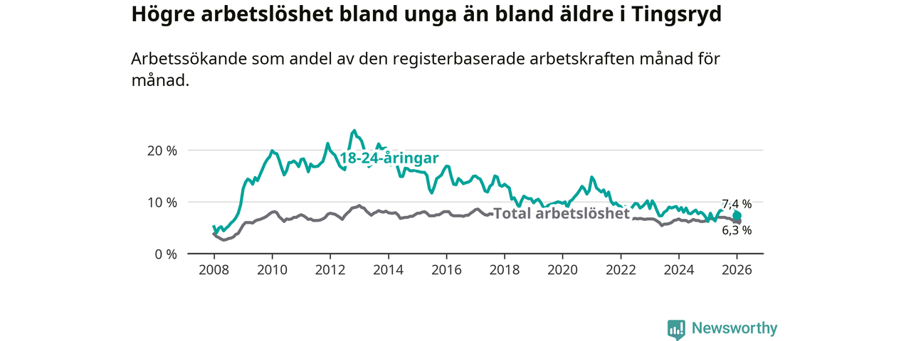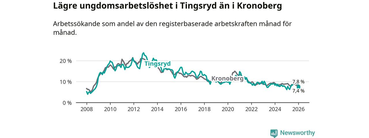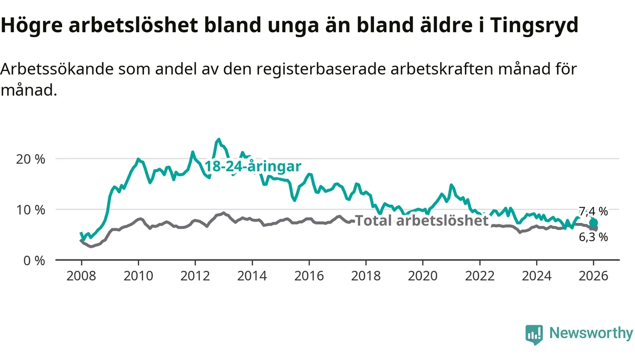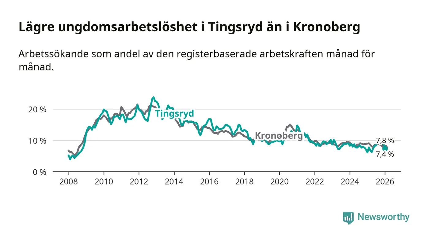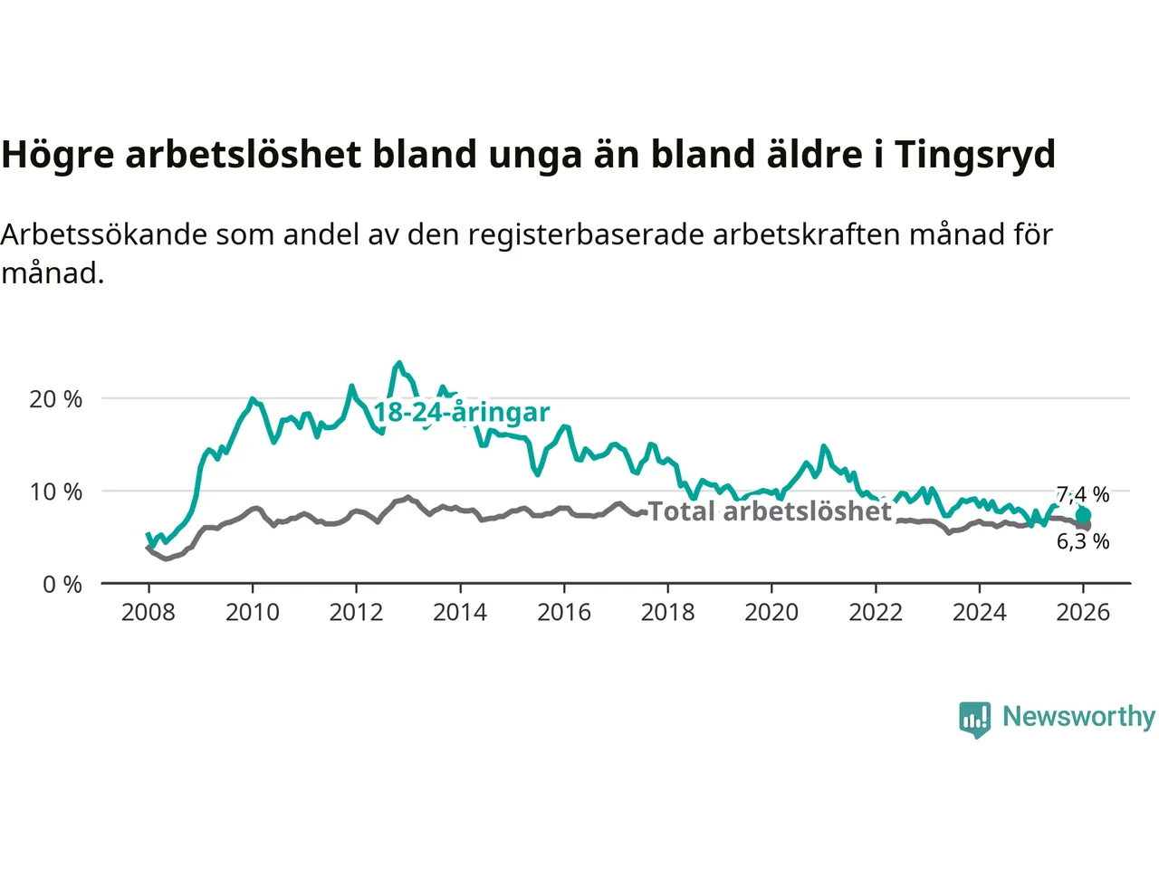 I och med den senaste månadens uppgång har de ungas arbetslöshet i Tingsryd stigit åtta månader i följd (upp från 7,5 procent i maj 2025 till 7,4 procent nu).