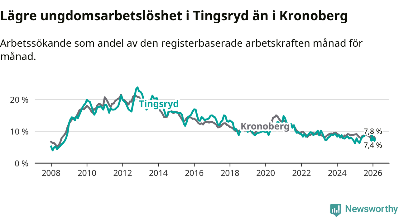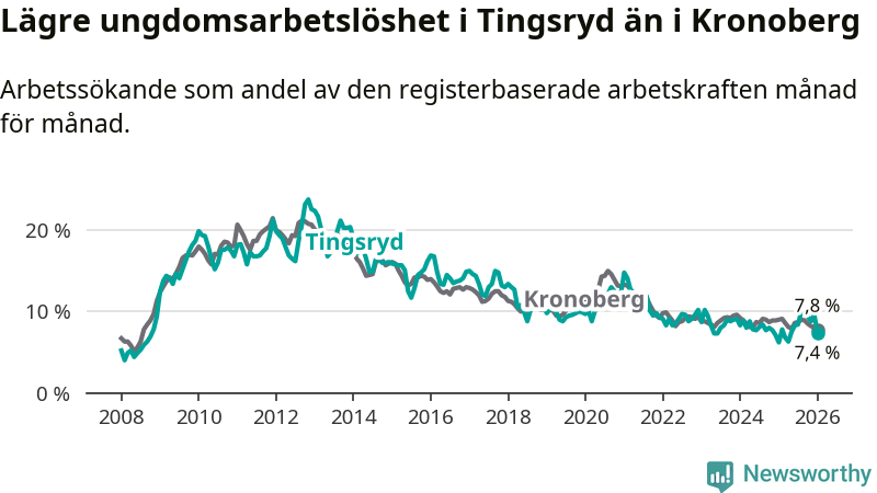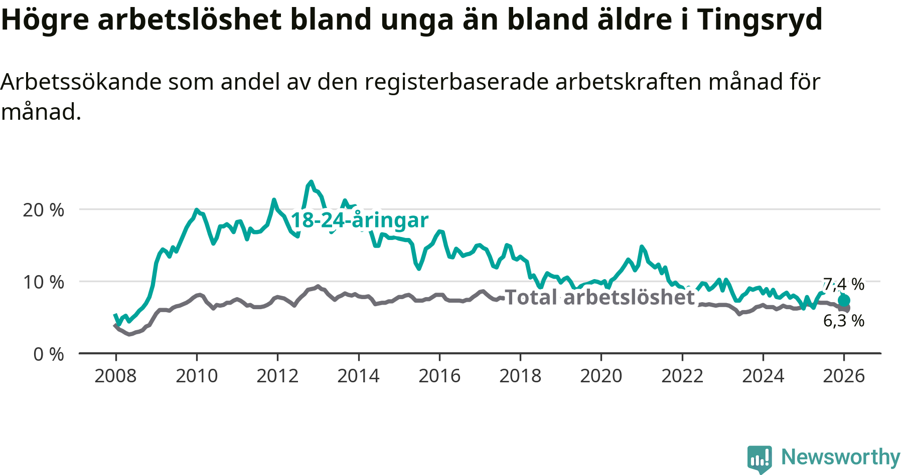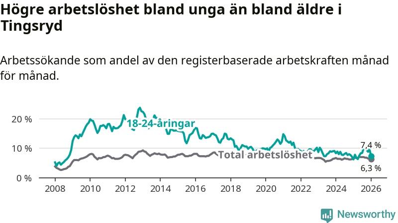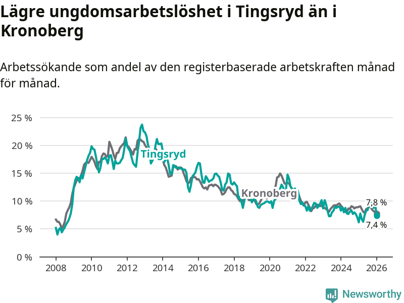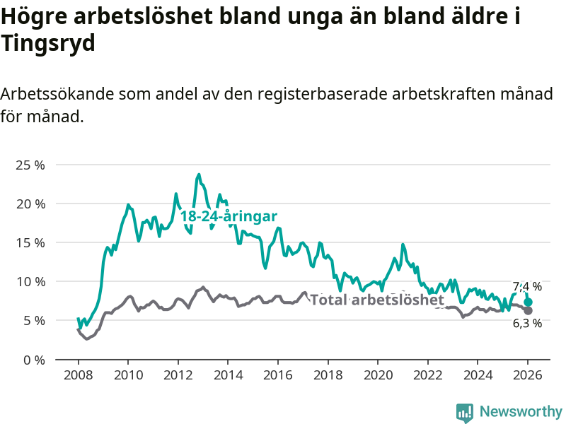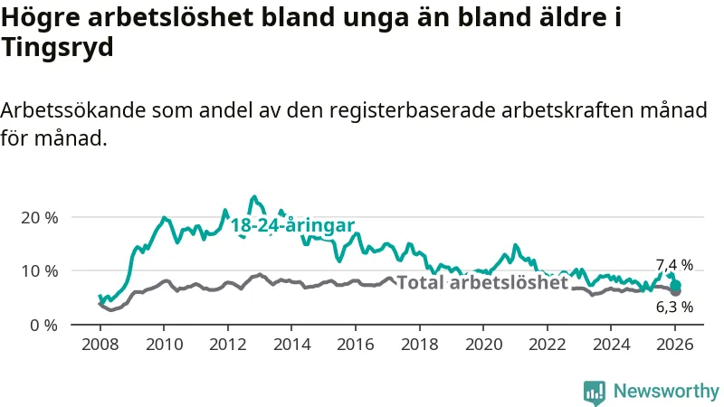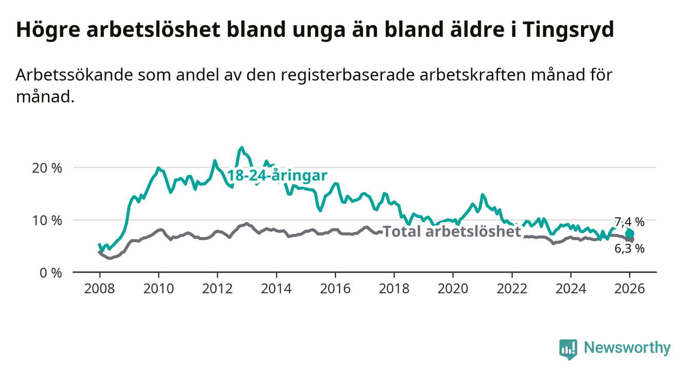 I och med den senaste månadens uppgång har de ungas arbetslöshet i Tingsryd stigit åtta månader i följd (upp från 7,5 procent i maj 2025 till 7,4 procent nu).
