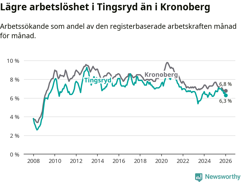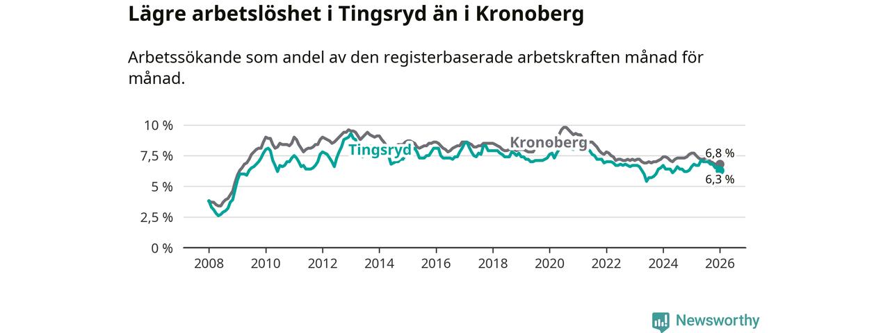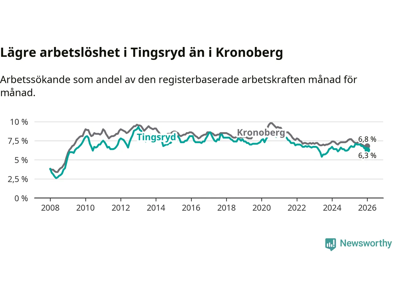 Under januari månad rapporterade Tingsryds kommun en total arbetslöshet på 6,3 procent. Det är en minskning jämfört med samma tidpunkt i fjol (−0,3 procentenheter). Även i Kronobergs län sjunker arbetslösheten .