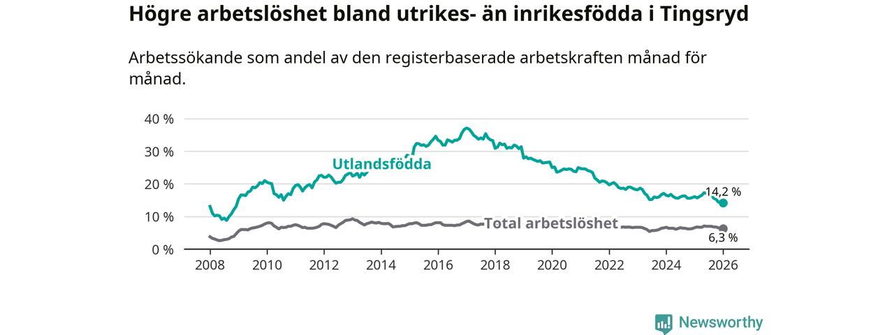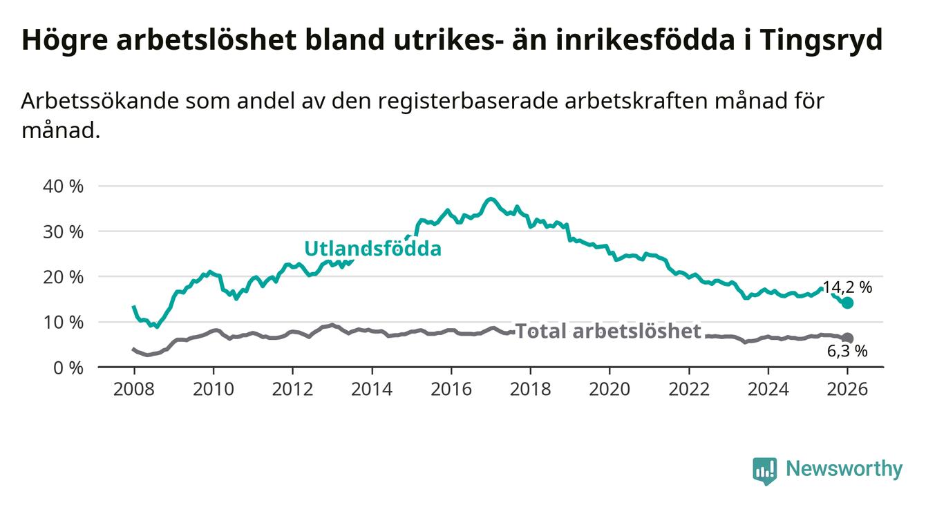 Skillnaden i arbetslöshet mellan utrikesfödda och hela befolkningen är 7,9 procentenheter i Tingsryd. Det är en betydligt mindre skillnad än för ett år sedan (−1,6 procentenheter).
